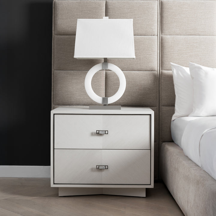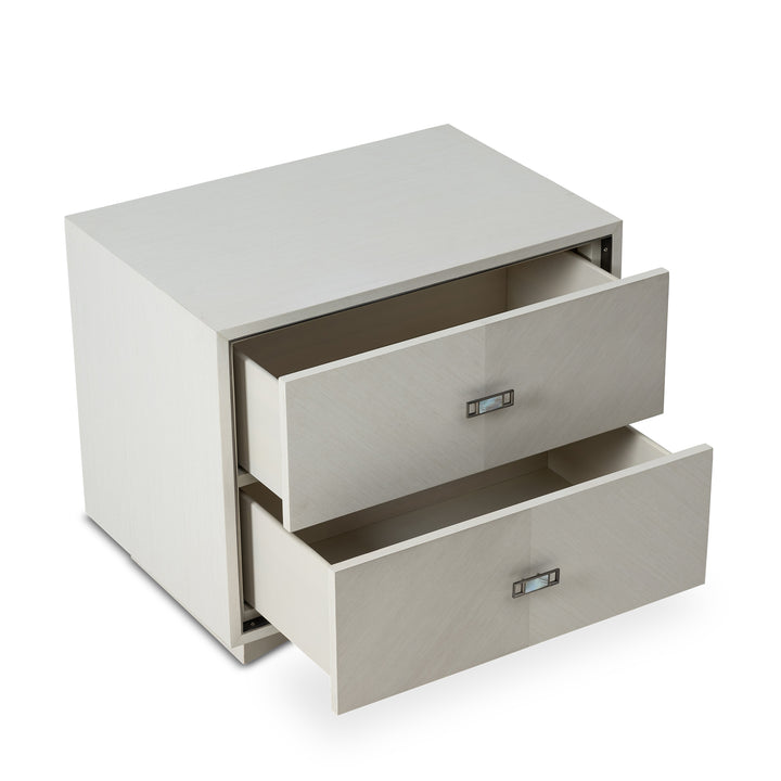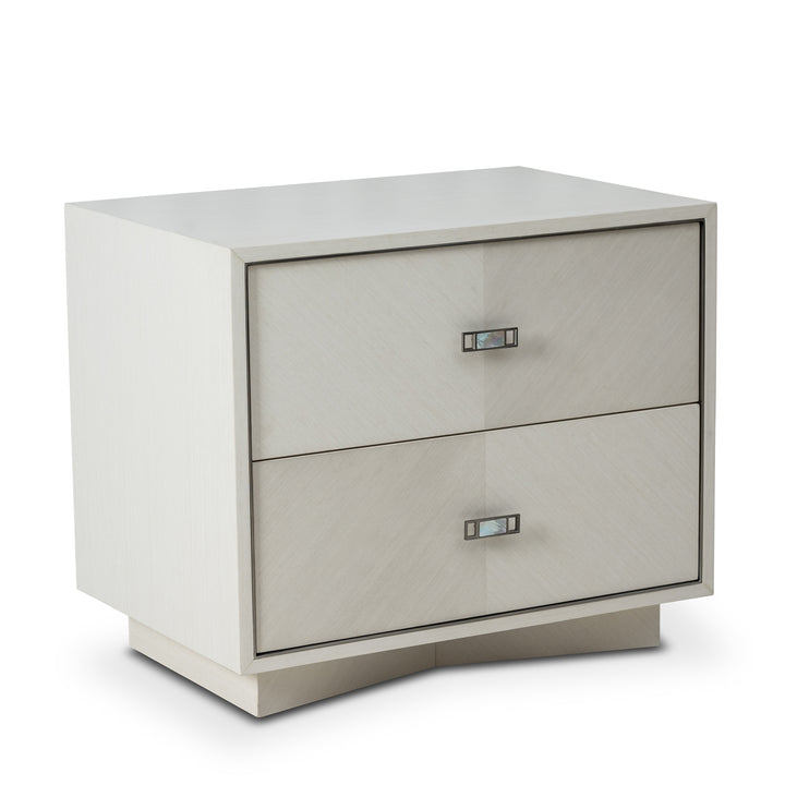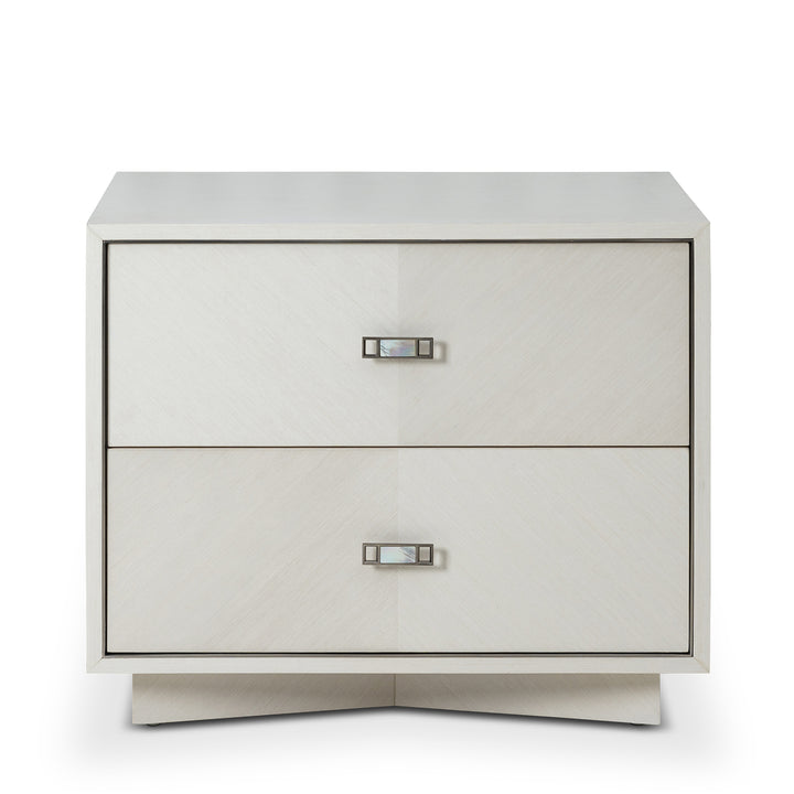 Chevron marquetry in a pearl oak finish gives this nightstand a sleek, architectural presence. The luminous mother-of-pearl inlaid knobs become the defining detail that elevates its compact form with timeless elegance.