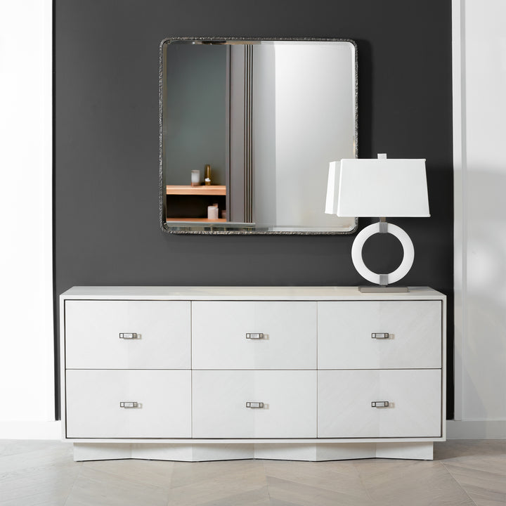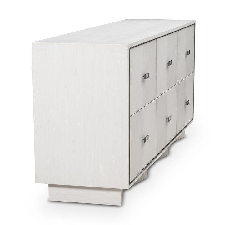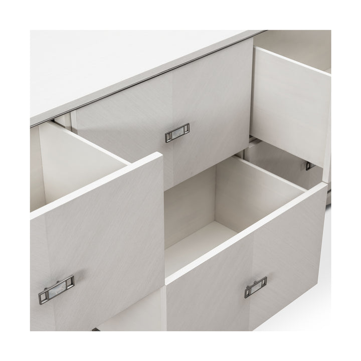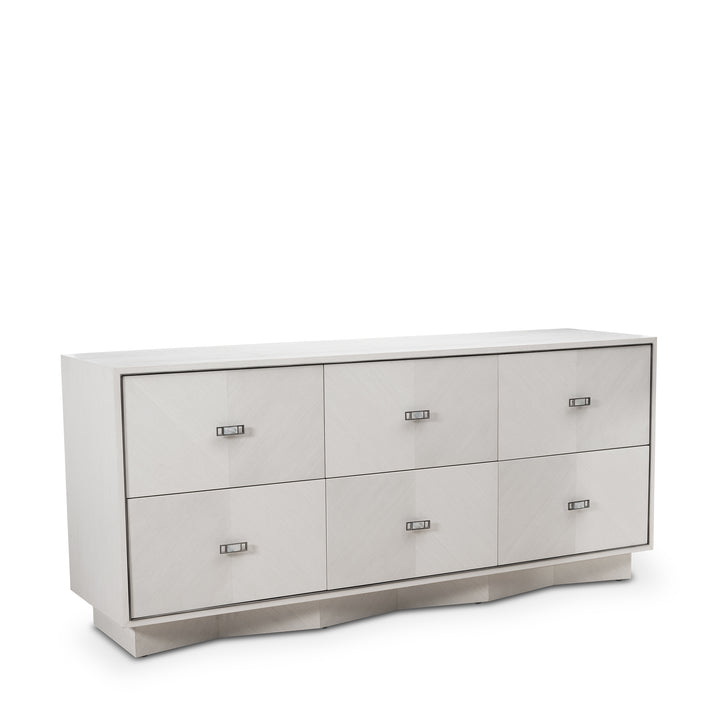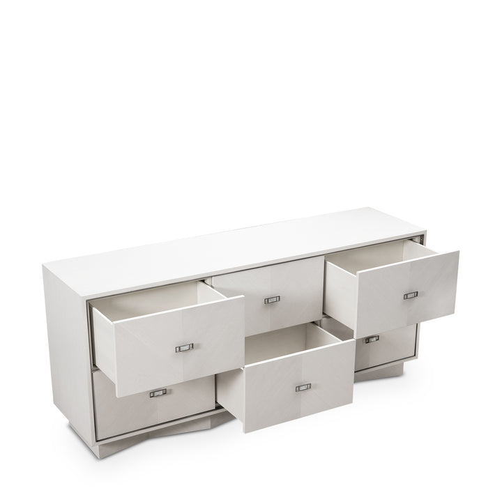 Chevron marquetry in pearl oak gives this chest a refined presence. Mother-of-pearl inlaid knobs stand out as a luminous detail, complemented by brushed pewter accents. With six spacious drawers, it offers practical storage and completes the look when paired with agate collection.