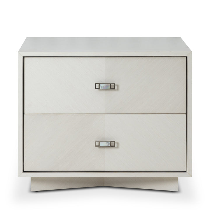 Chevron marquetry in a pearl oak finish lends this nightstand a refined, modern look. Brushed pewter trim and mother-of-pearl inlaid knobs bring a touch of luxury. With two drawers for bedside essentials, it pairs elegance with everyday function.