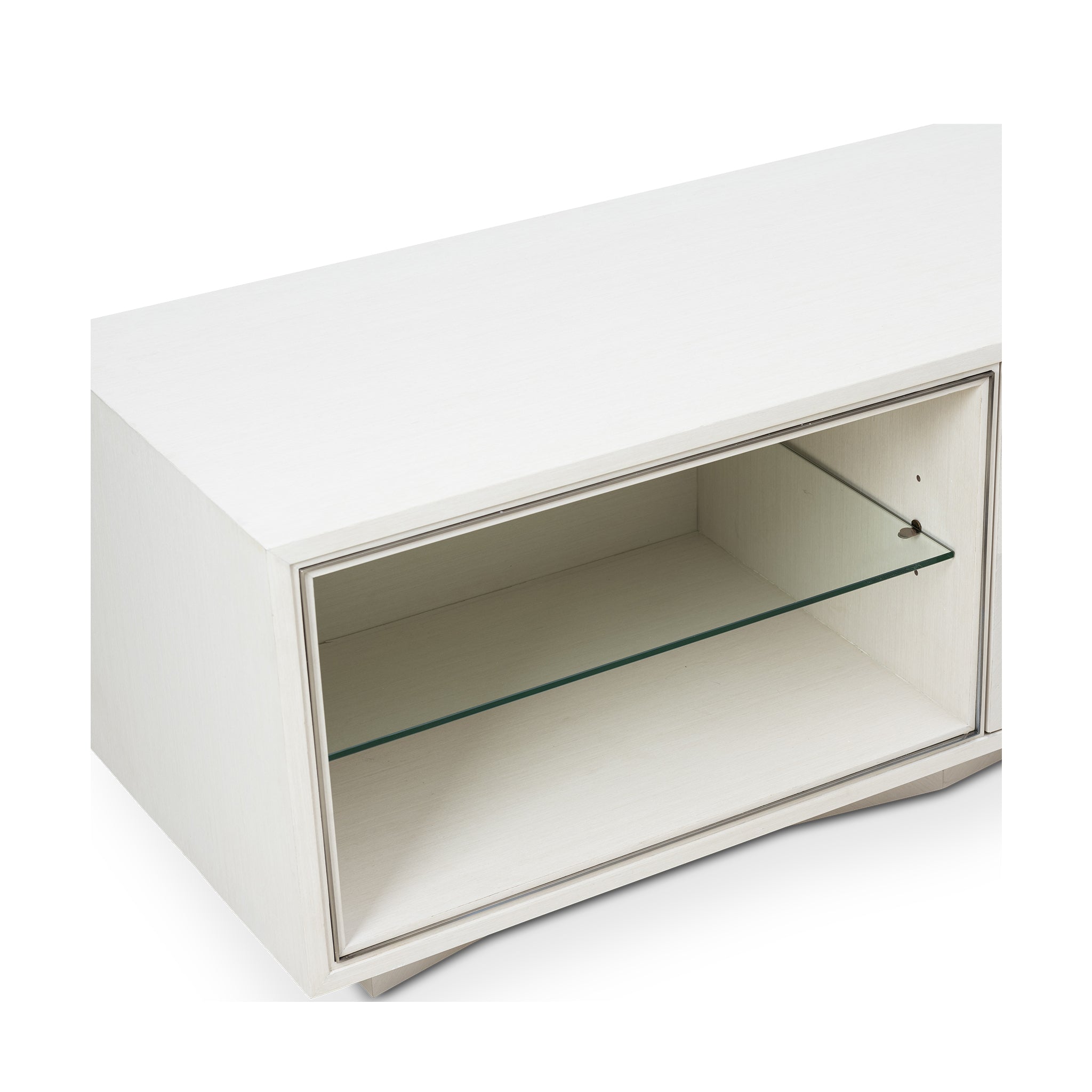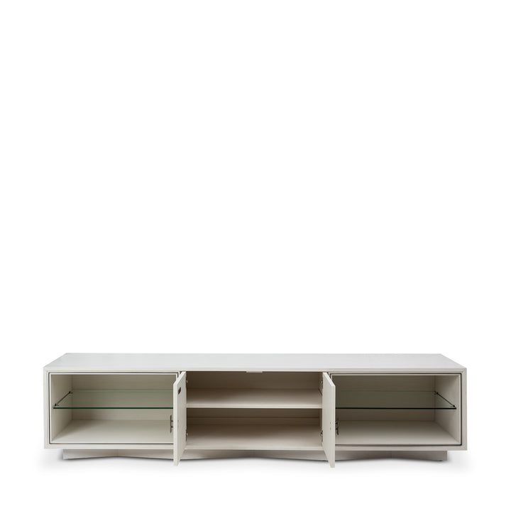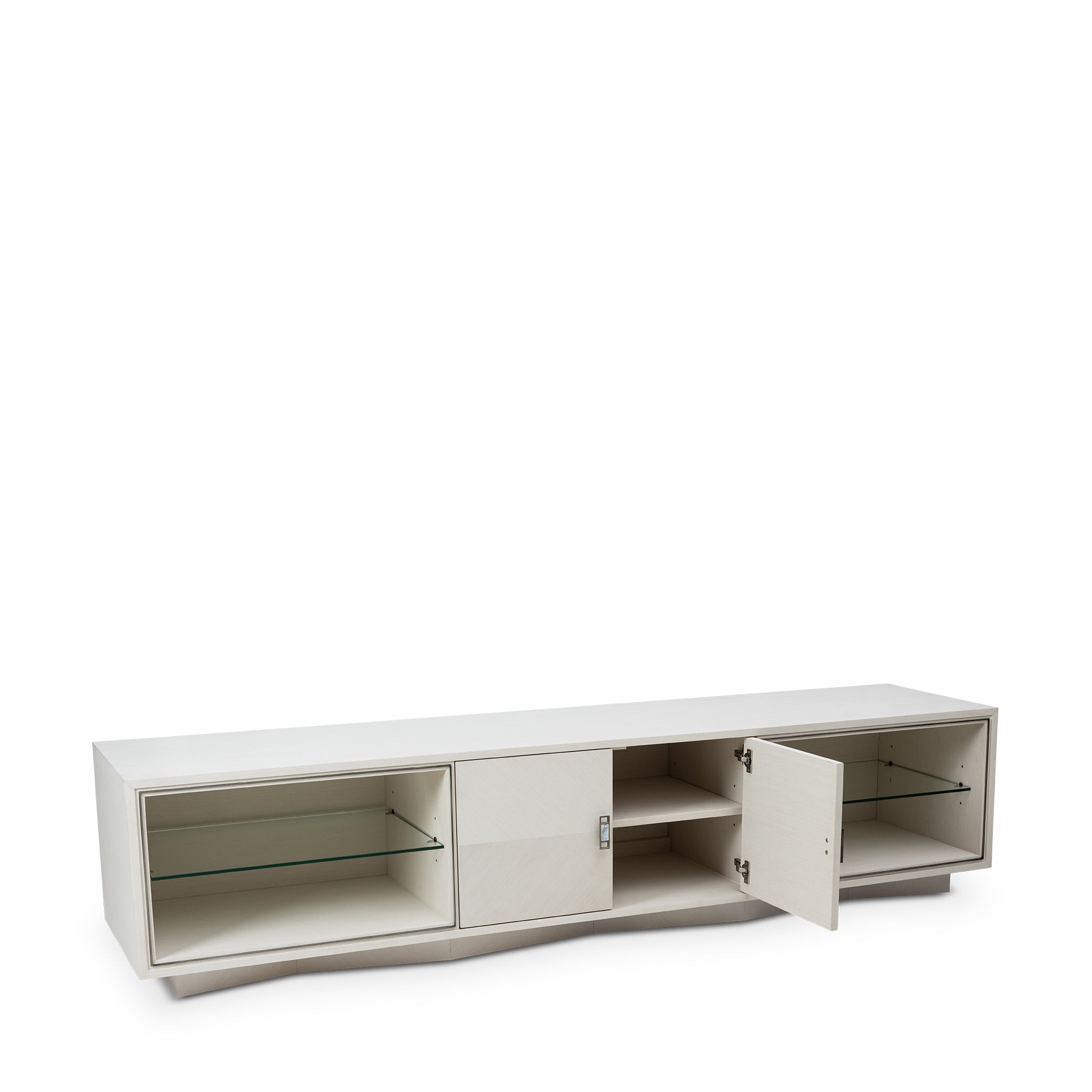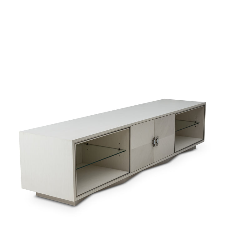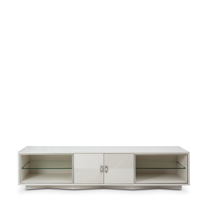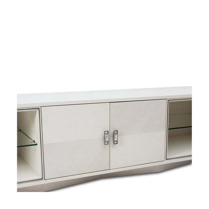 The pearl oak finish with chevron marquetry lends this entertainment cabinet a clean, modern look. Mother-of-pearl hardware and brushed pewter accents add a refined touch, while open shelving and concealed storage provide balance between display and practicality.
