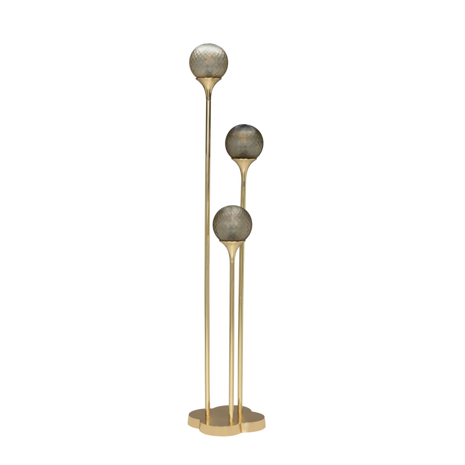 This floor lamp features three orbs on brass stems. The stylish design and brass finish create a striking look.