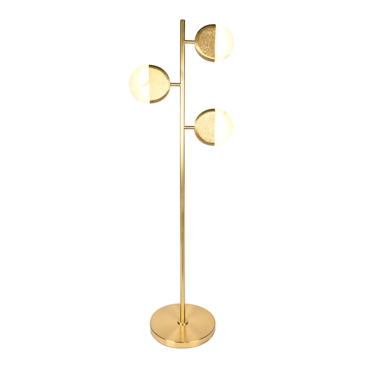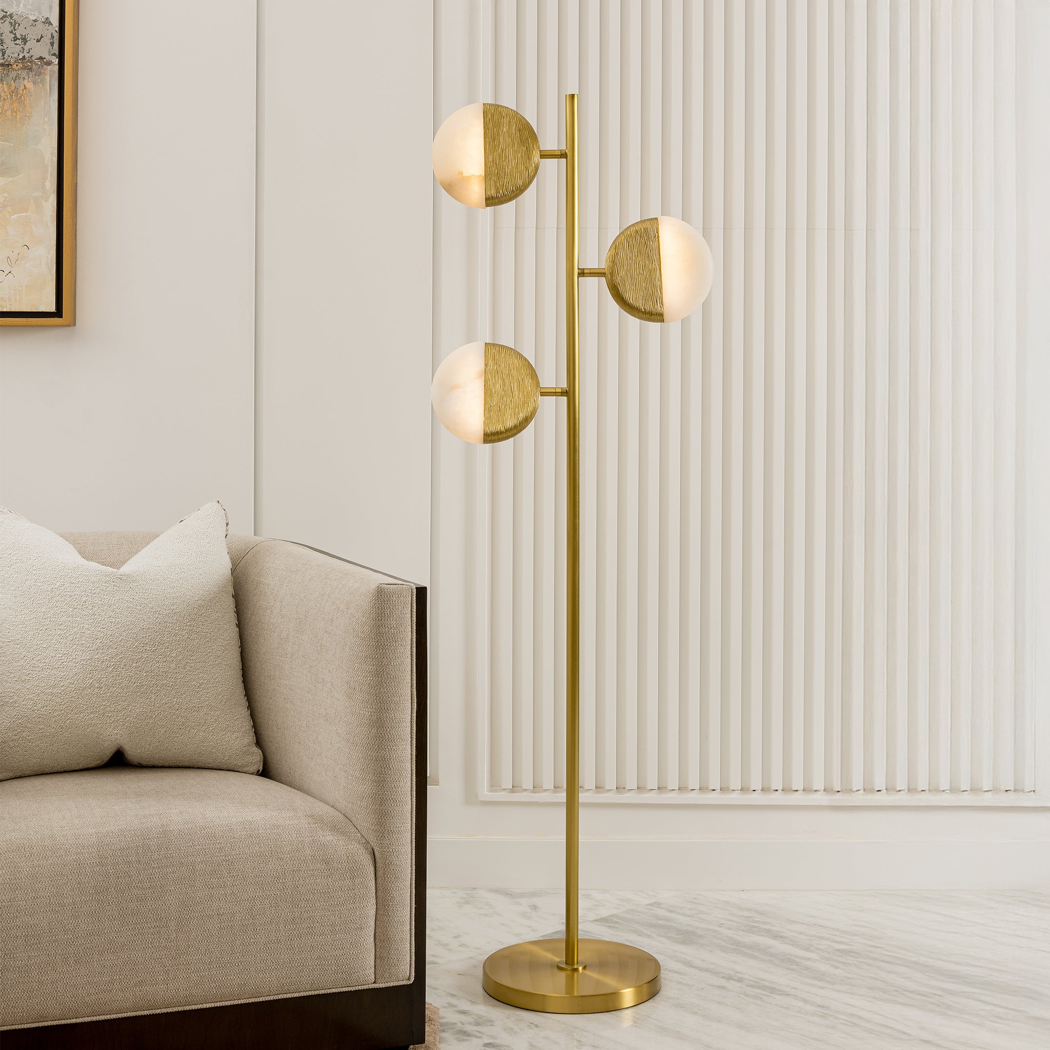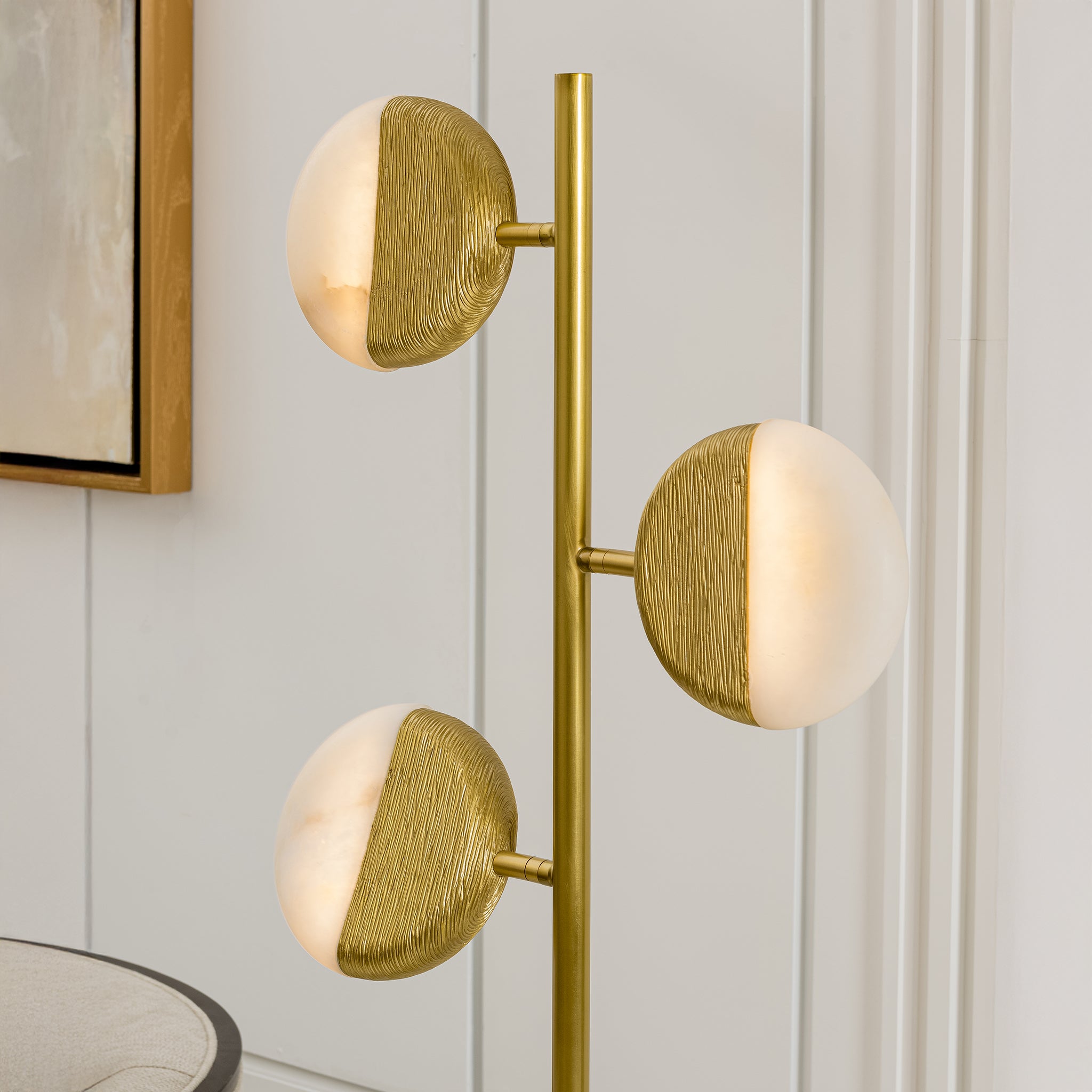Half-metal, half-alabaster geometric shades bring sculptural clarity to this art deco–inspired floor lamp. The steel frame exudes timeless refinement, casting a gentle radiance that enriches its sculptural form.
