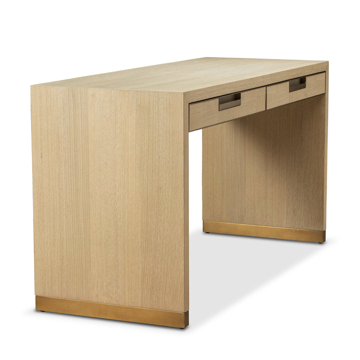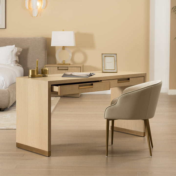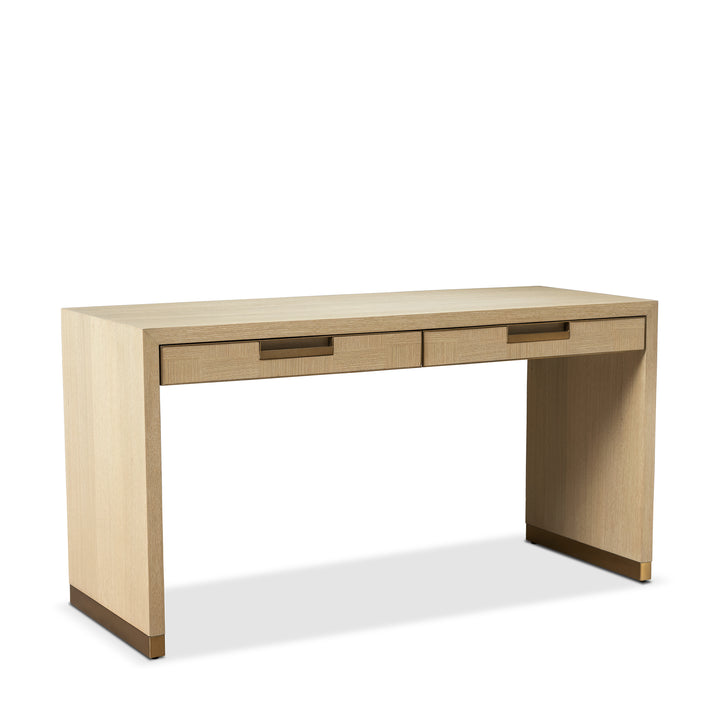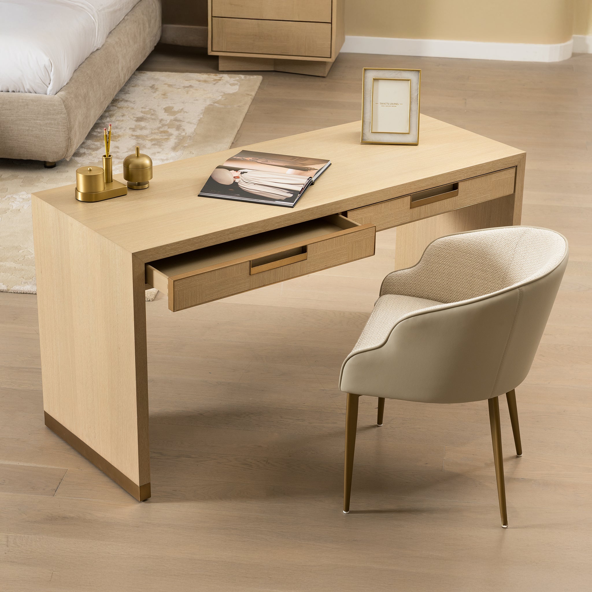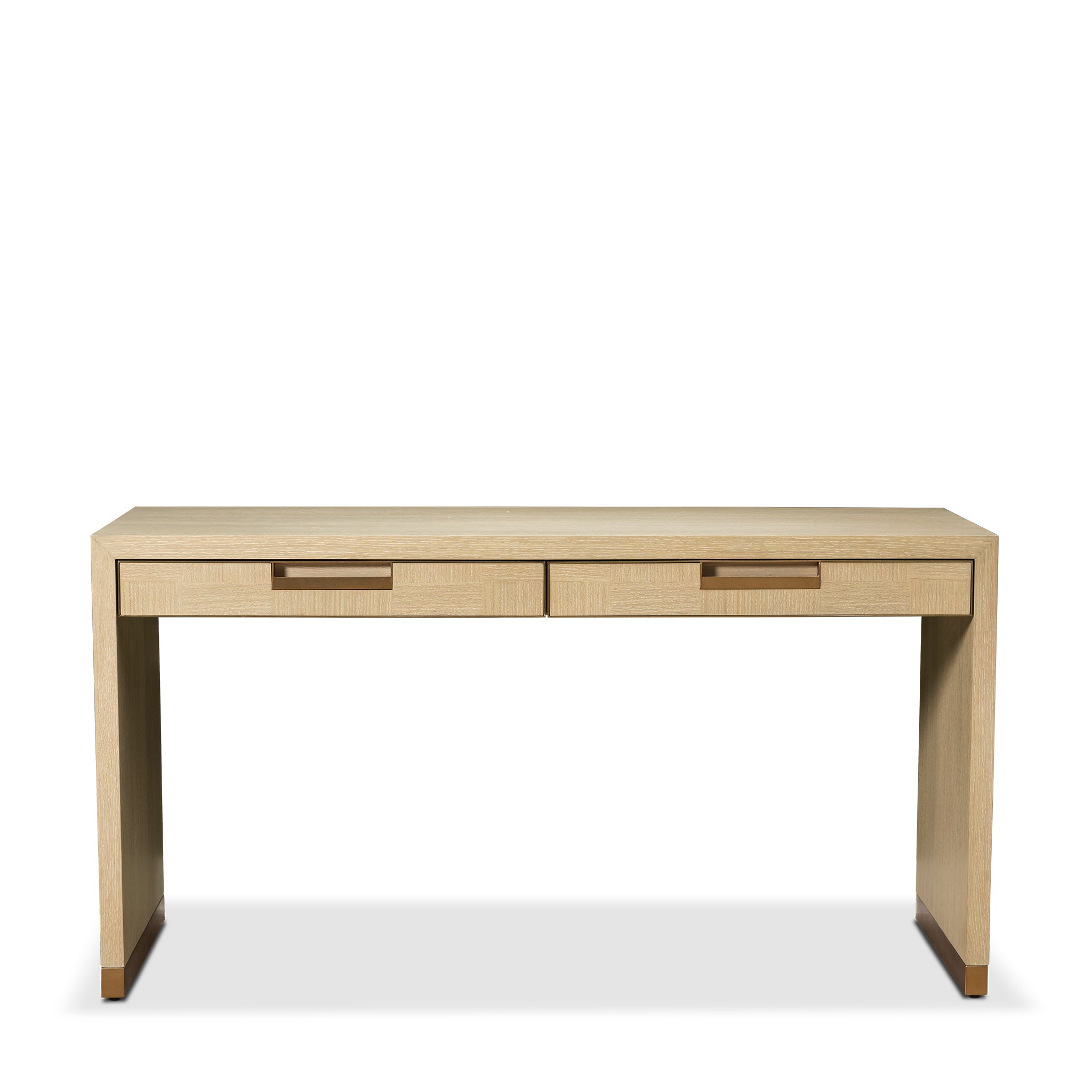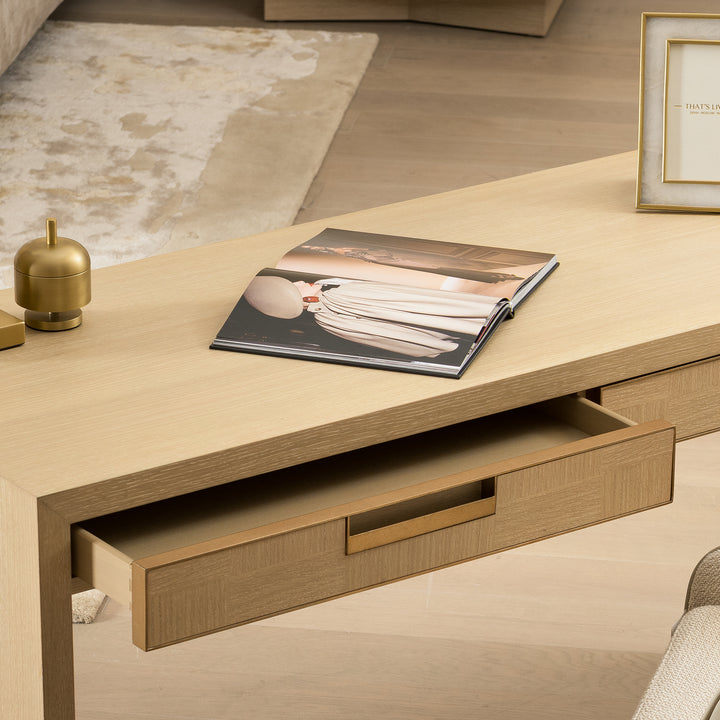 A graceful balance of form and function, this writing desk showcases the collection’s alternating marquetry oak veneer. Antique brass detailing lends a touch of sophistication, enriching its timeless design. Perfectly scaled, it offers a versatile workspace that pairs seamlessly with the other pieces in the collection.