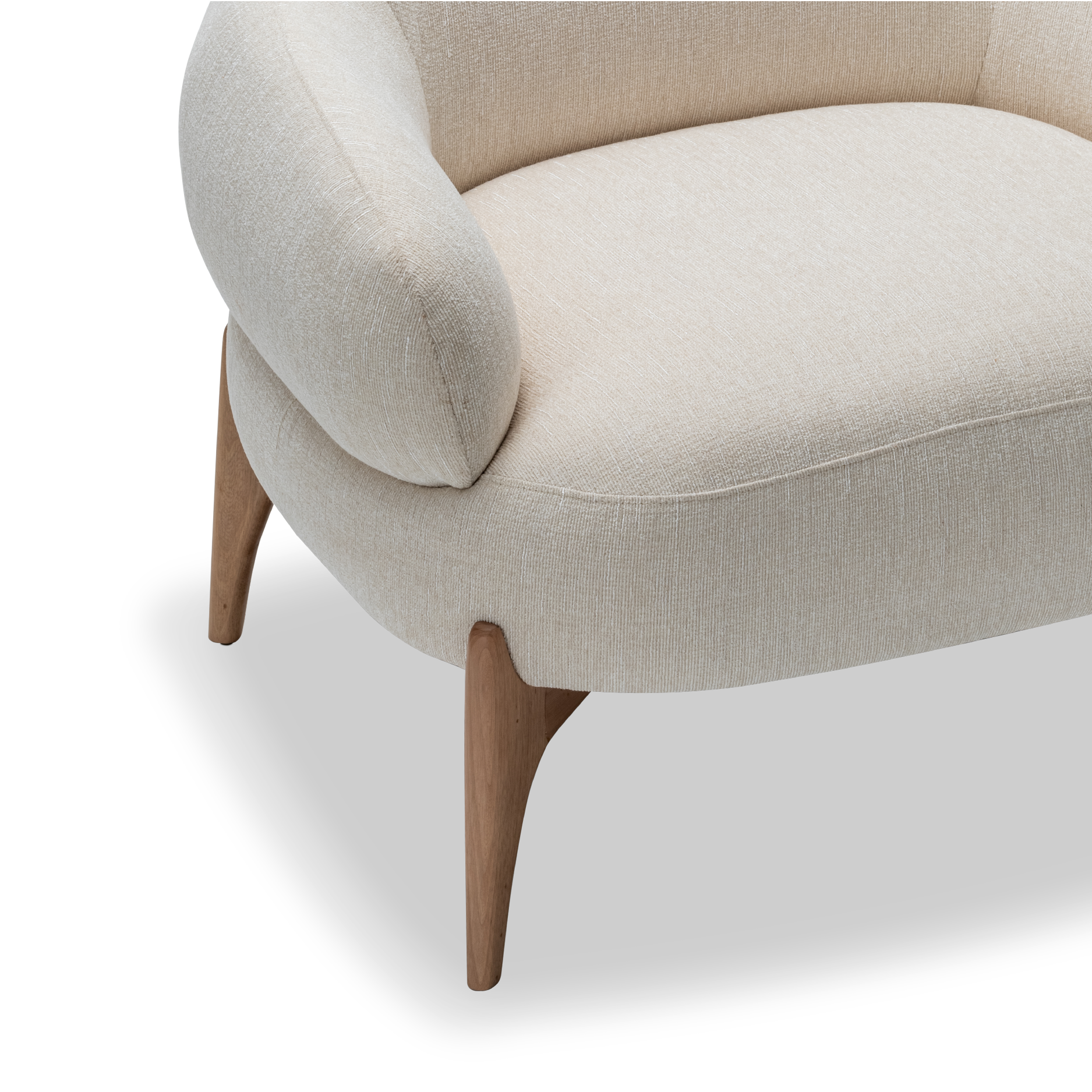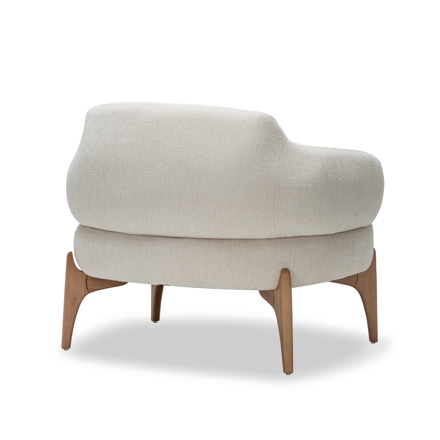 Upholstered in amalfi pearl fabric, the chair features sturdy legs crafted from solid wood finished in a rich cacao-colored varnish, adding timeless elegance to its modern silhouette.
