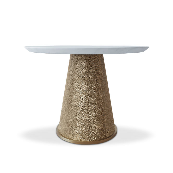 The polished white banswara marble top offers a clean and elegant surface. The base is crafted with textured brass sheet cladding in a burnished brass finish, showcasing artisan craftsmanship. A circular ring element at the base adds a sculptural quality to the dining table, creating a sense of balance and sophistication that elevates the overall design.