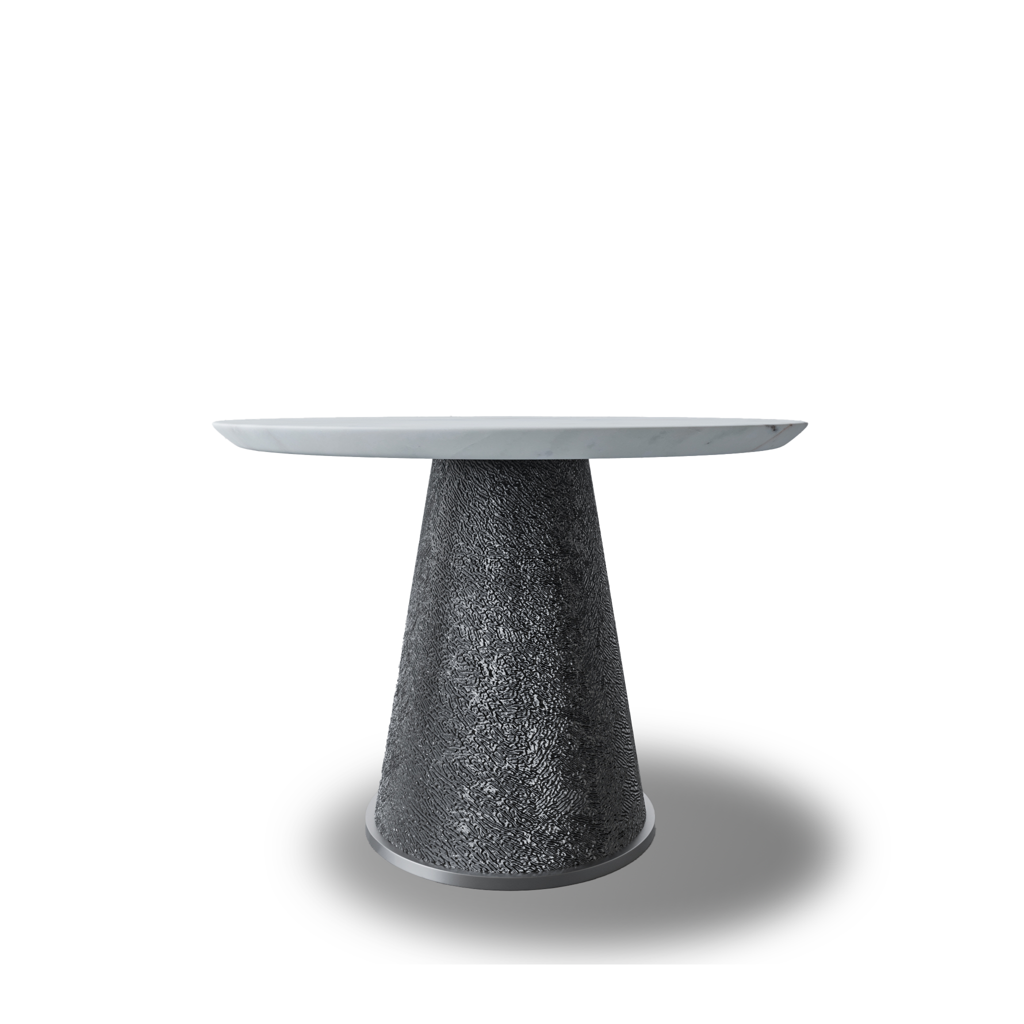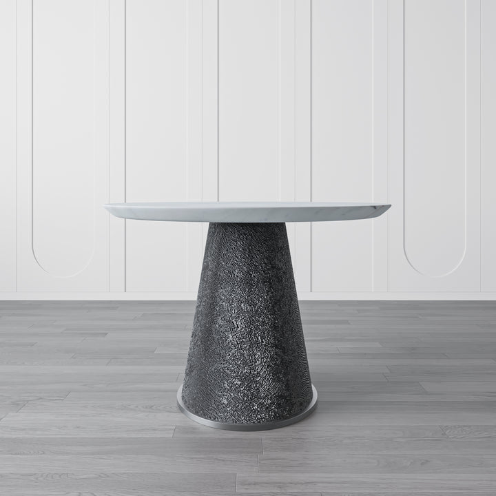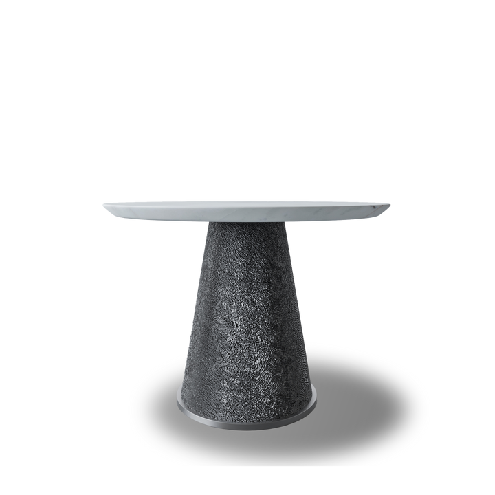 Polished white banswara marble top offers a clean and elegant surface. The base is crafted from a textured white metal sheet cladding in burnished silver finish showcasing artisans craftsmanship. A circular ring element at the base adds a sculptural quality to the dining table, creating a sense of balance and sophistication that elevates the overall design.