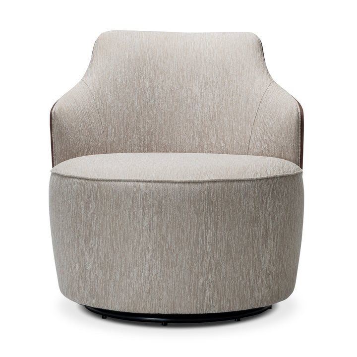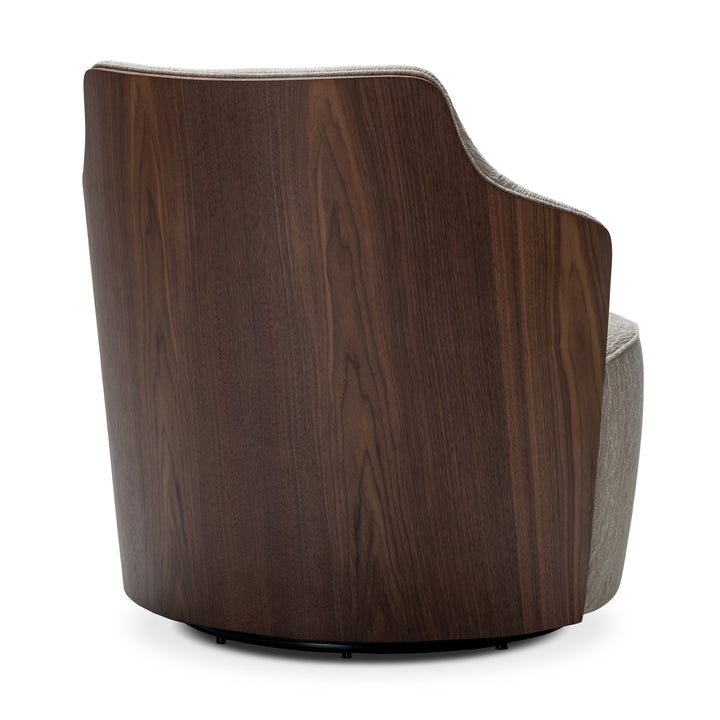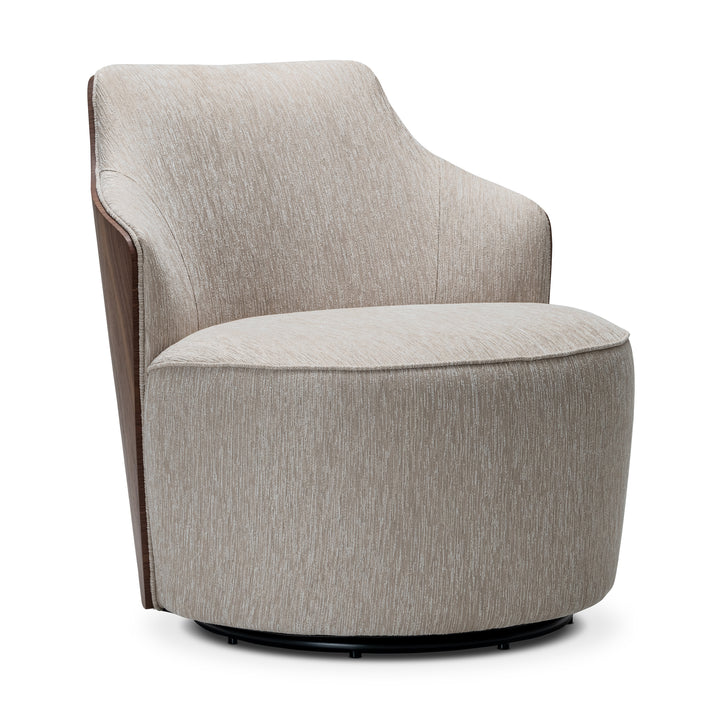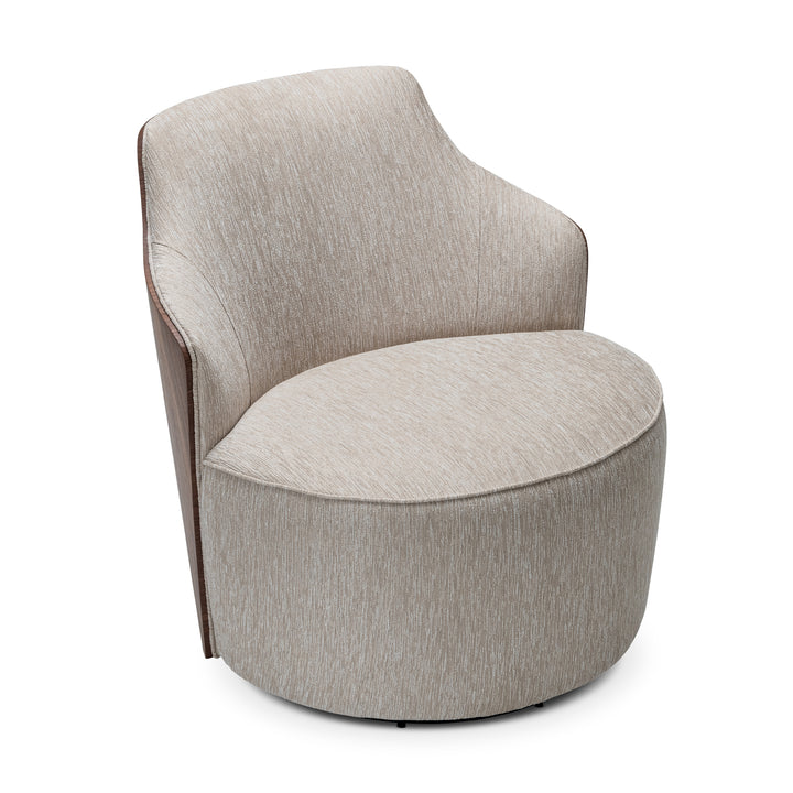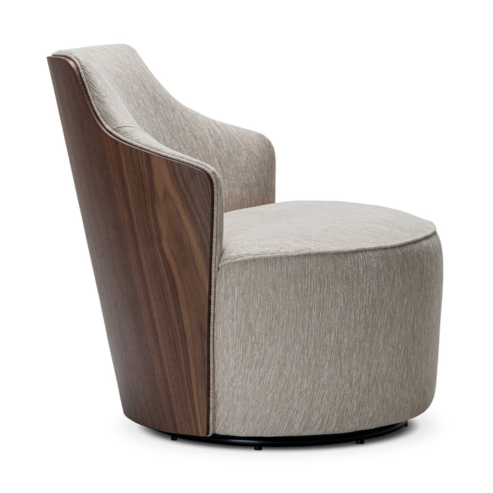 Upholstered in savoy champagne fabric, this chair pairs elegance with comfort. The rich American walnut-finished wooden back adds a natural touch. The smooth swivel base offers effortless rotation.