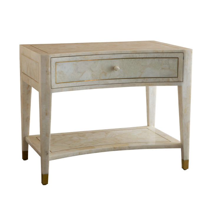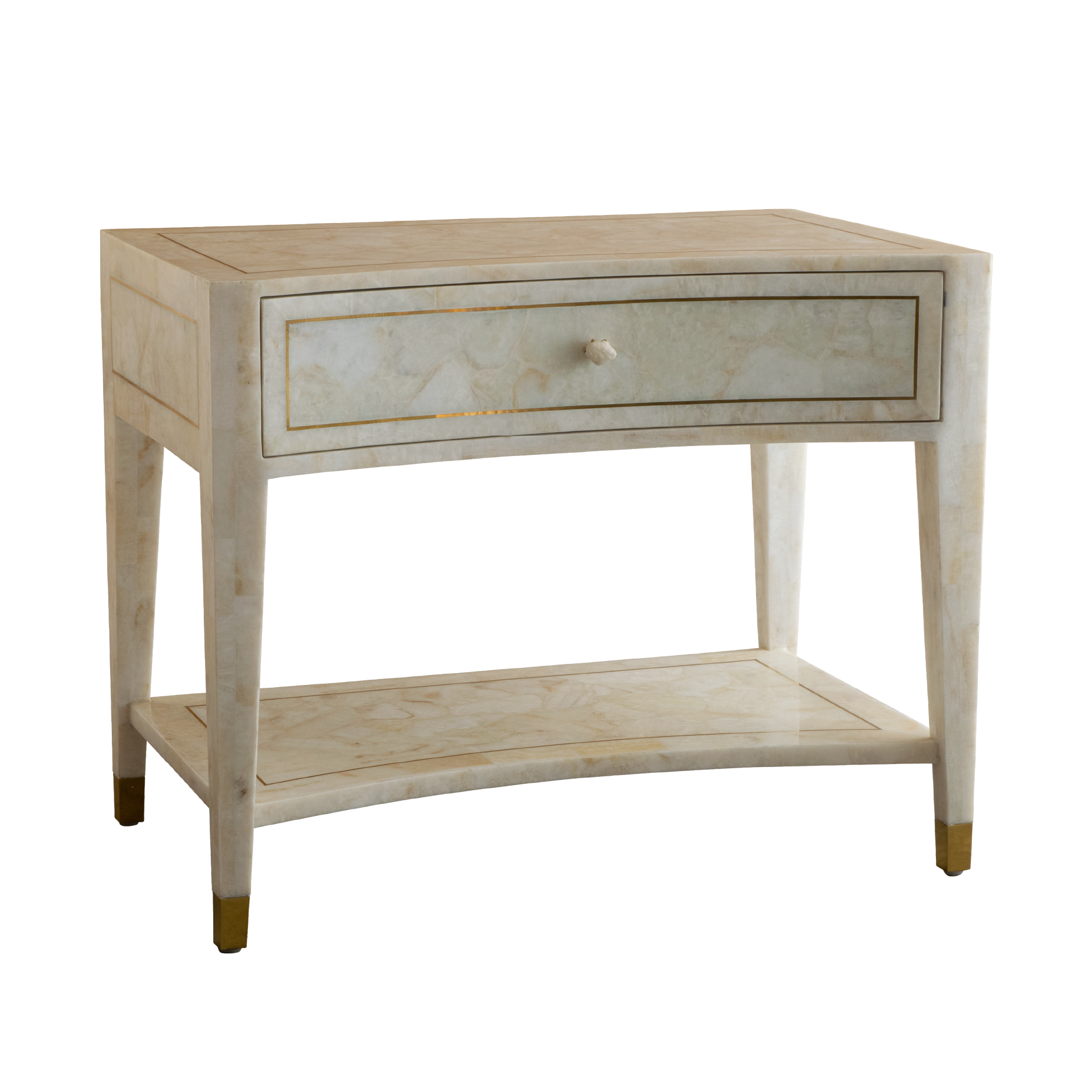 Enhance your space with this generously sized, beautiful nightstand. Crafted from crazy-cut crystal stone, this rare material is hand-harvested from the peaks of Southeast Asia. The smooth, polished surface highlights the natural beauty of the stone, while delicate stringline brass accents and polished brass ferrules add a touch of elegance.