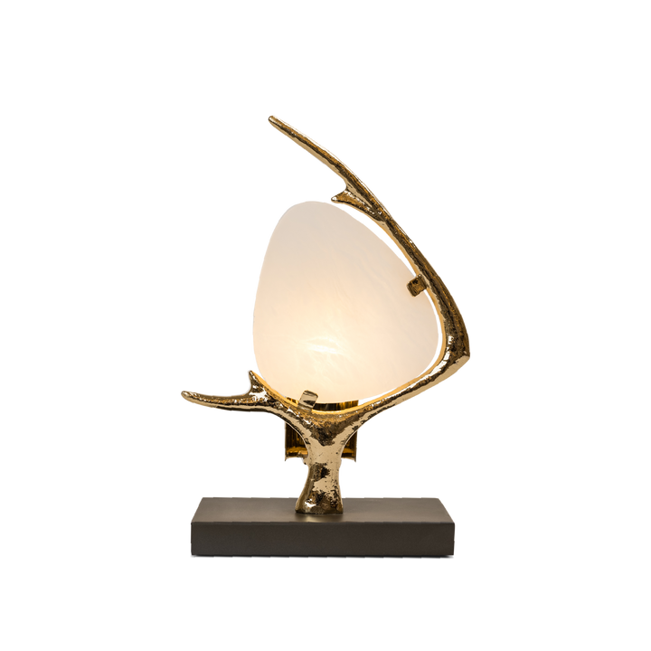 A touch of nature's elegance, that is a stunning addition to any space. Its intricate brass design, inspired by aquatic forms, combined with a soft, alabaster stone shade, creates a serene and sophisticated ambiance. This exquisite wall lamp is perfect for adding a touch of luxury and tranquility to your home.