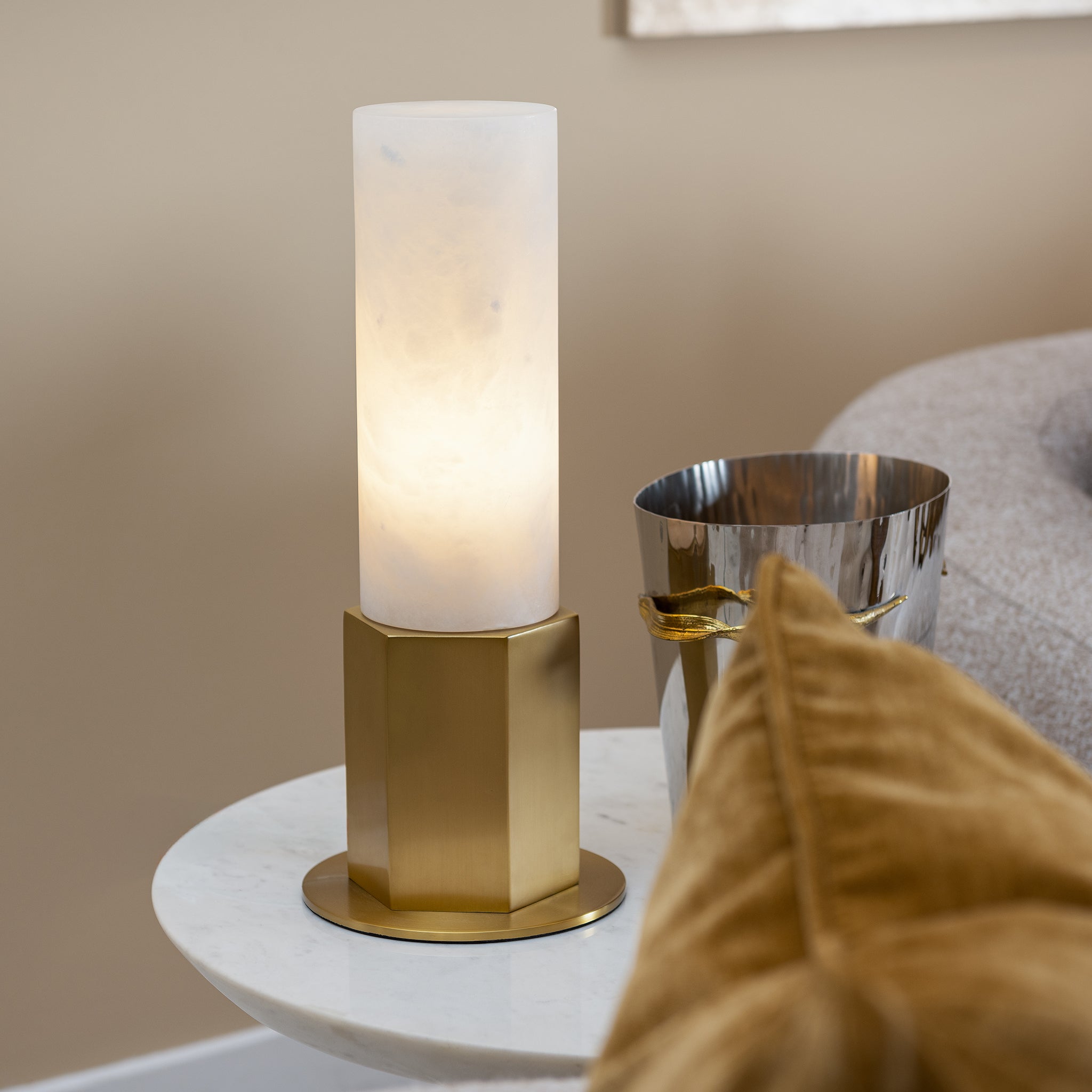 Echoing the glamour of art deco design, this table lamp combines a natural alabaster cylinder shape with an antique brass–finished base. Its geometric form and rich materials create a striking balance of structure and elegance.