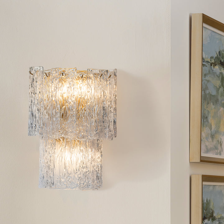 Part of the ava Collection, this wall lamp embodies art deco–inspired grandeur with its tiered form and intricate glass detailing. Crafted from clear textured glass with an antique brass finish, it exudes timeless elegance.