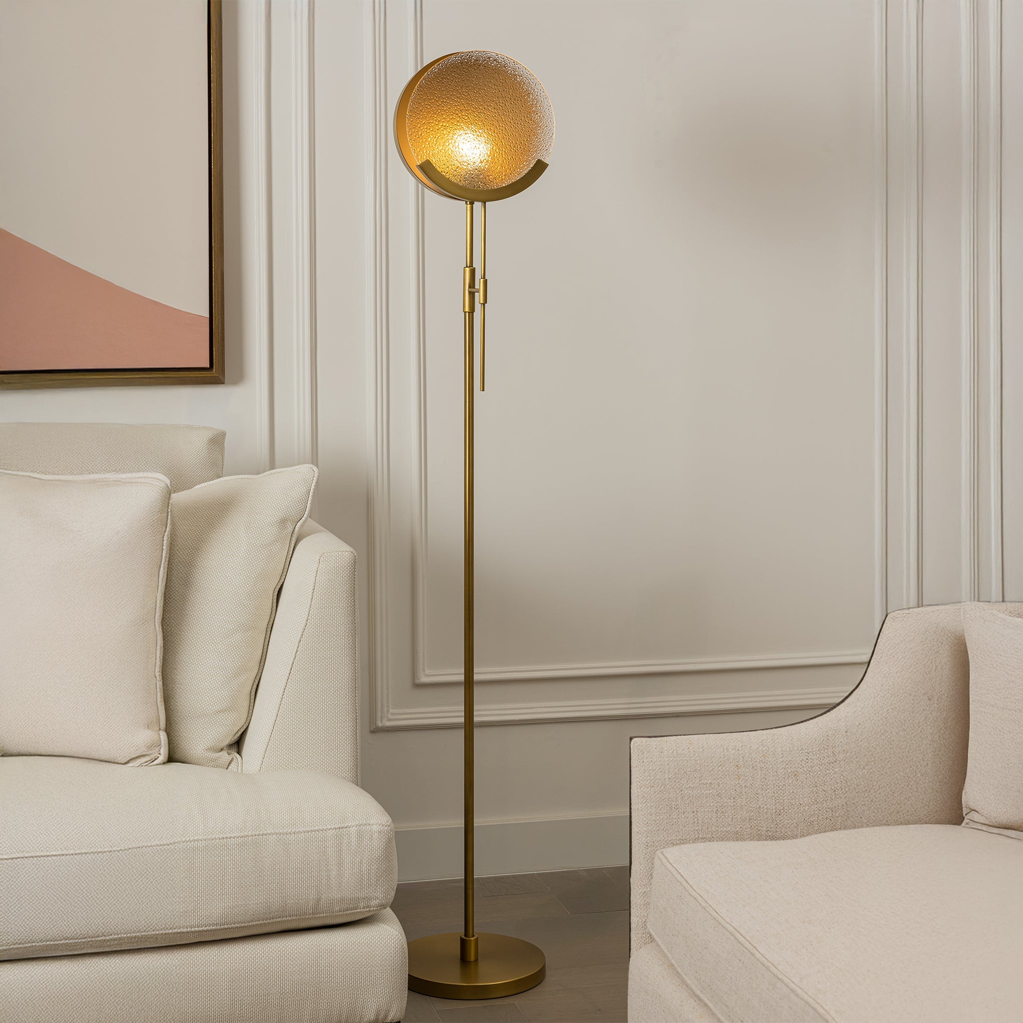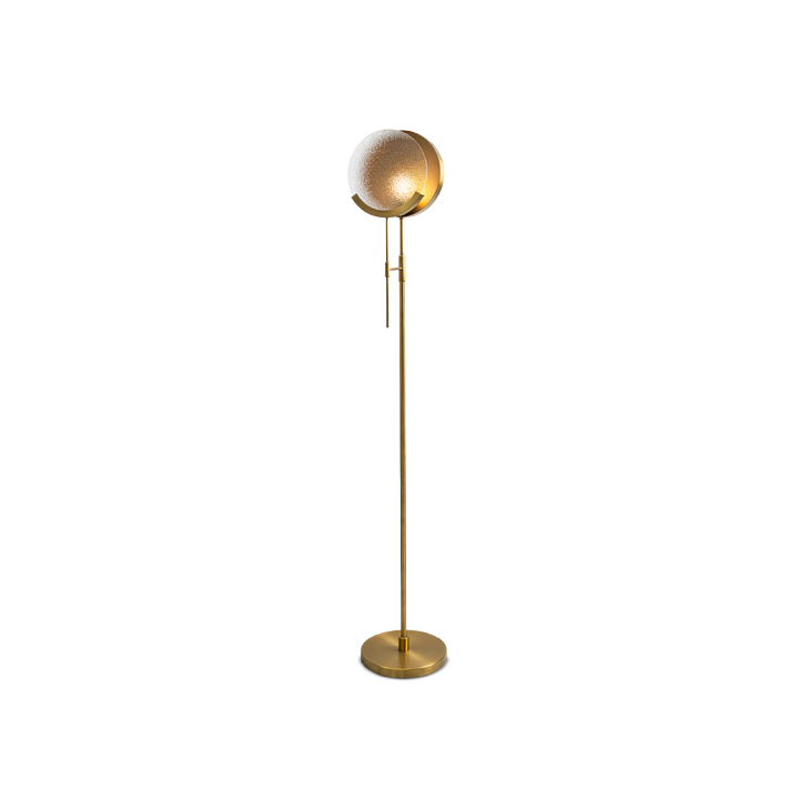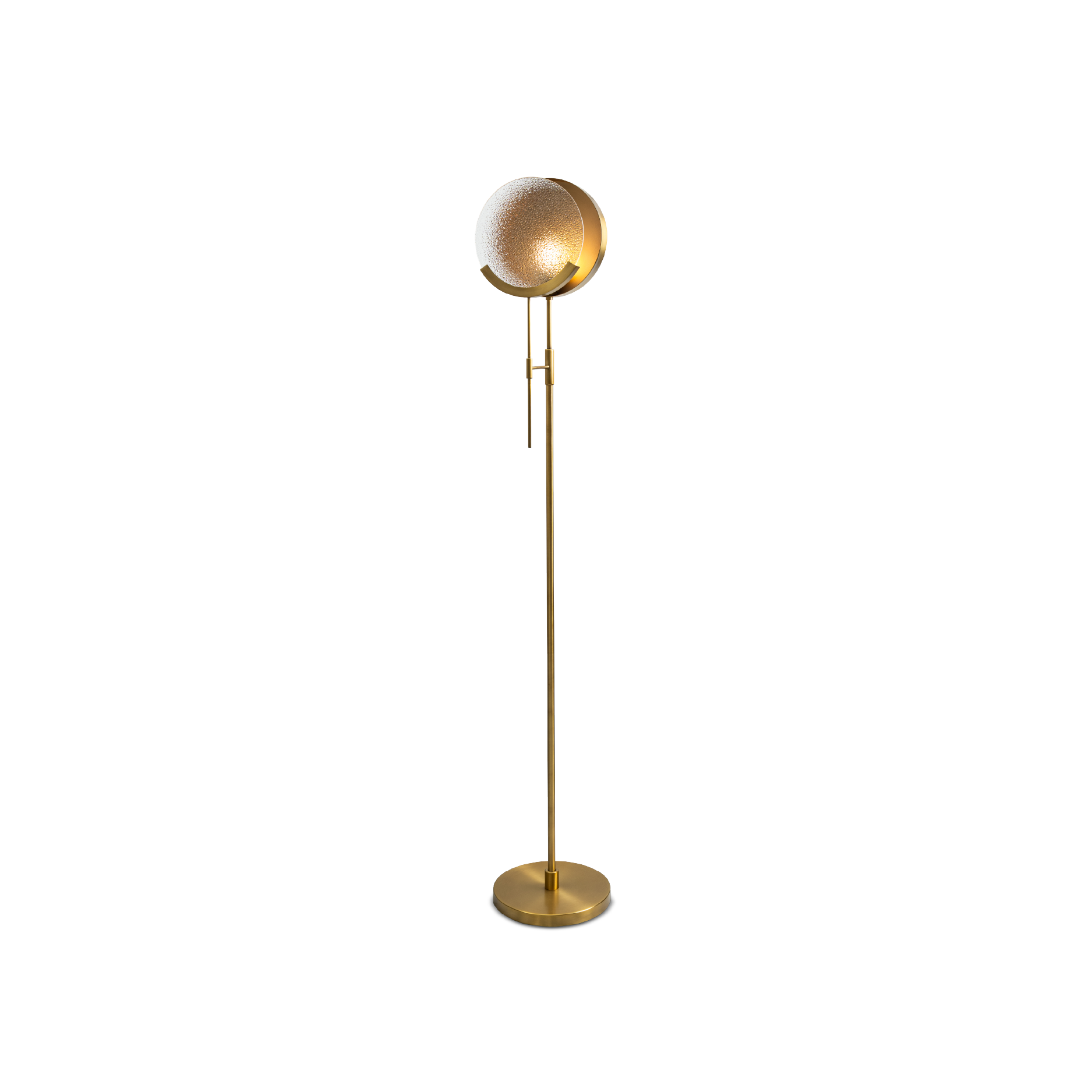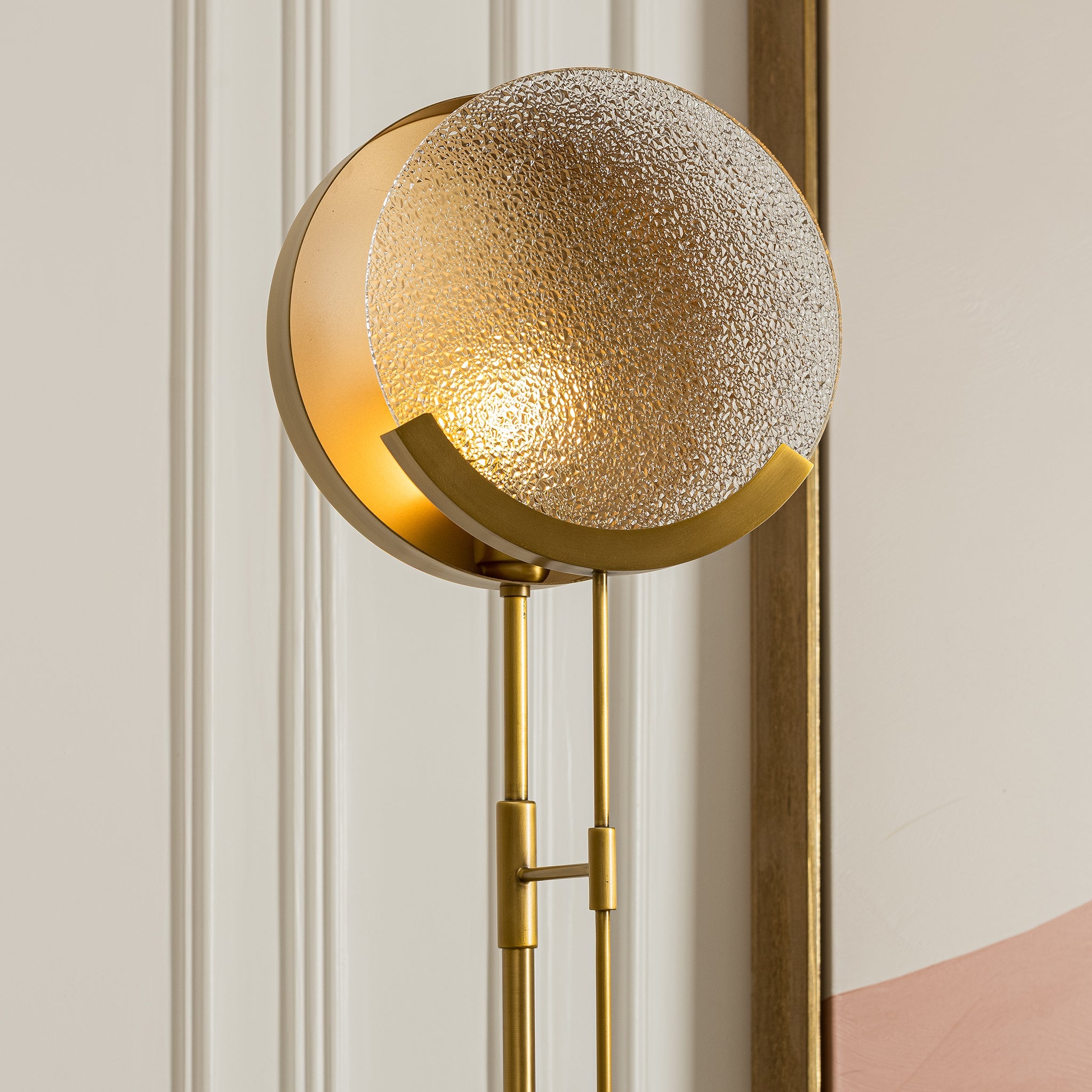 A refined fusion of art deco elegance, the slender brass frame leads to a circular textured glass shade that serves as a sculptural focal point. Its balanced form and subtle detailing create a timeless sense of sophistication.