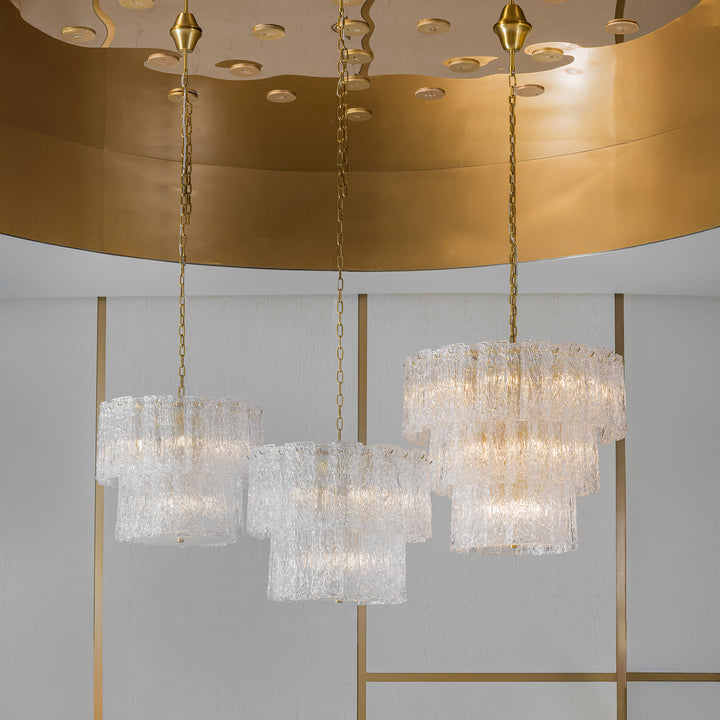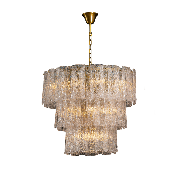 Part of the ava collection, this chandelier embodies art deco-inspired grandeur with its tiered form and intricate glass detailing. Crafted from clear textured glass and an antique brass finish.