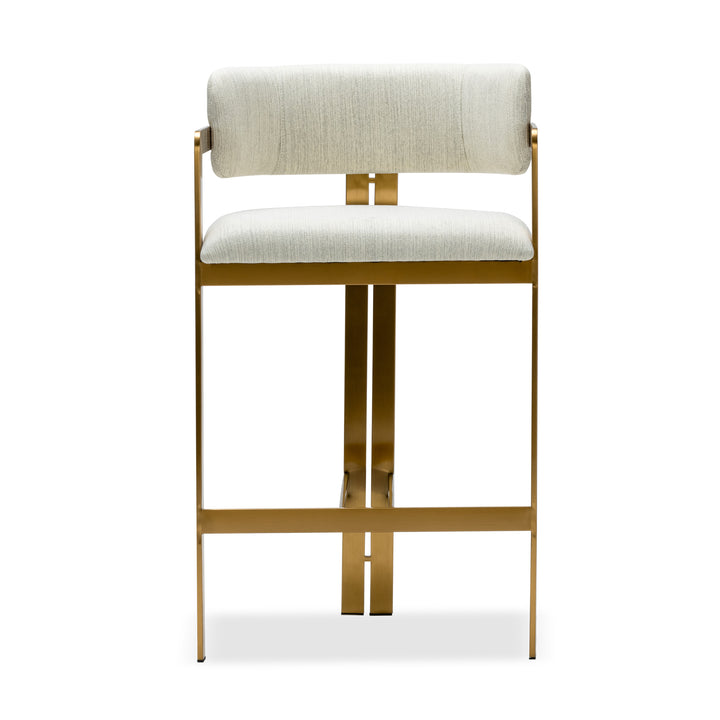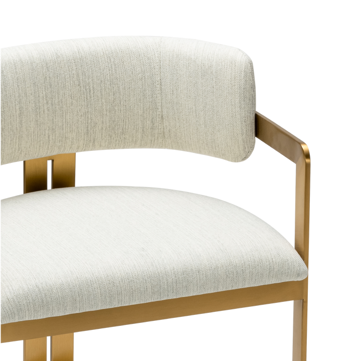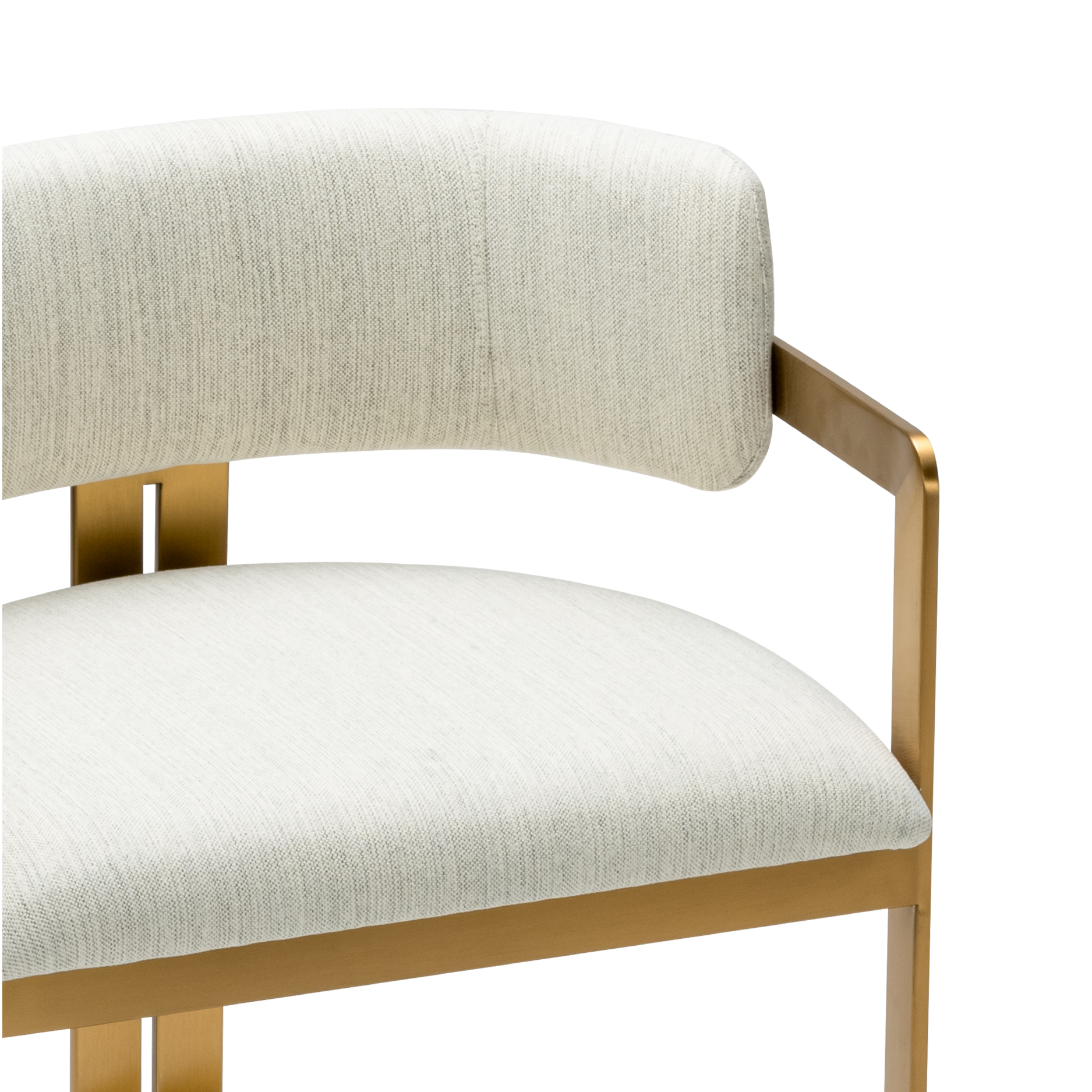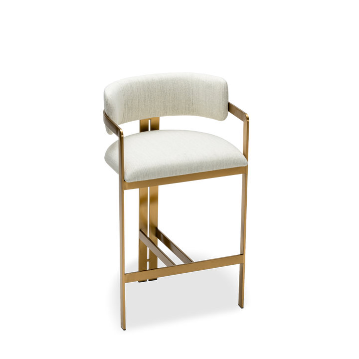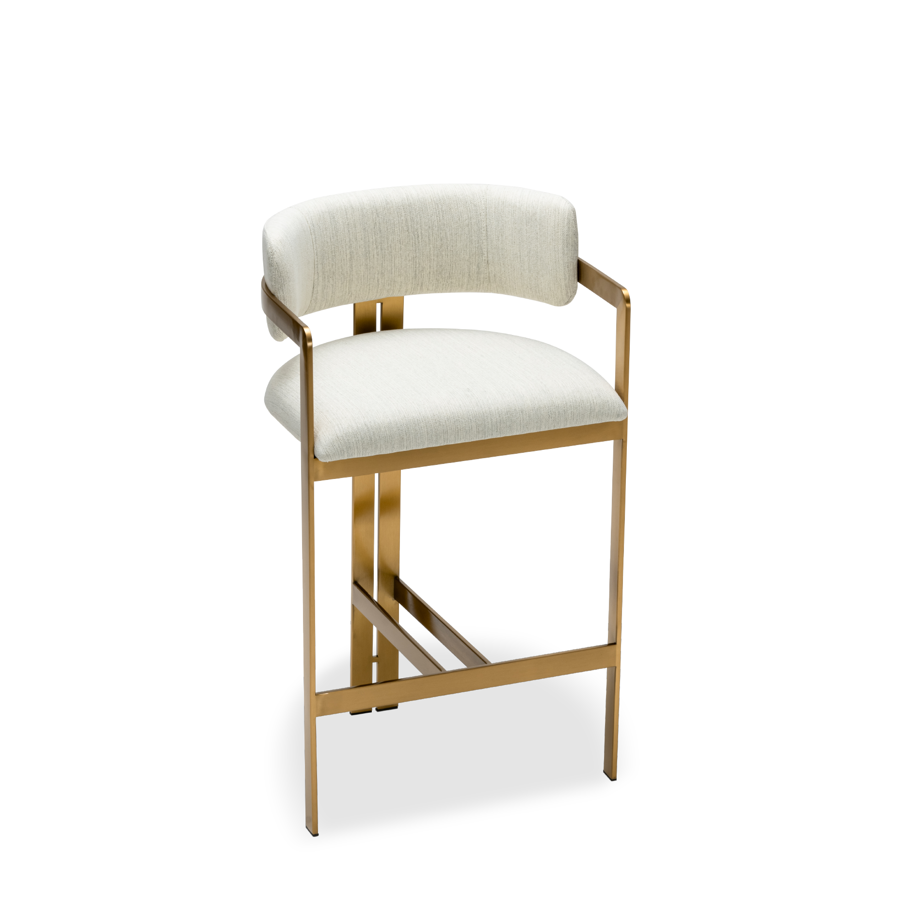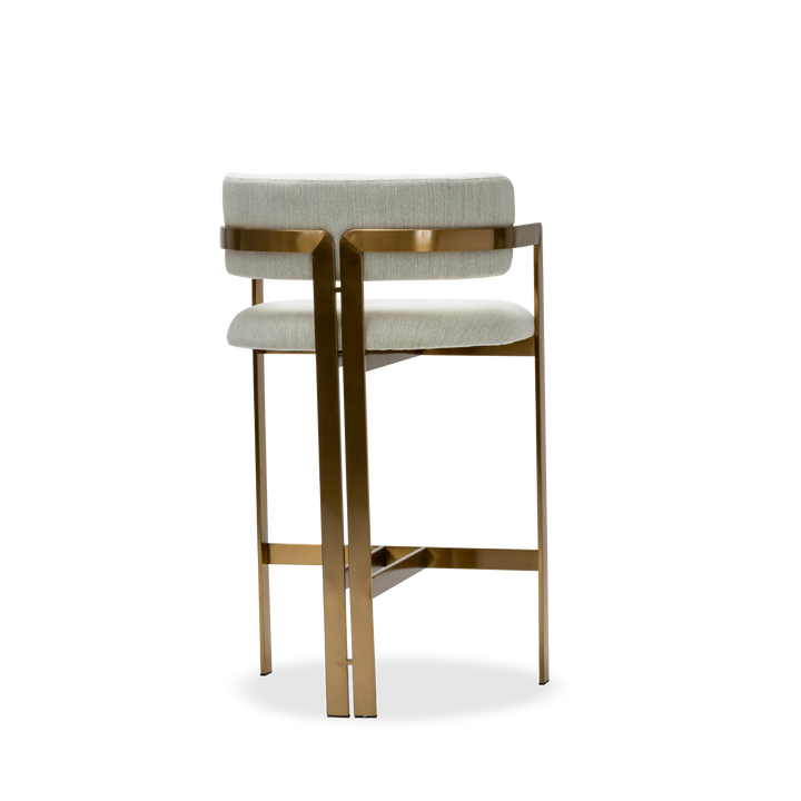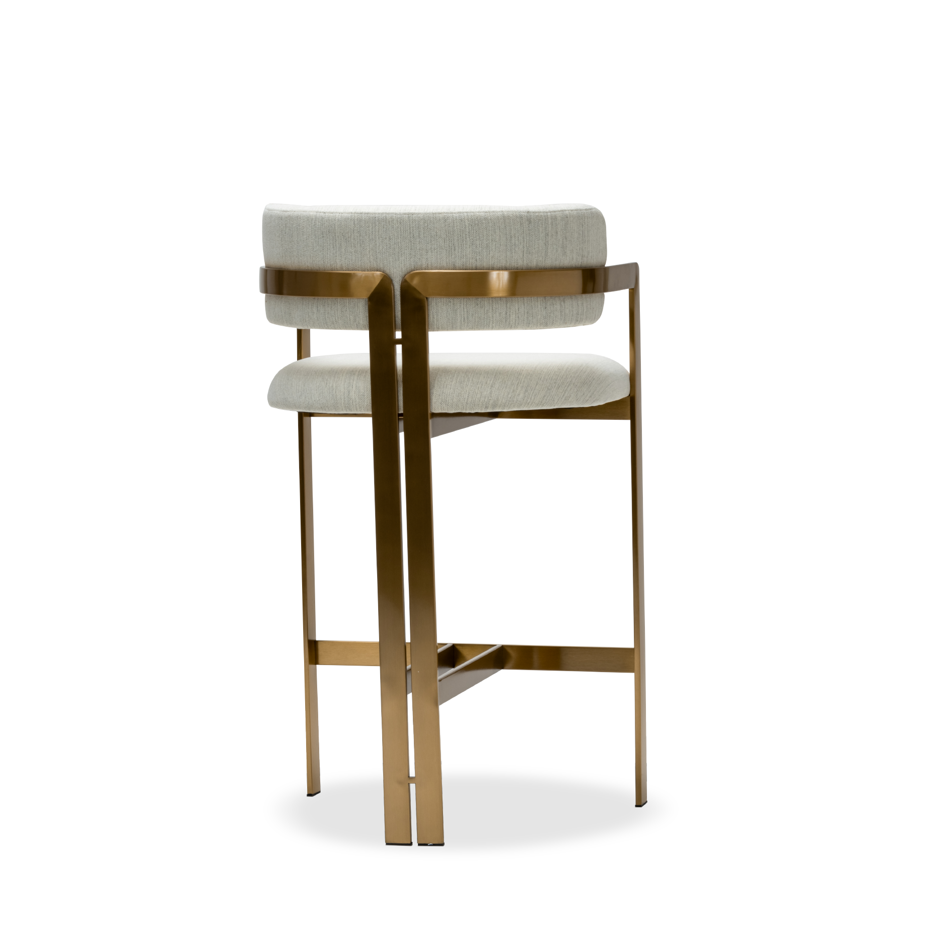 Designed for both comfort and style, this barstool brings effortless elegance to any space. Upholstered in feather grey fabric. Its frame is crafted from stainless steel with a brushed brass finish, providing durability and style.