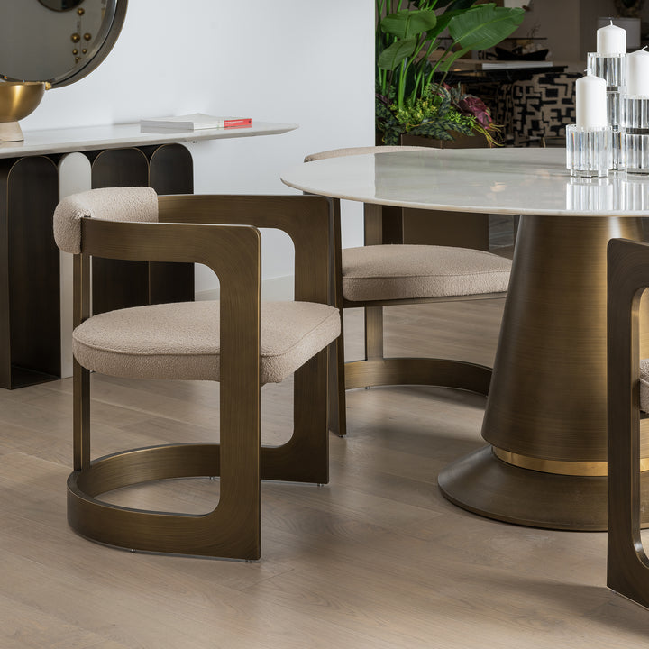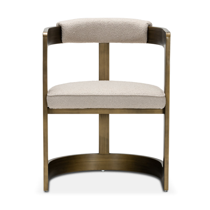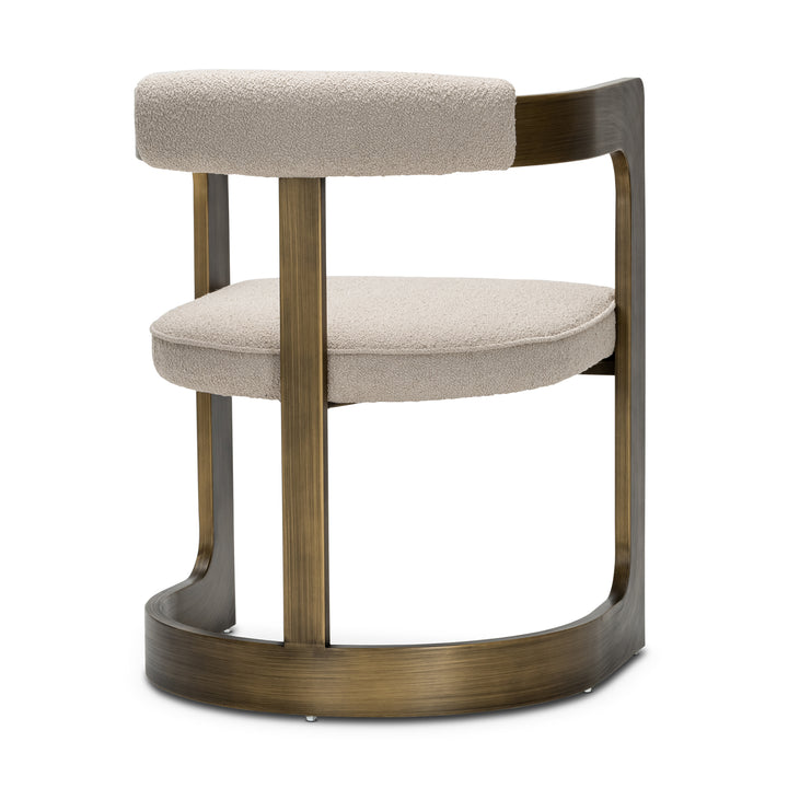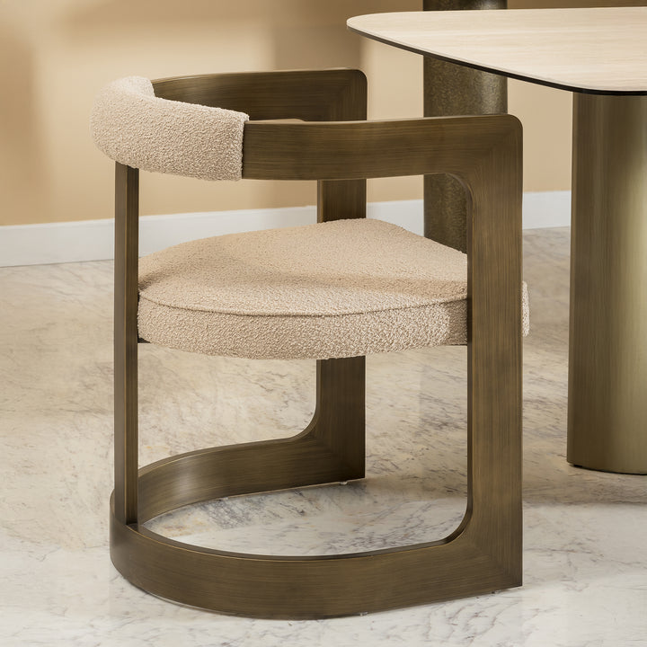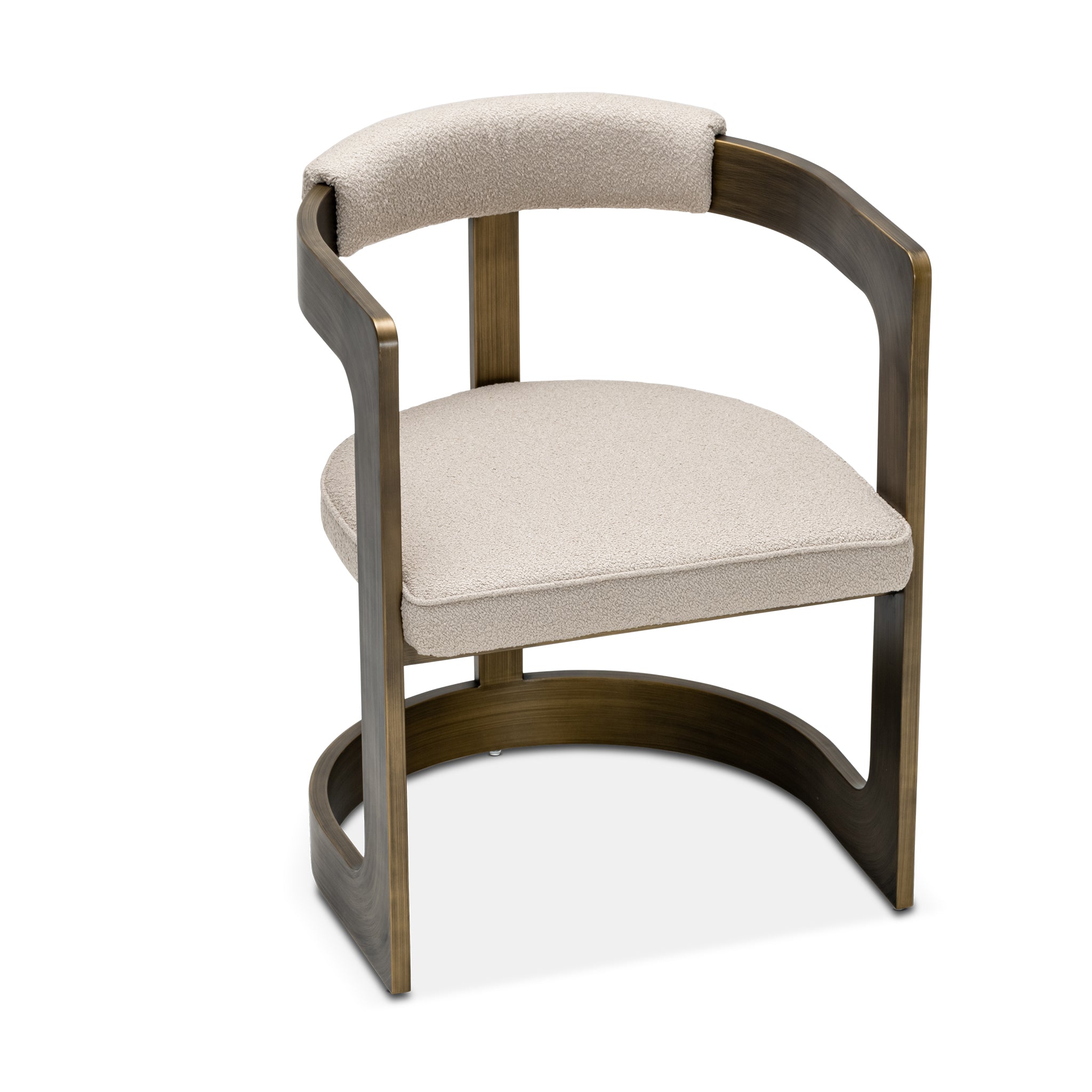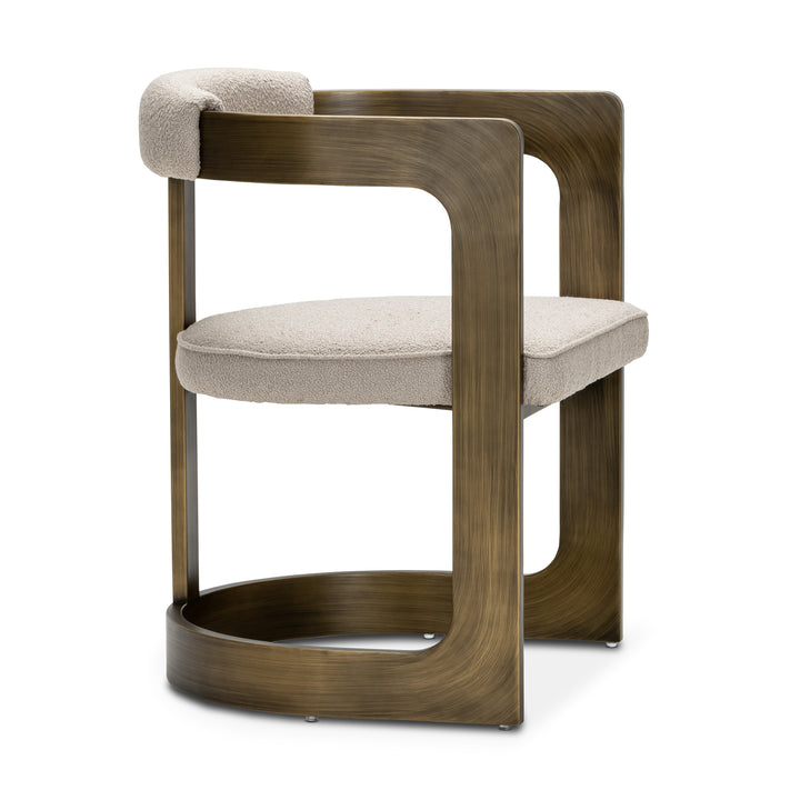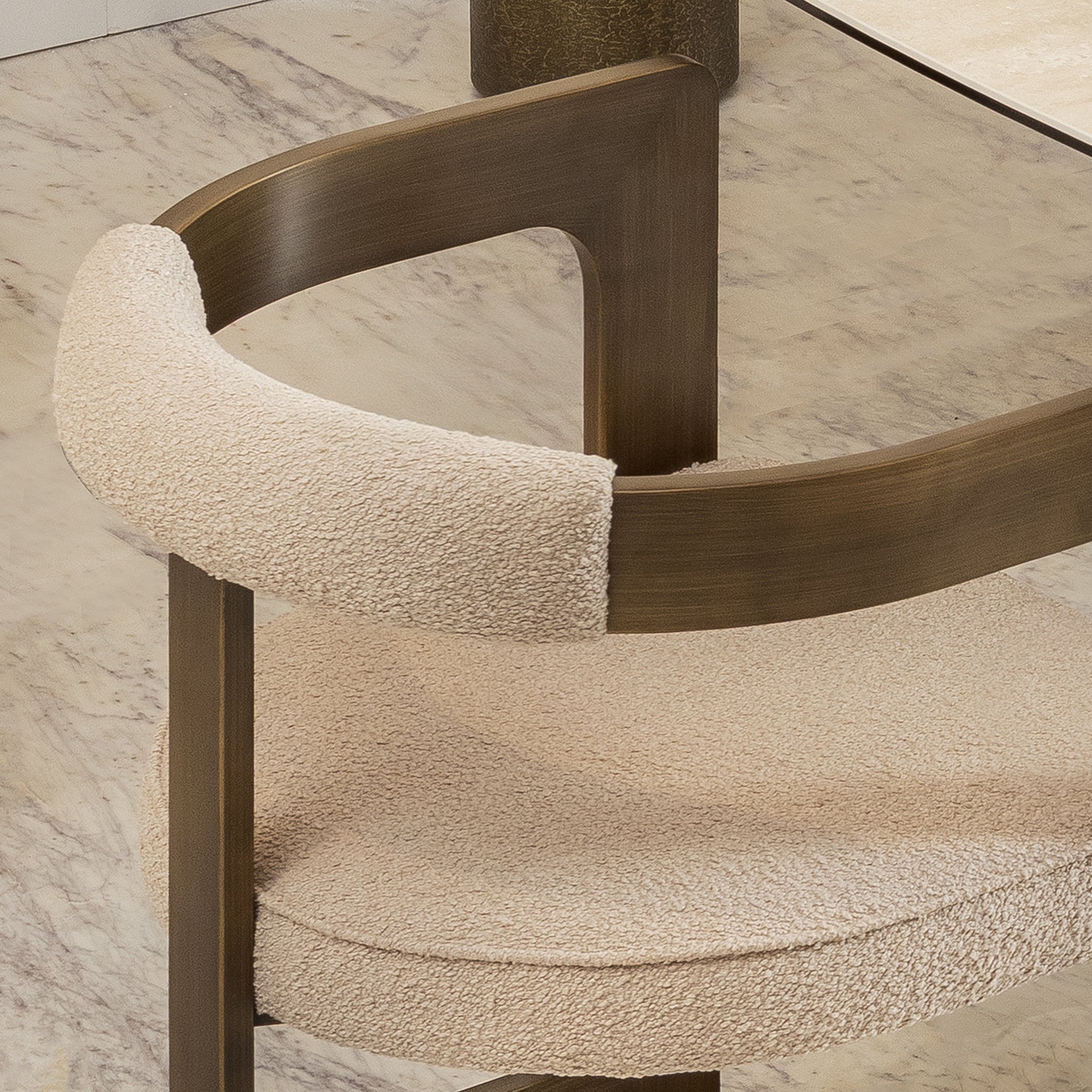 Upholstered in greige woven sheepskin fabric, the chair is built on a curved iron frame with an antique copper finish. The mix of fabric and metal gives it a modern and timeless look.