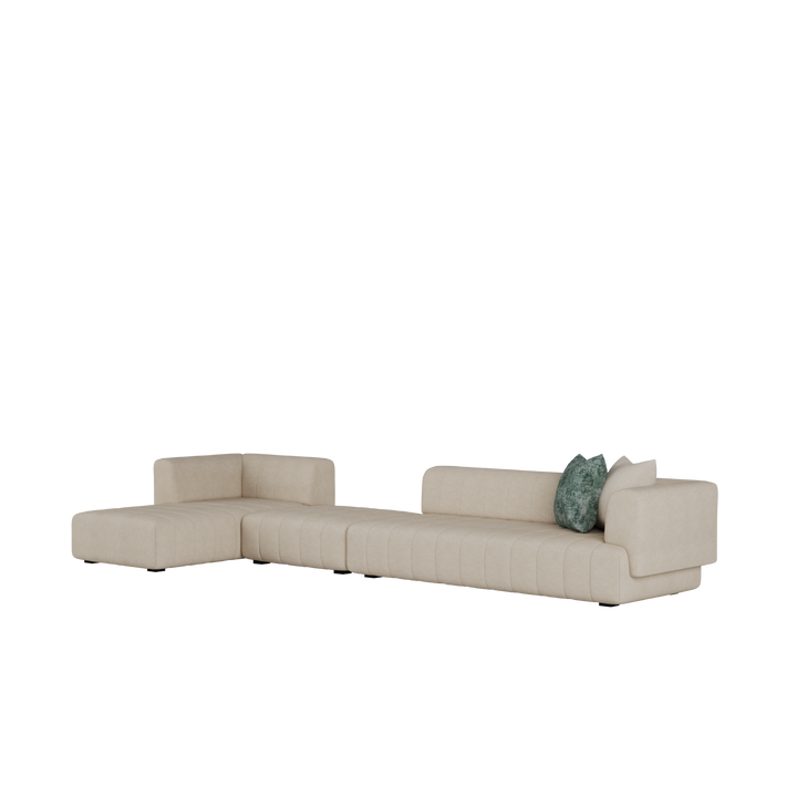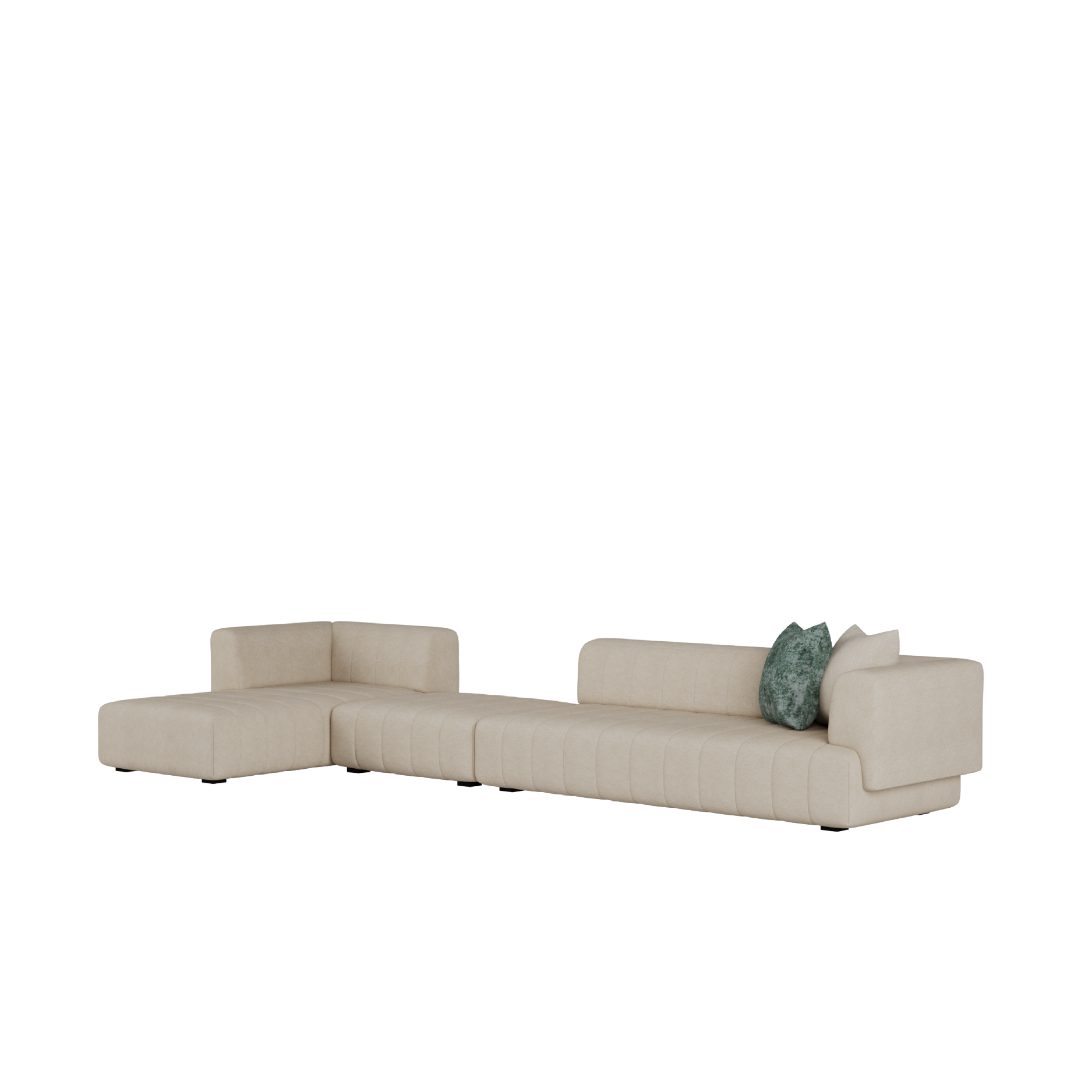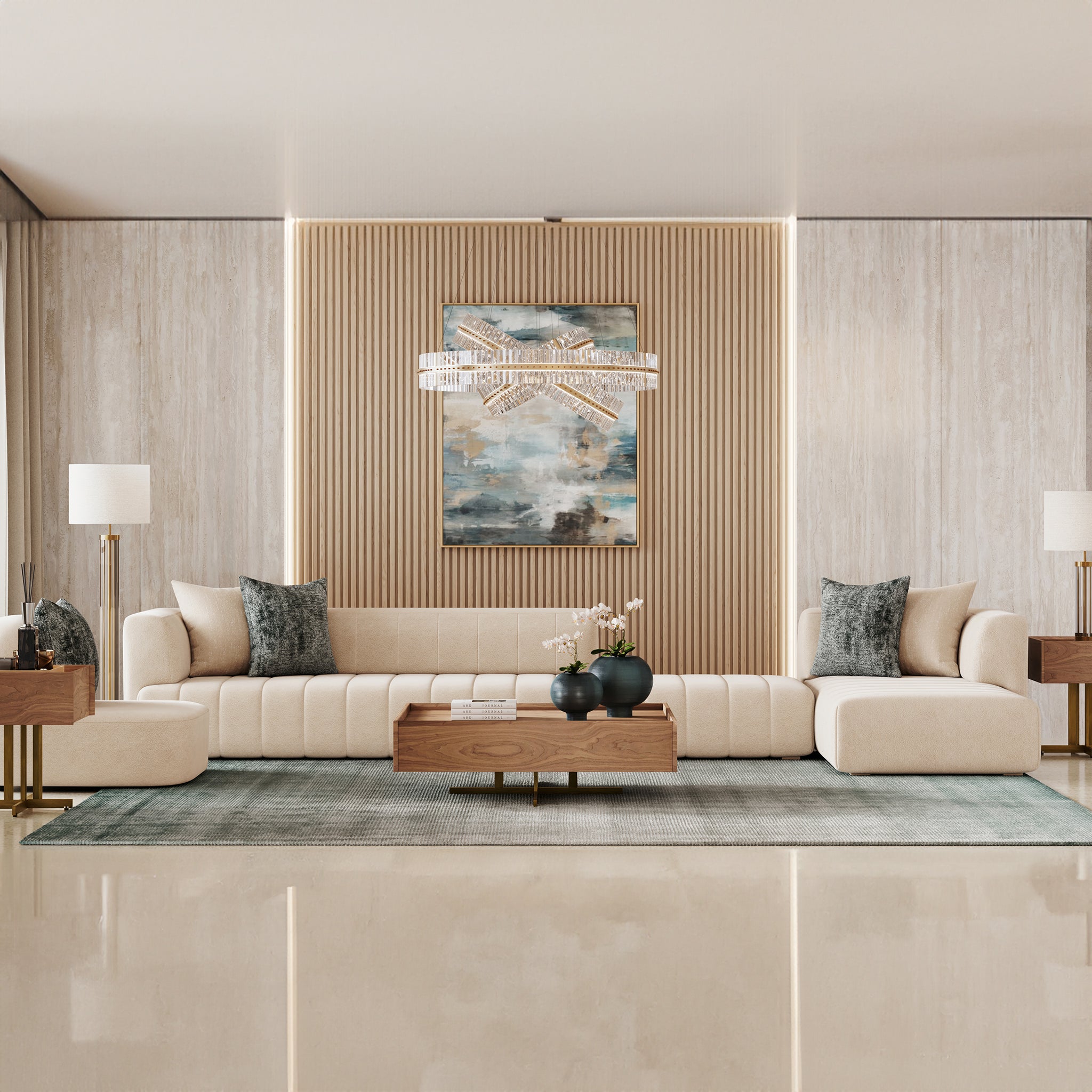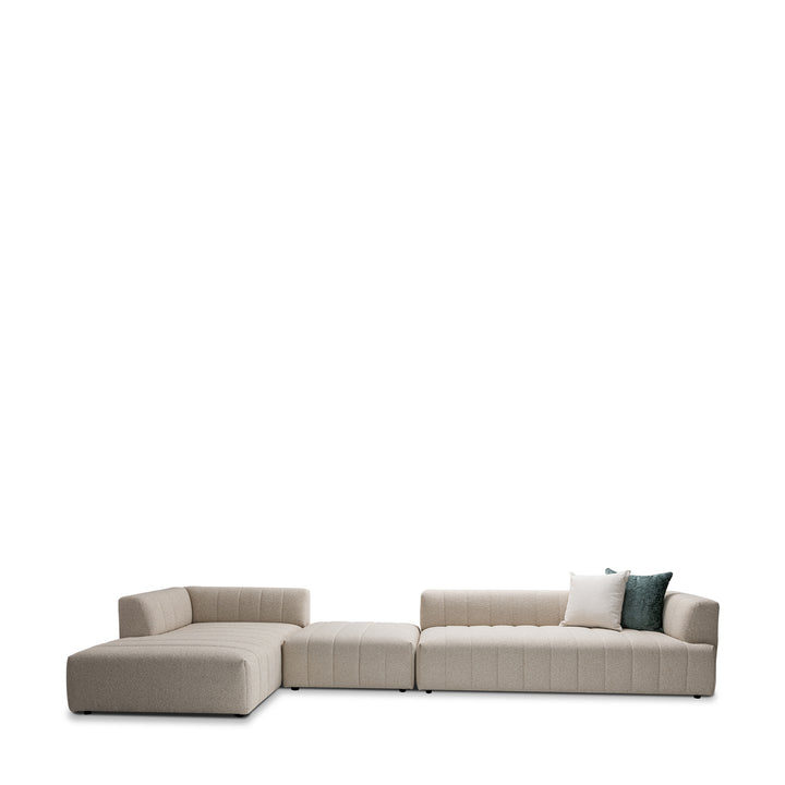 Upholstered in vista beige fabric, the sectional sofa offers a clean, modern look that works well in any space. It features subtle linear detailing on the seating, enhancing the overall design.