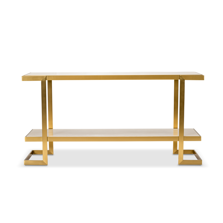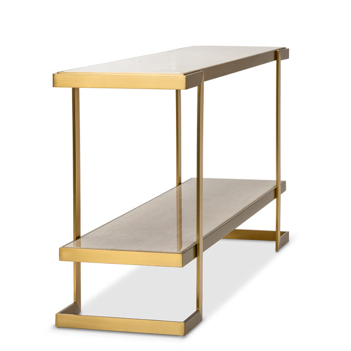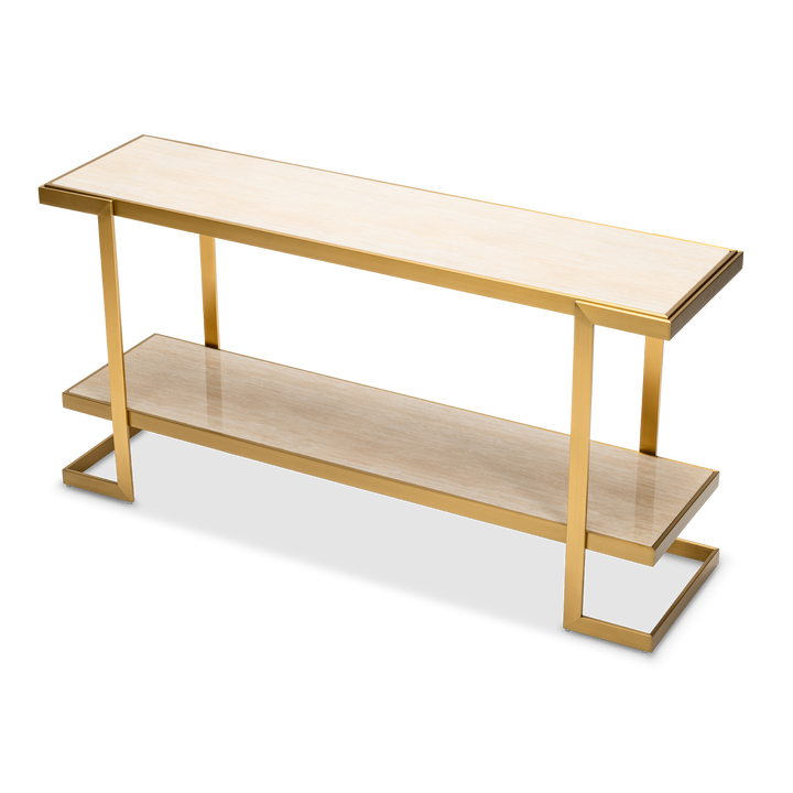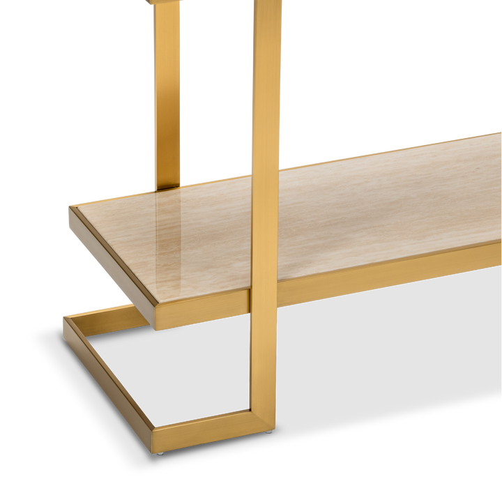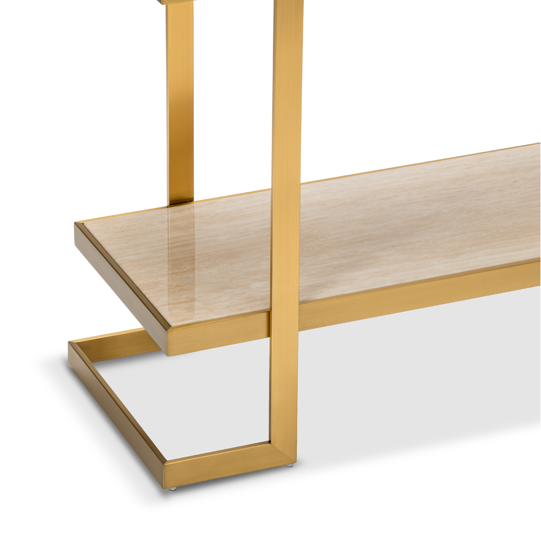 This Console blends natural beauty with modern design. Its beige travertine stone top and lower shelf offer a timeless look, while stainless steel legs in a brushed brass finish add a refined touch. A stylish and practical addition to any contemporary space.