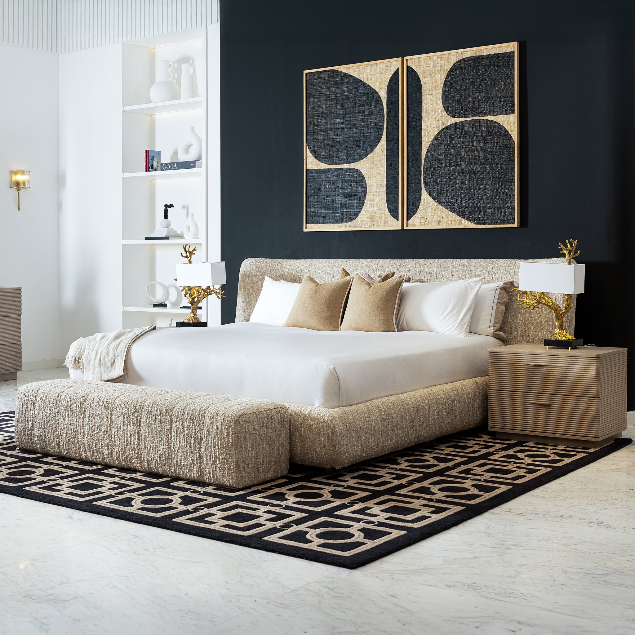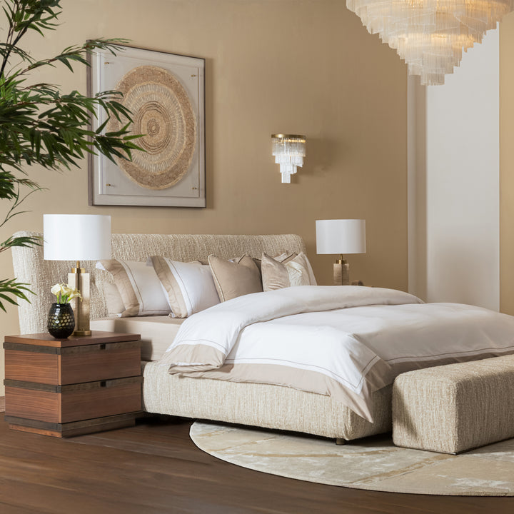 Upholstered in coco angora fabric, the headboard serves as a focal point that enhances the bed’s overall design. Stainless steel accents in an antique brass finish add a sophisticated, timeless touch perfect balance between style and comfort.