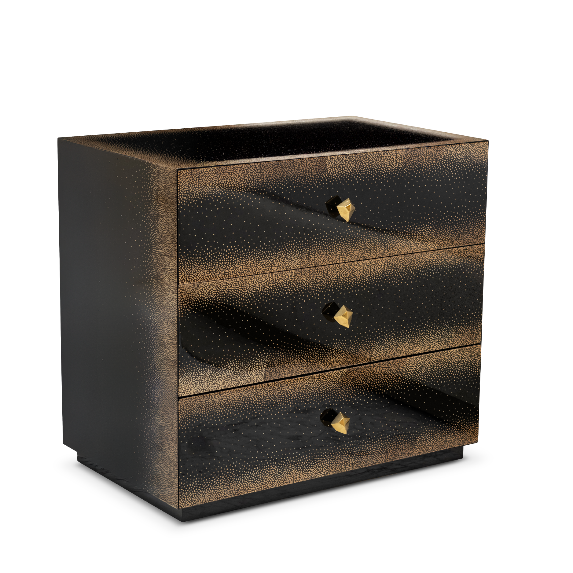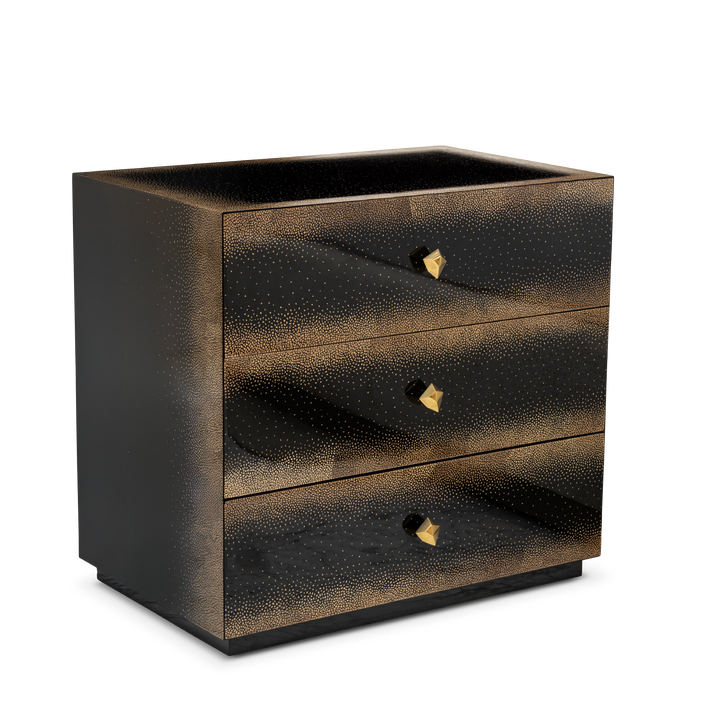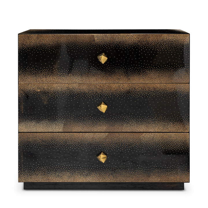 The body features an eggshell inlay with a glossy 10-step lacquer finish, showcasing skilled artisan craftsmanship and giving it a smooth, shiny look. The inner drawers are painted black, while polished brass knobs lend a timeless elegance that complements the piece's modern silhouette.