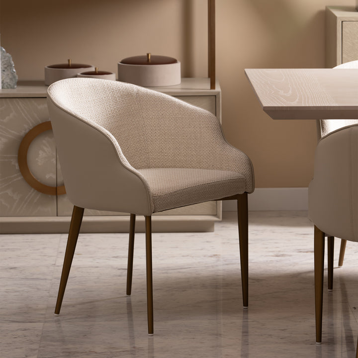 Upholstered inner backrest in oatmeal chenille offers an inviting feel, while the outer back is finished in beige faux leather. Sleek stainless steel legs in an electroplated brushed brass finish add a modern touch.