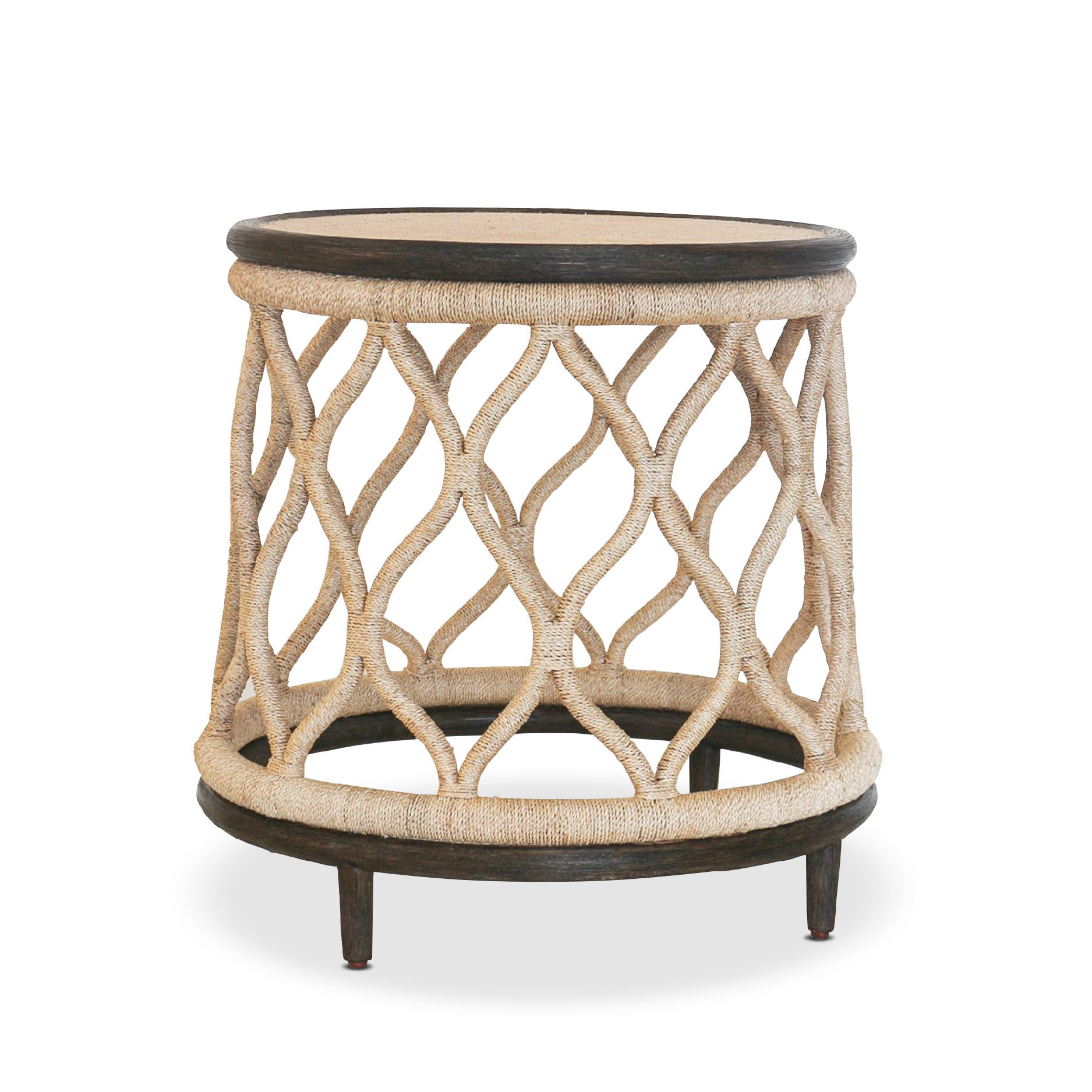 Saguran lamination in perca finish forms the top, paired with a rattan base in a matte espresso finish. Accented with a patterned frame wrapped in 3-4 mm abaca fiber woven rope.