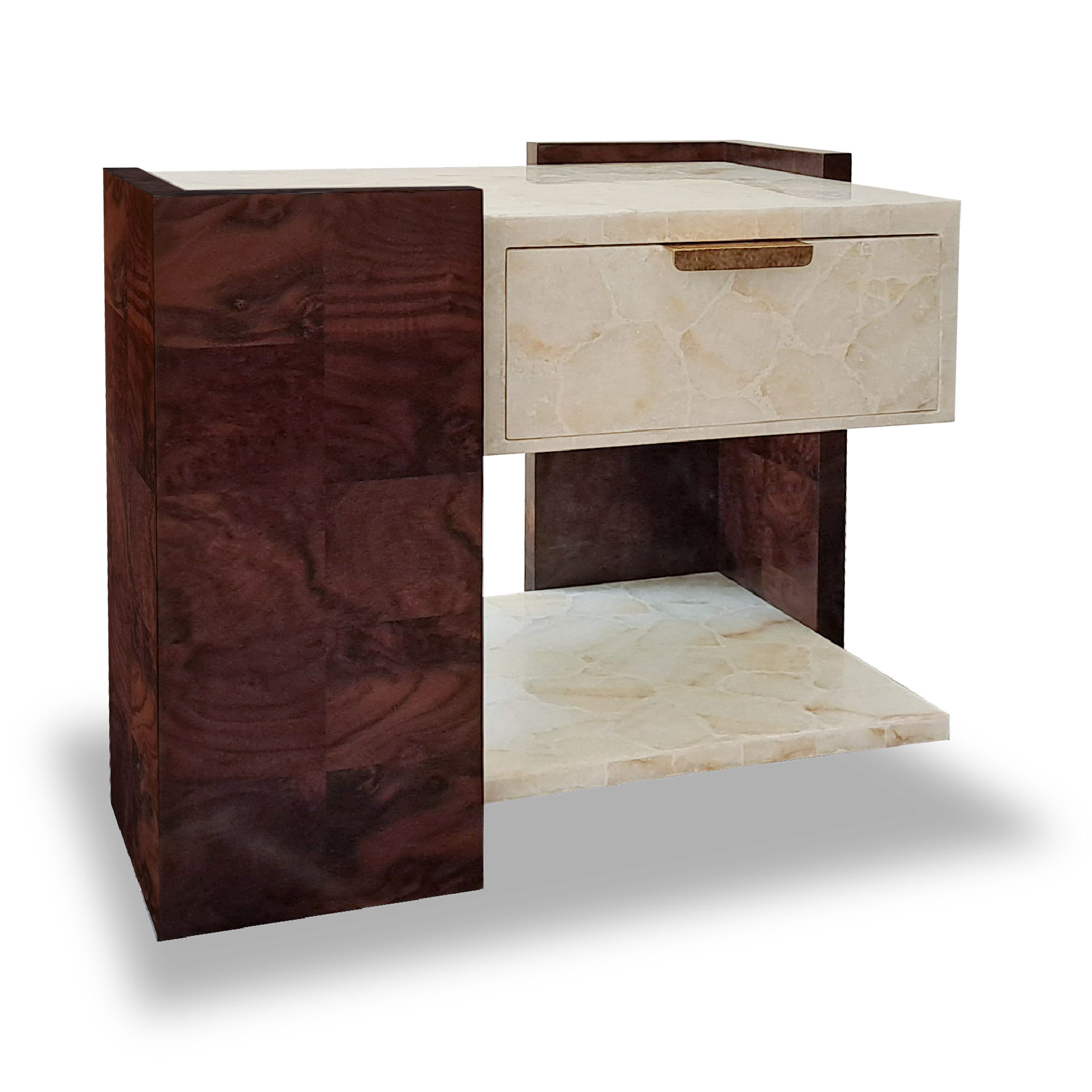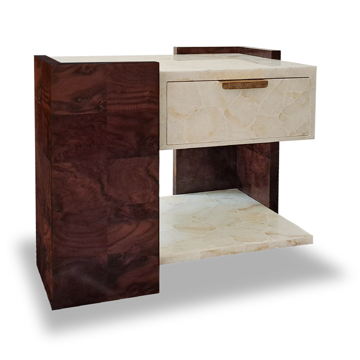 The top and bottom shelves are crafted from crazy-cut crystal stone in a polished finish, sourced from the southern Philippines, offering a surface that instantly elevates any space.Its base is made from walnut burl in a matte finish, arranged in a checkered marquetry pattern.