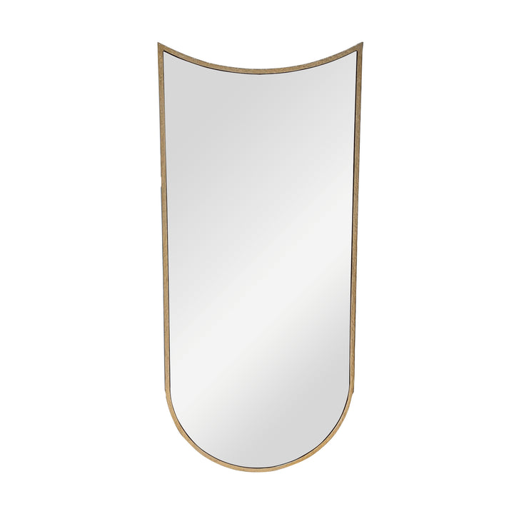 The concave frame is made of casted metal with an antique brass finish. Its curved shape gives it a distinct look on the wall. A bevelled clear mirror adds a clean and refined touch.