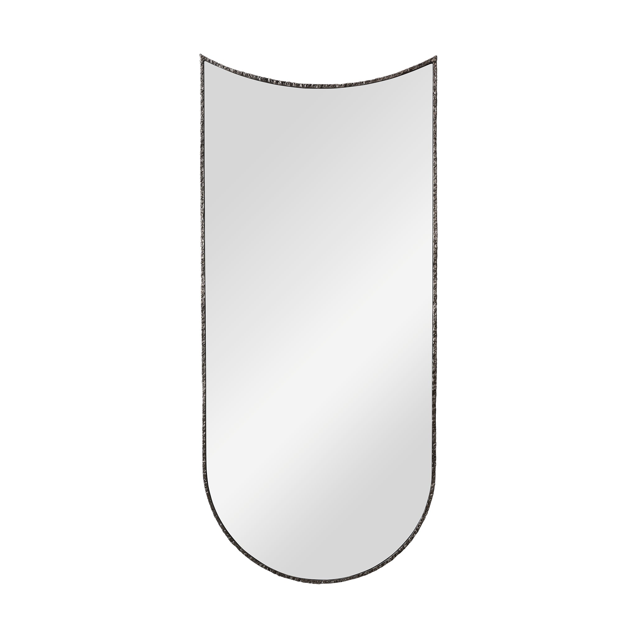 A sculptural concave form lends depth and intrigue to the wall, blending bold geometry with subtle elegance. The casted metal frame in textured pewter highlights artisanal craftsmanship with a modern edge. A beveled clear mirror completes the design, reflecting light with refined sophistication.