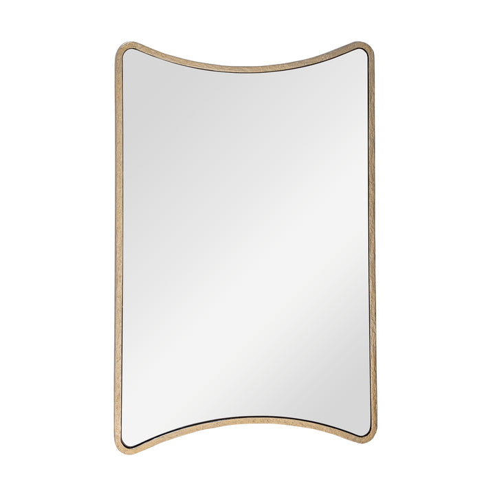 This mirror features casted metal frame finished in textured antique brass finish. The curved form creates a sculptural look that feels unique. A bevelled clear mirror enhances the design and makes it both functional and decorative.