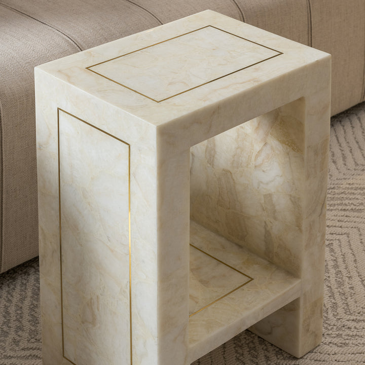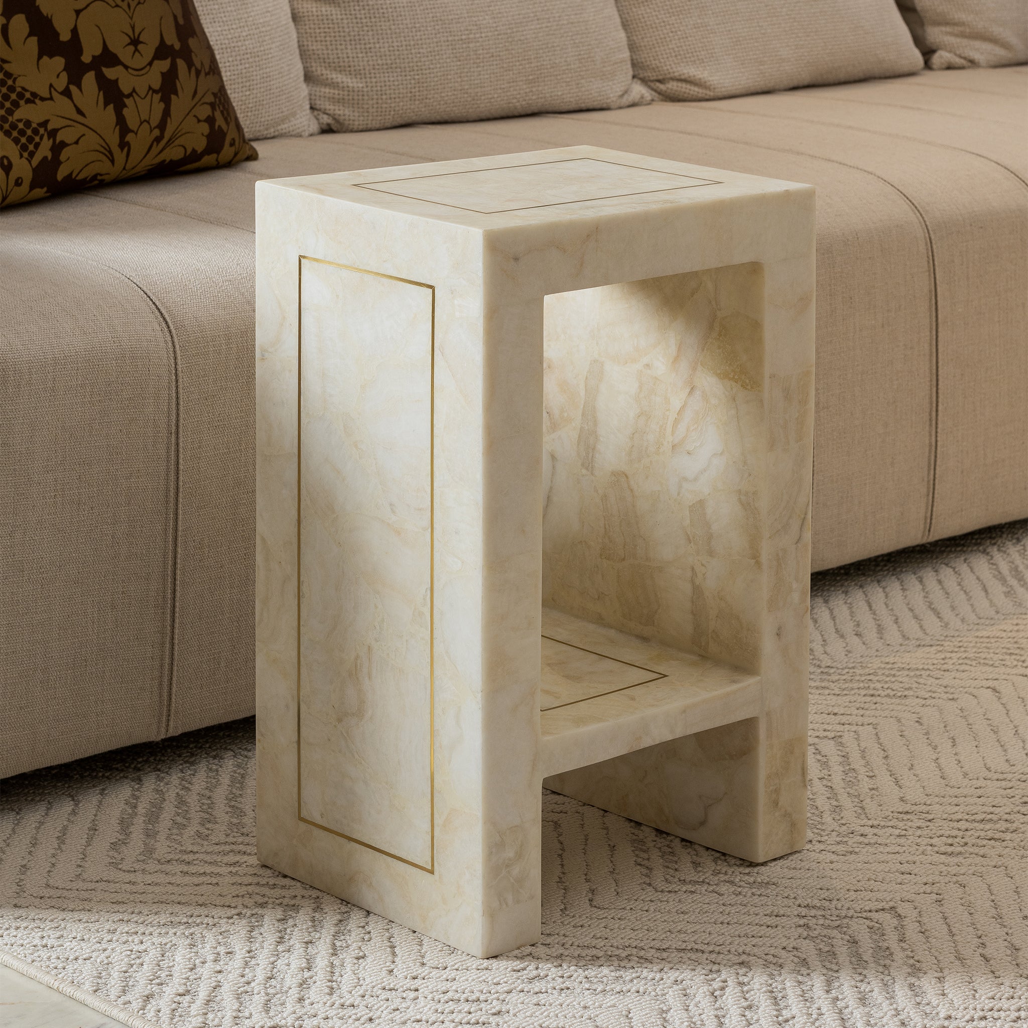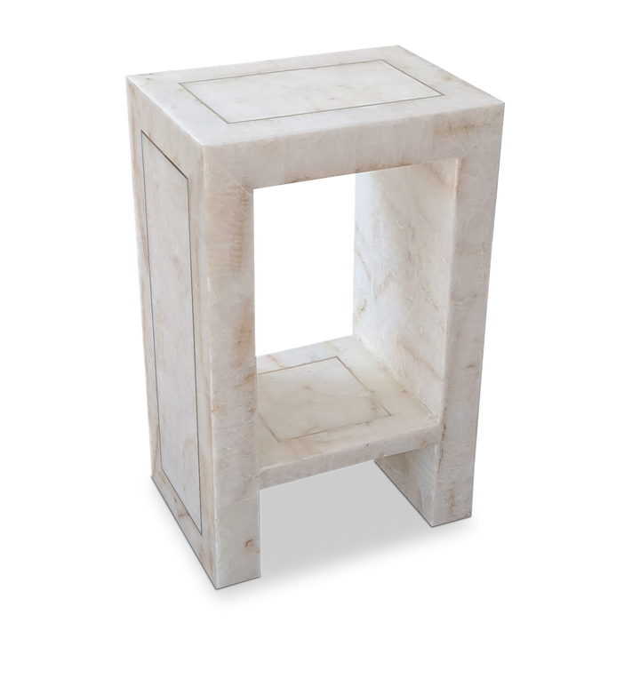 This piece is crafted from crazy-cut crystal stone, showcasing natural depth and variation. Its sculptural form is accented with brass string line inlay for a touch of refinement. Modern classic in style, it offers a timeless presence for sophisticated interiors.