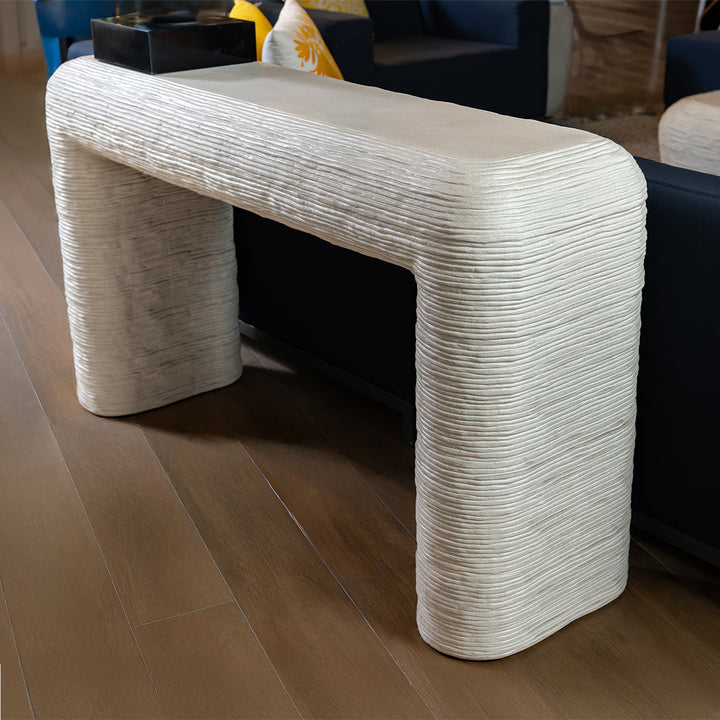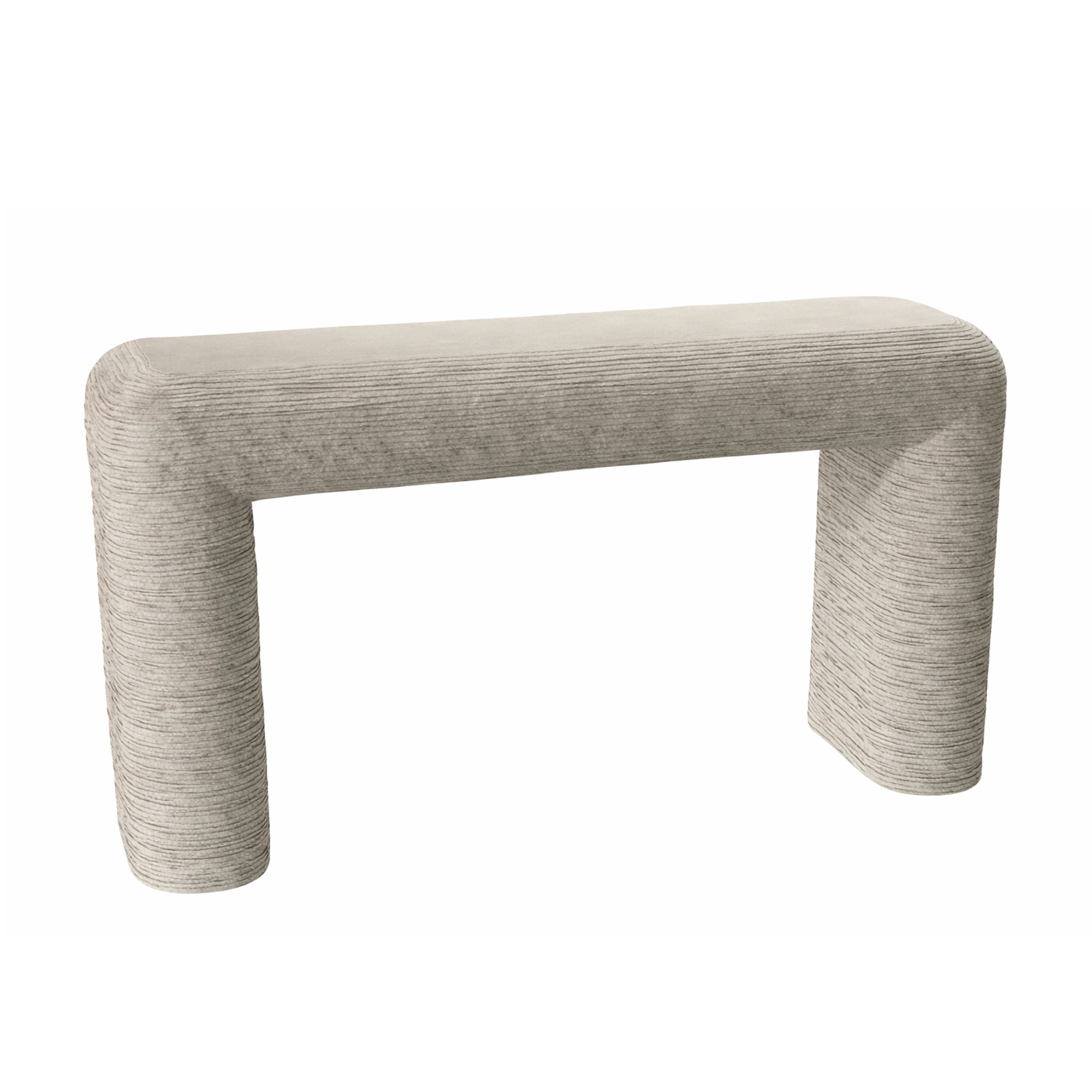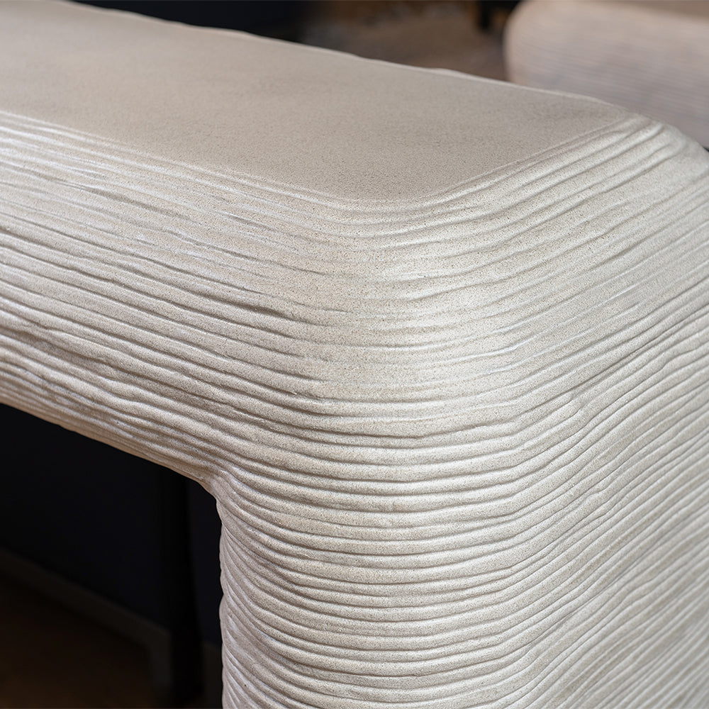 Inspired by monolithic stone forms, this sculptural console table is defined by its seamless silhouette and softly curved edges. Expertly crafted from glass reinforced concrete, it offers exceptional durability for both indoor and outdoor settings. The raked linen texture showcases subtle, uneven linear detailing, giving the surface a distinctive and artisanal character.