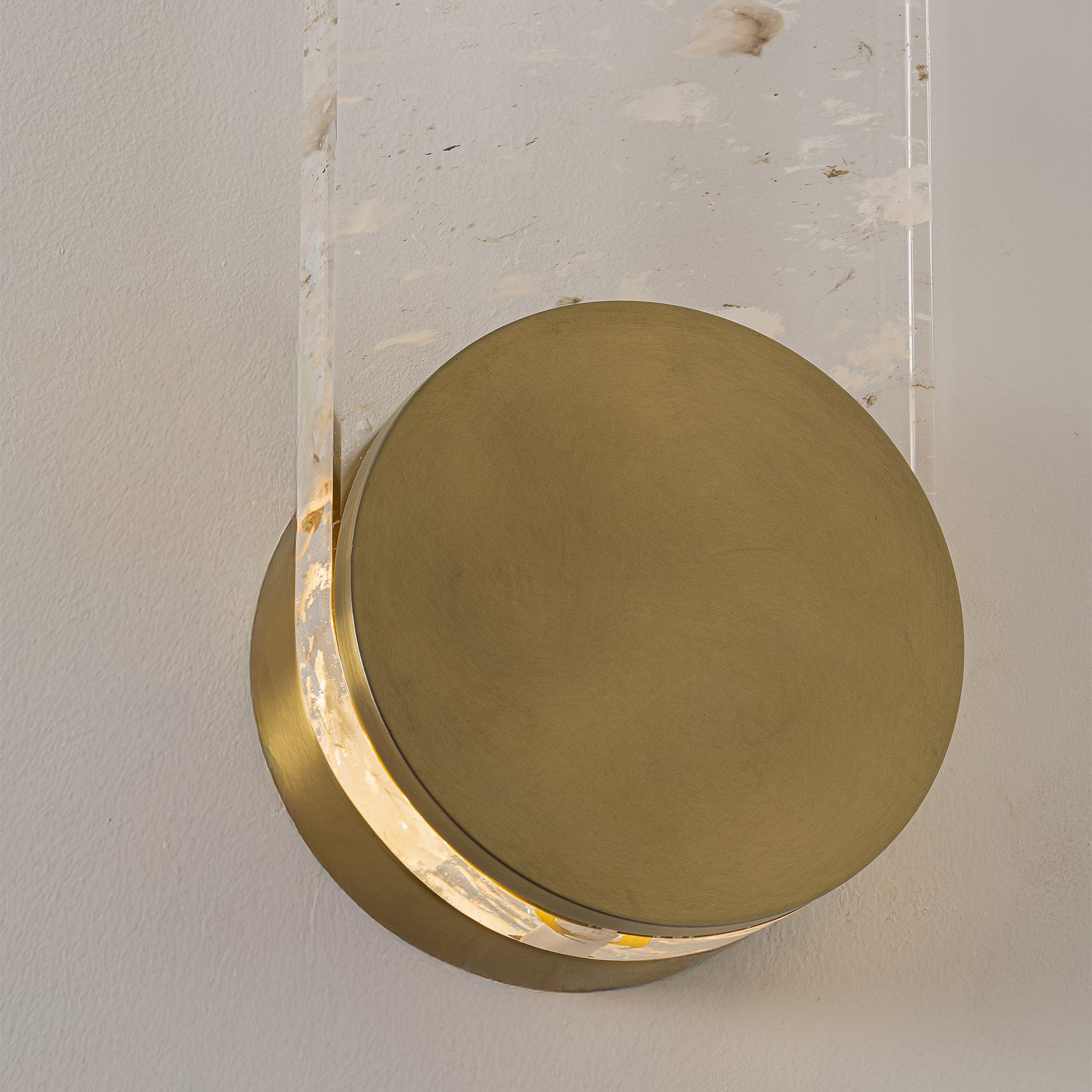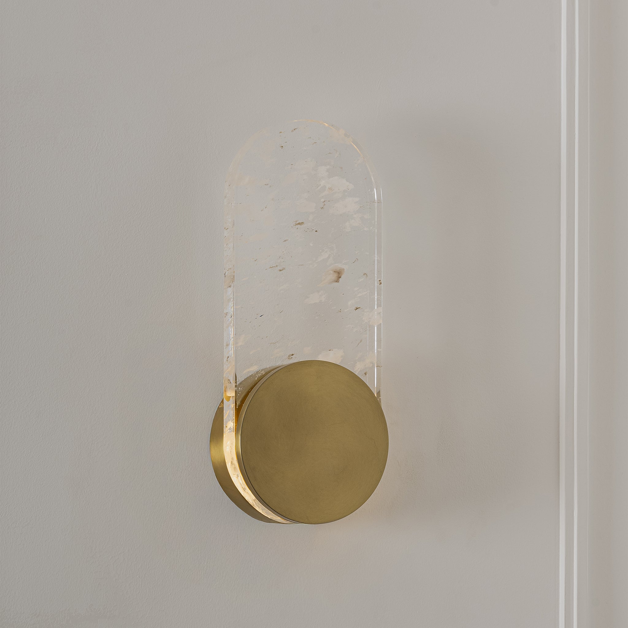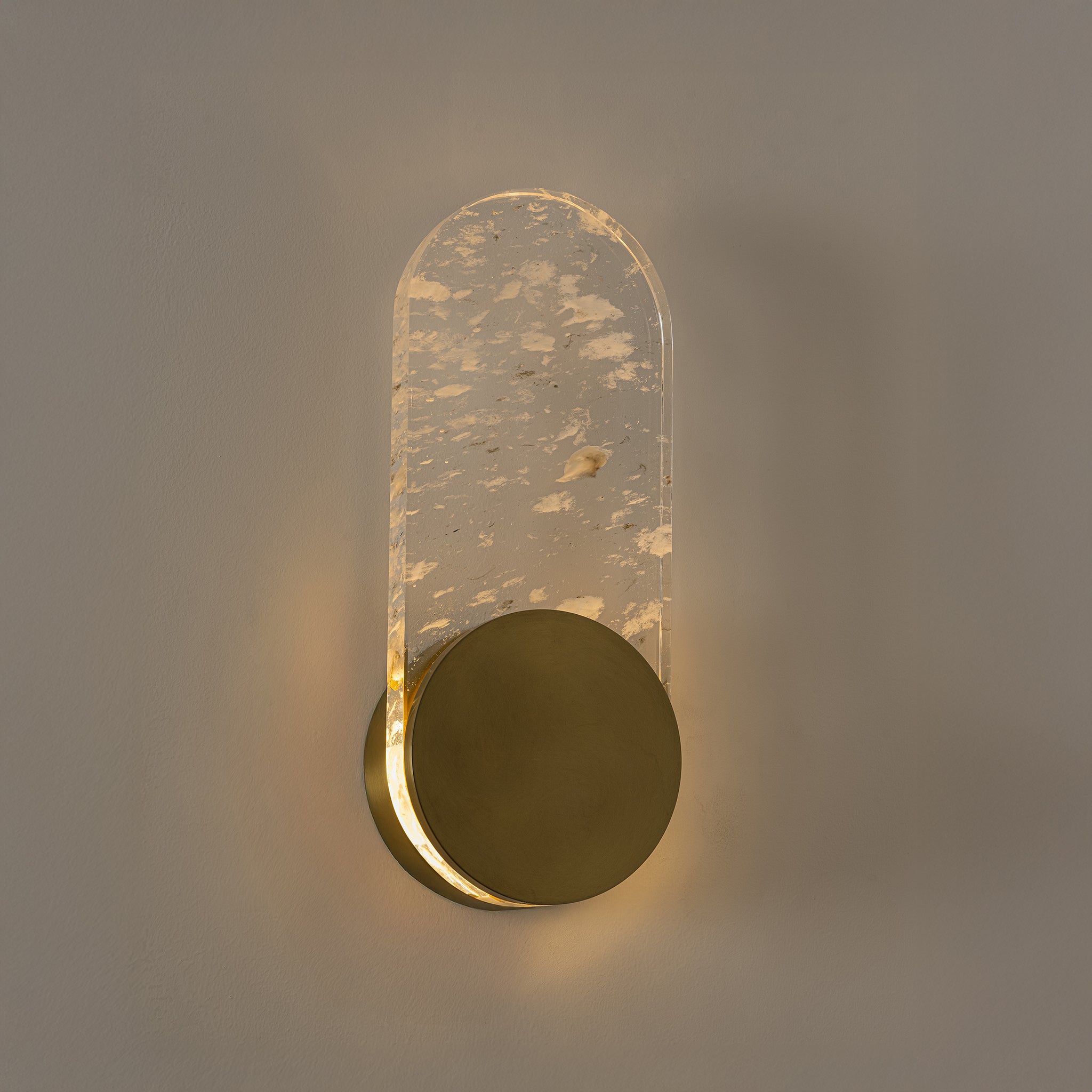 A refined blend of crystal and steel defines this wall lamp, accented with an antique brass finish for a timeless touch. Its circular form and the surface create a balanced composition.