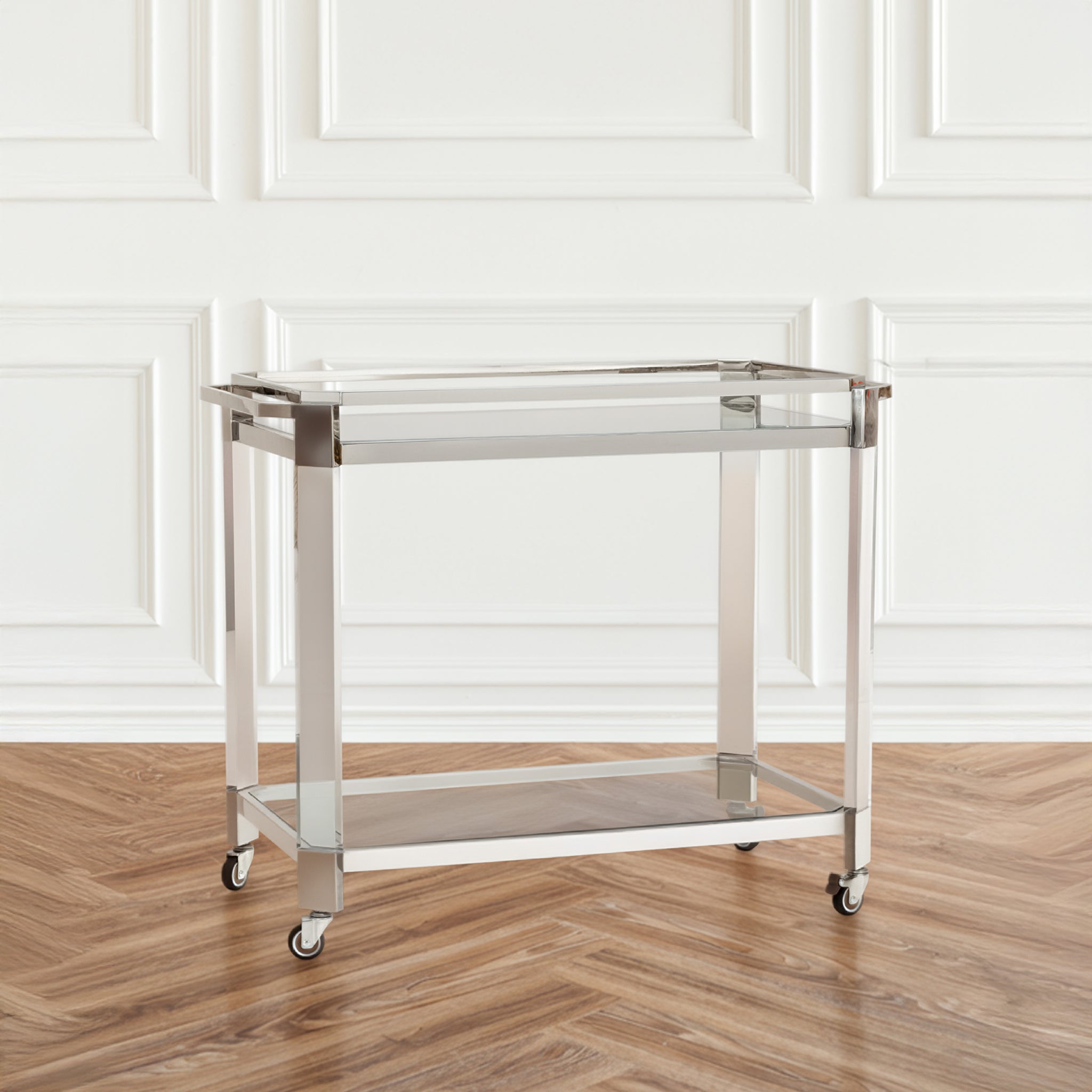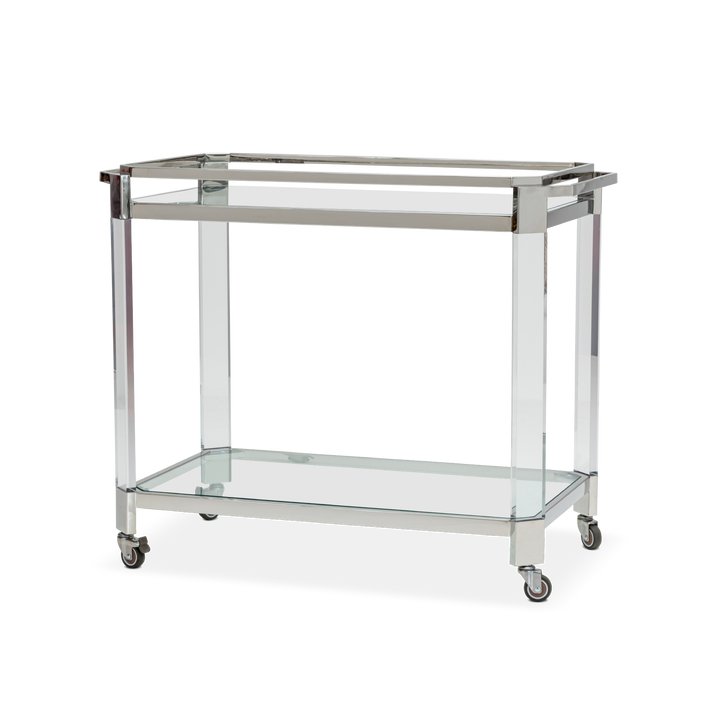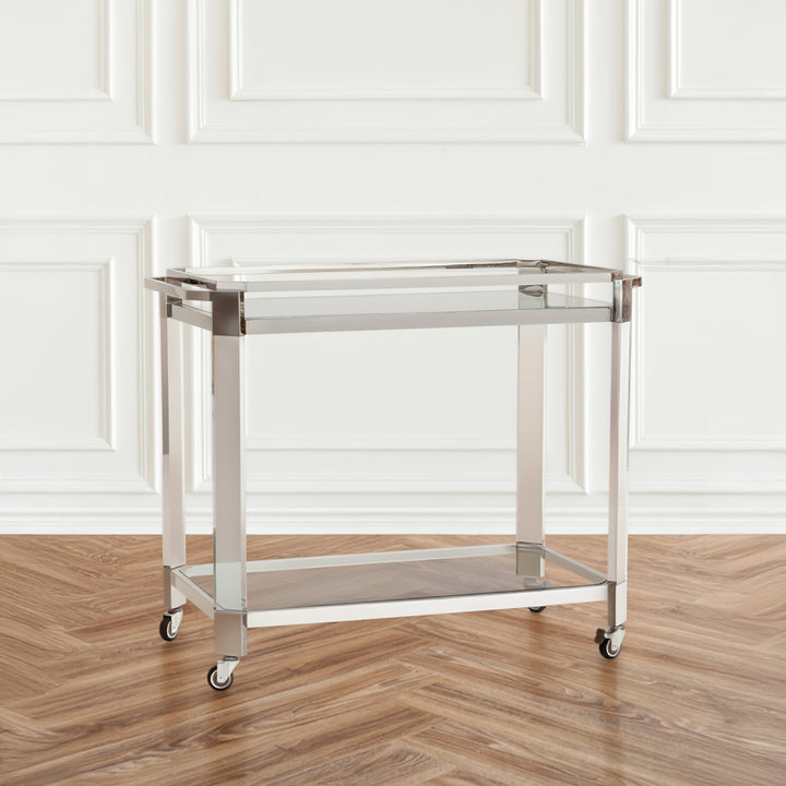 Sleek and functional, this bar cart captures the essence of modern design with 10mm clear glass shelves and a polished nickel stainless steel frame. The open structure emphasizes simplicity and balance.