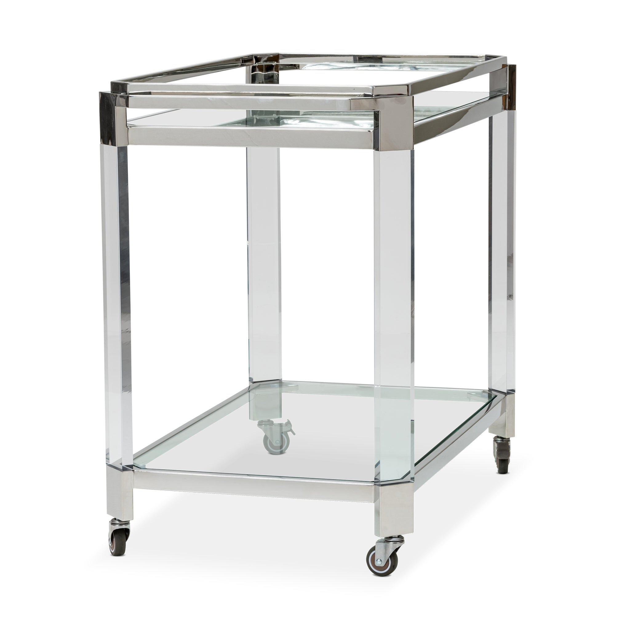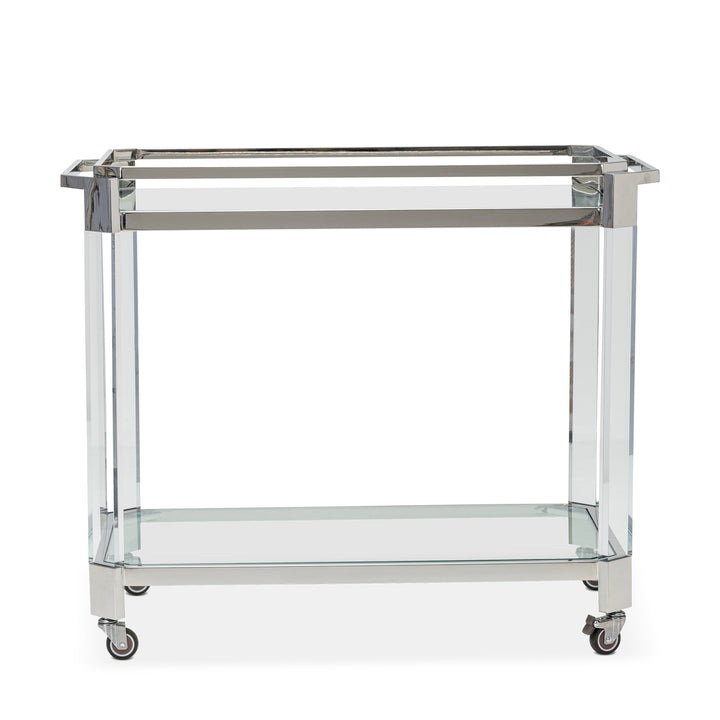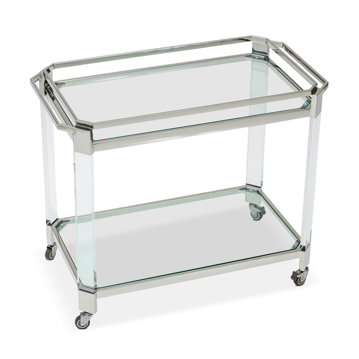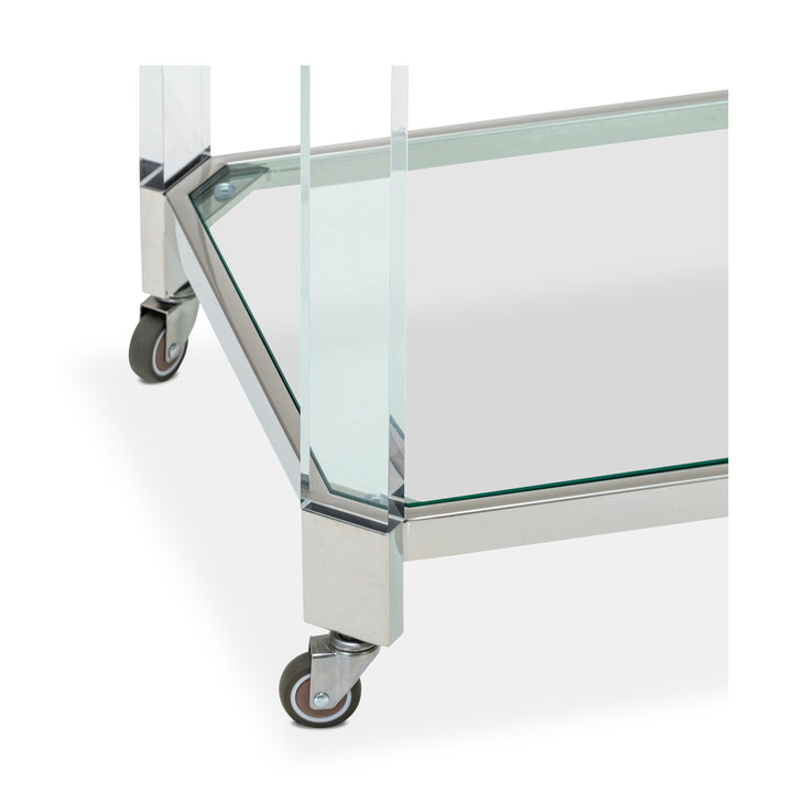 With clear 10mm glass shelves and a polished nickel stainless steel frame, this piece offers a sleek, modern look. Clear acrylic legs and black castors in silver frames complete the design with style and mobility.
