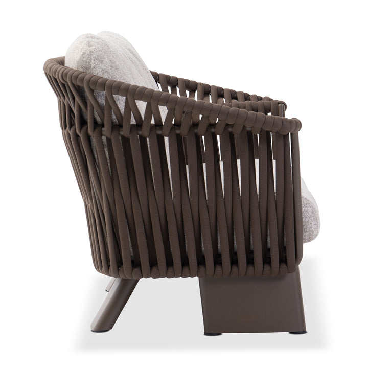 The 3-seater sofa makes a refined statement in outdoor living. Wrapped in rich, chocolate-toned cocoa fabric, it resists the elements with effortless style. A powder-coated aluminum frame supports plush quick-dry cushions, while the sculptural mocha weave, a wide vertical rope detail, adds tonal texture. Thick, structured legs in aluminum anchor the piece with bold, architectural stability.