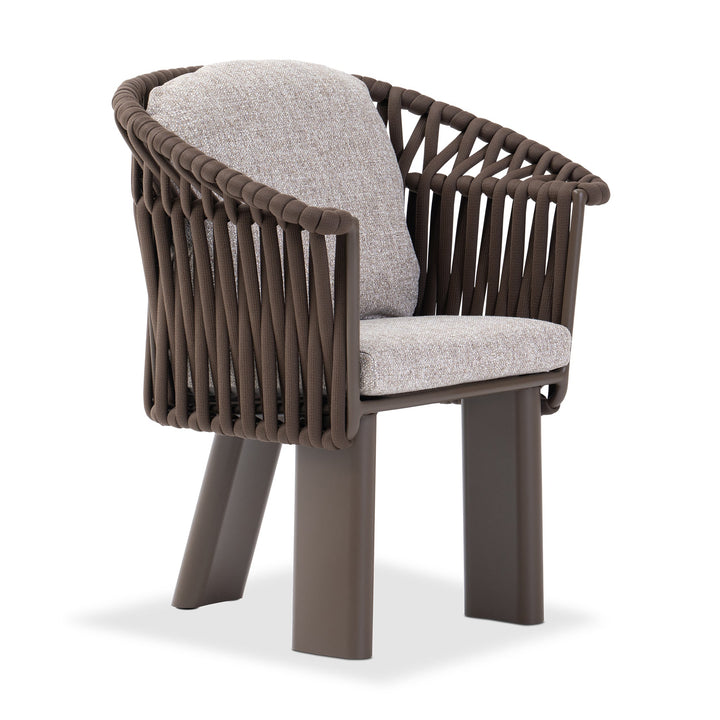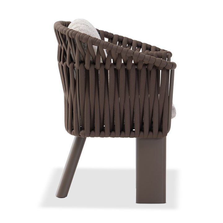 Upholstered in chocolate-toned cocoa fabric and supported by a powder-coated aluminum frame, it offers plush, quick-dry cushions designed for enduring comfort. The signature mocha weave and sculptural legs lend a grounded elegance that seamlessly ties into the crown collection.