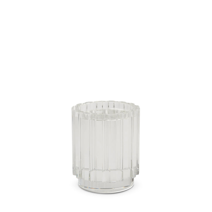 Sculpted from clear crystal, this candle holder embodies the elegance of art deco design with its precise geometric contours. Each vertical facet enhances the light’s refraction, casting a subtle yet captivating radiance.