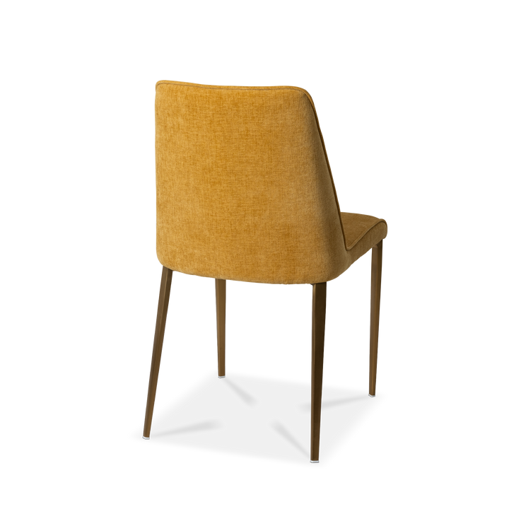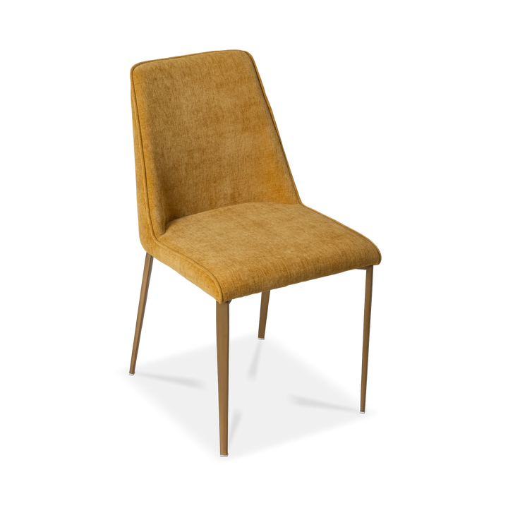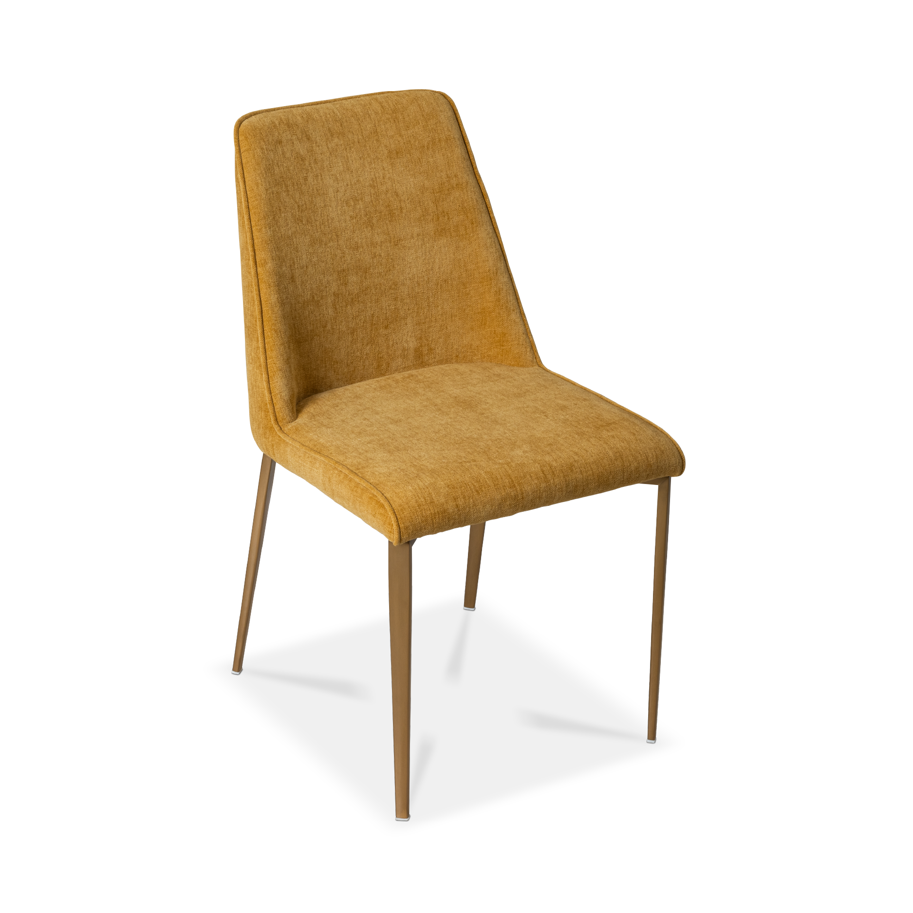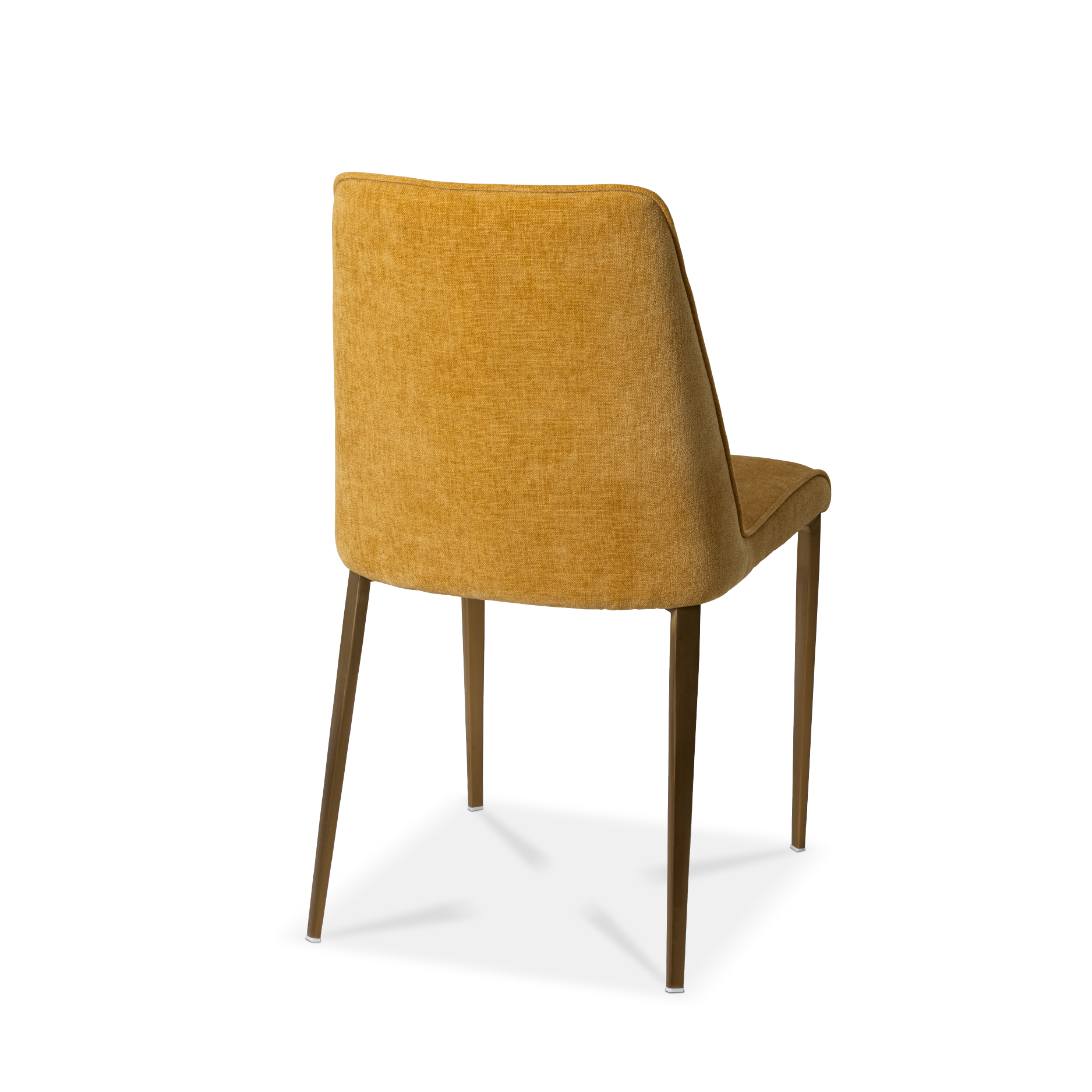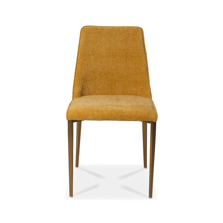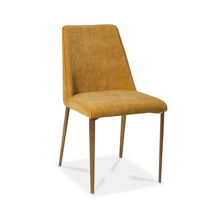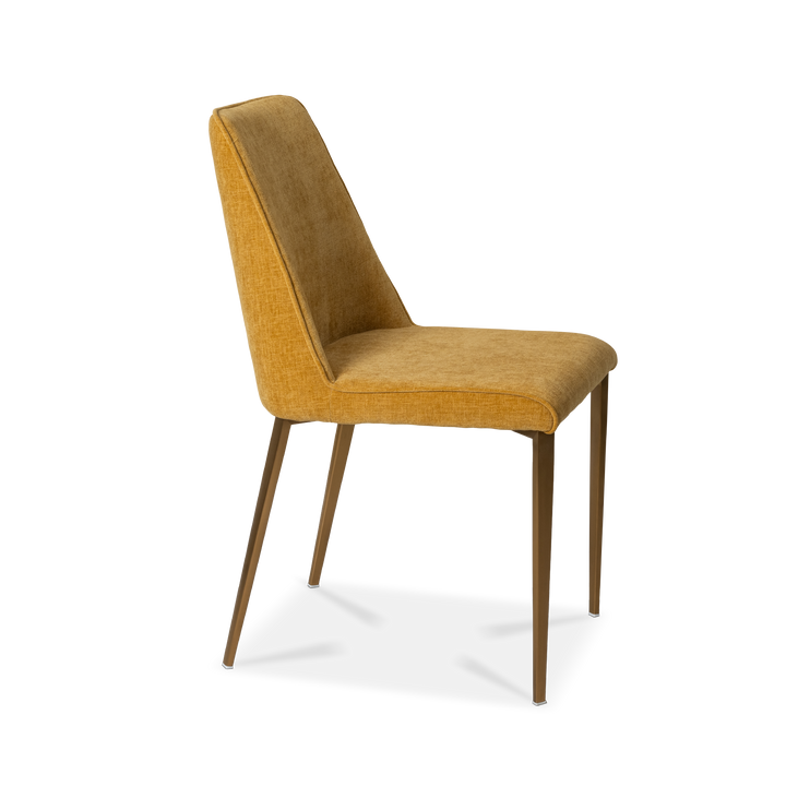 Upholstered in gaspar calendula fabric, this chair exudes modern sophistication with its refined armless silhouette. Brushed brass-finished stainless steel legs and contrasting tones make it ideal for contemporary dining spaces.