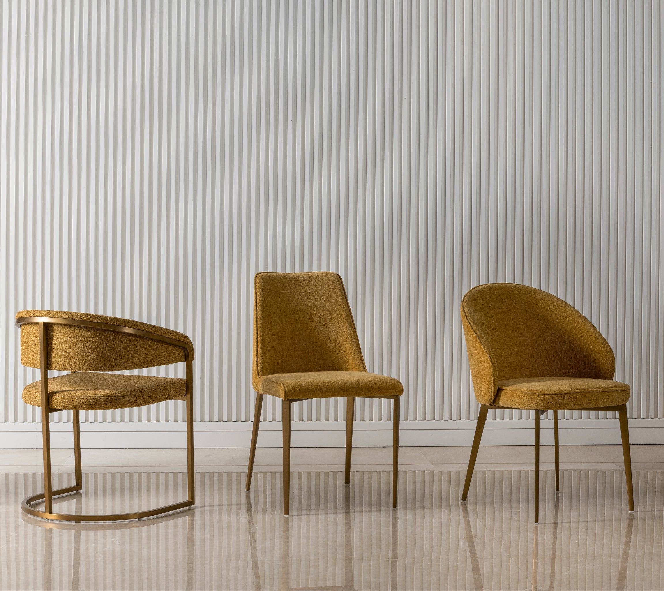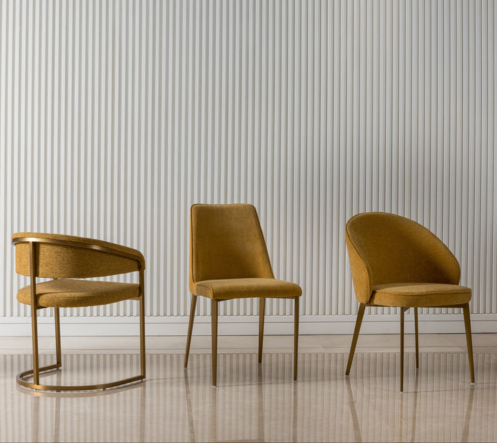 Upholstered in gaspar calendula paired with sturdy stainless steel legs finished in brushed brass. The warm brass tone contrasts beautifully against the fabric, creating a balanced and sophisticated armless design perfect for elevating any dining space.