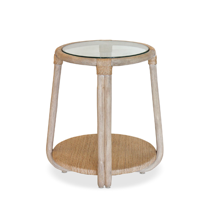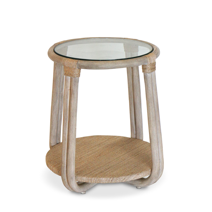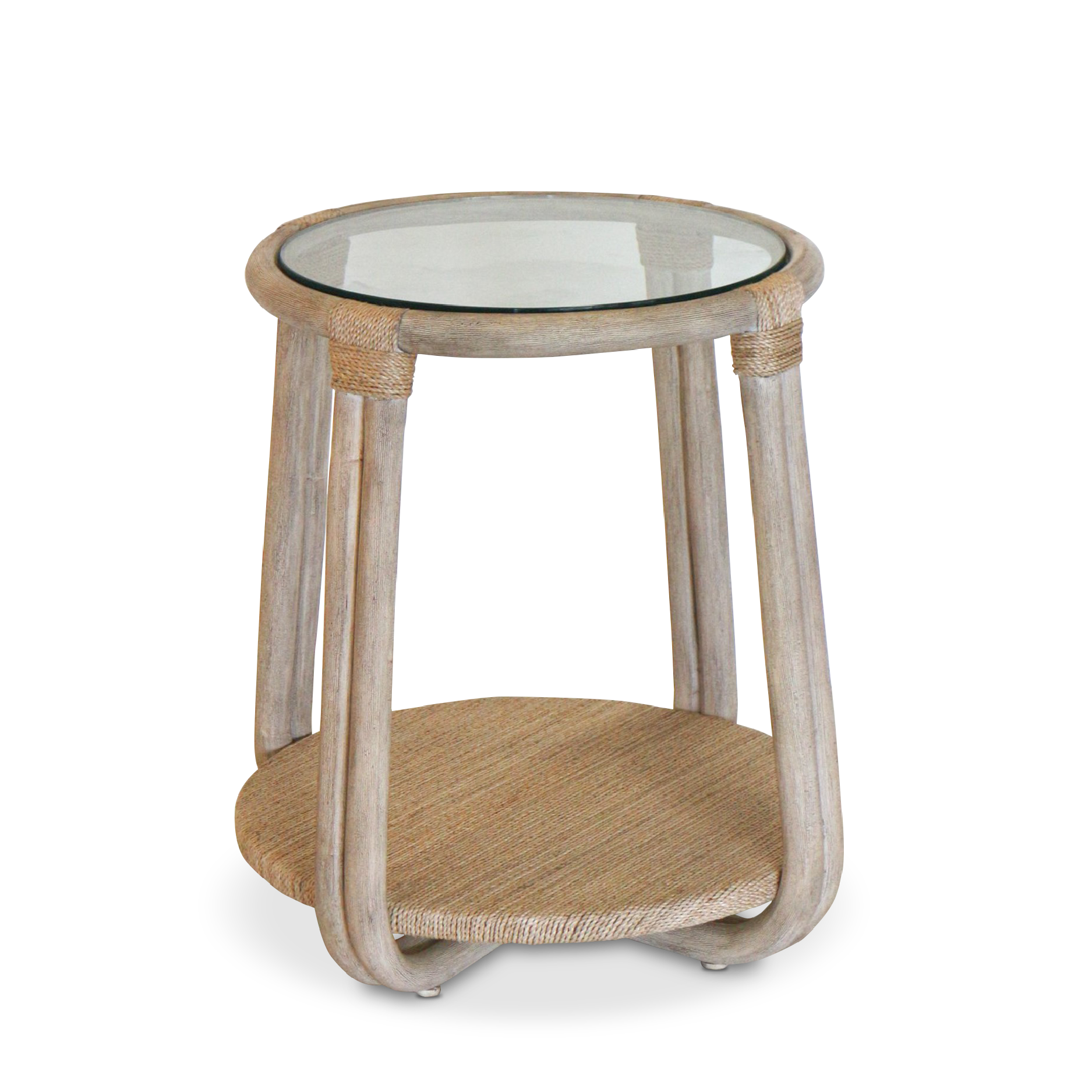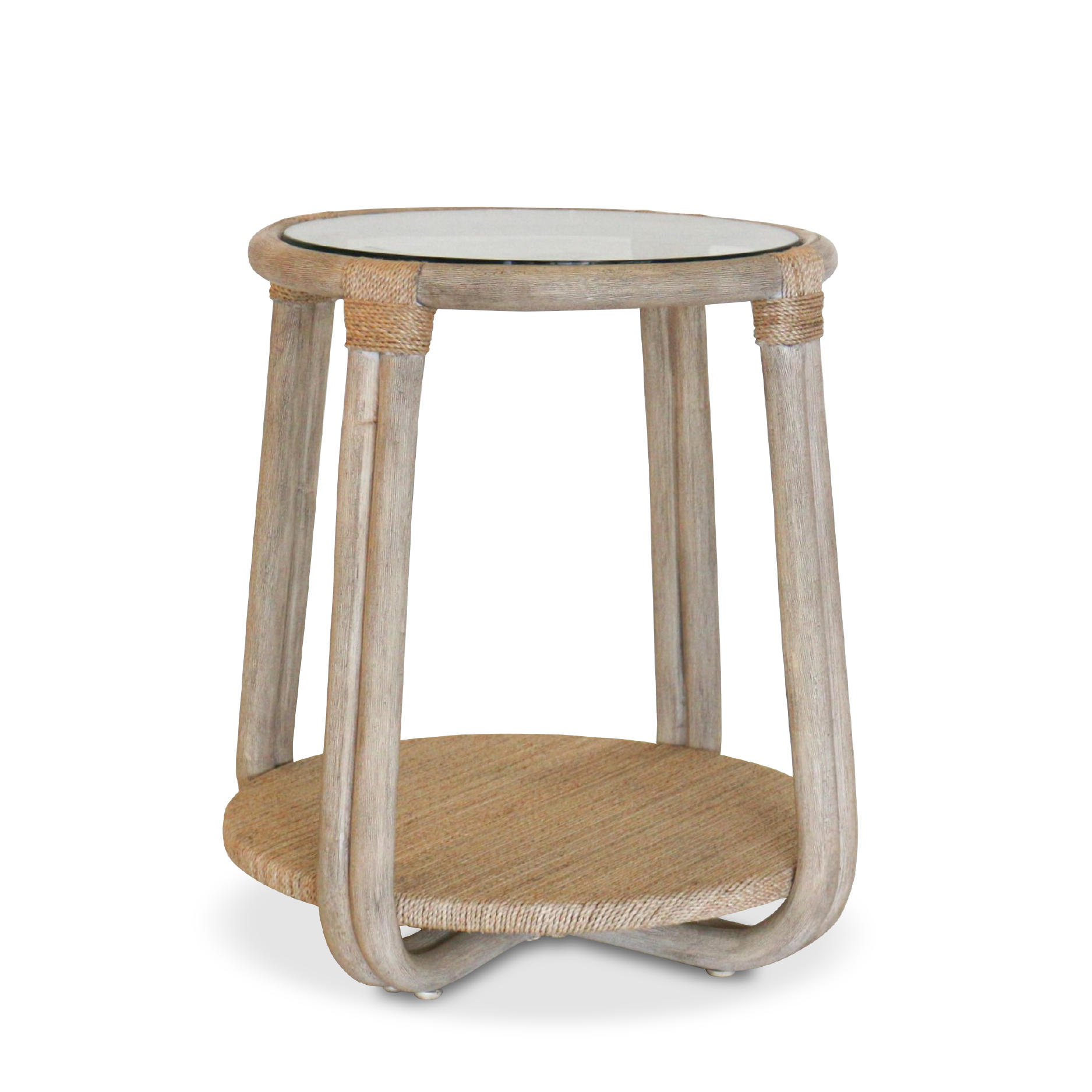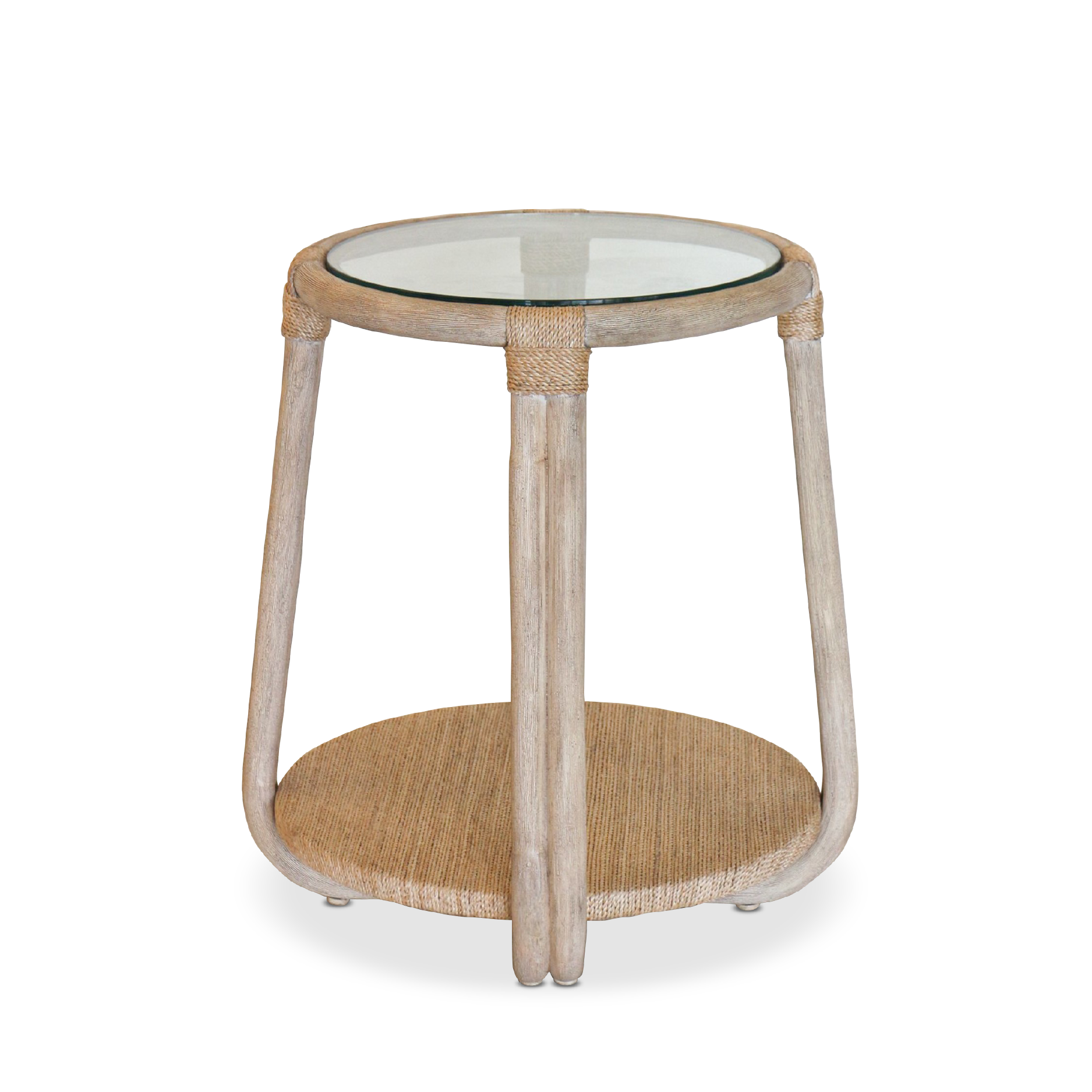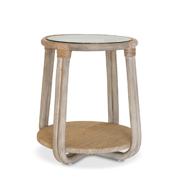Top surface made of clear glass, providing a sleek and transparent look. Bottom shelf crafted from laminated saguran. Base constructed from rattan frame with a matte ceruse white finish offering a natural appearance for the overall design.