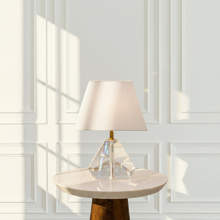 Celebrating timeless glamour, this lamp unites a sculptural crystal base with a bold geometric form. Subtle metallic detailing adds depth and contrast, completing the look with the elegance of art deco.