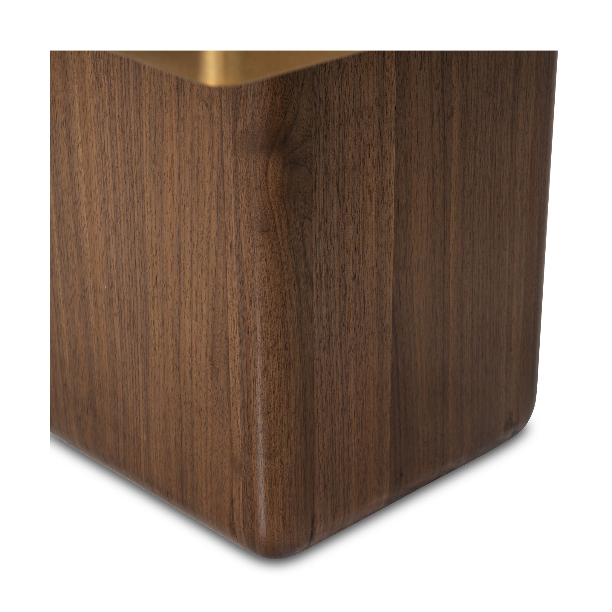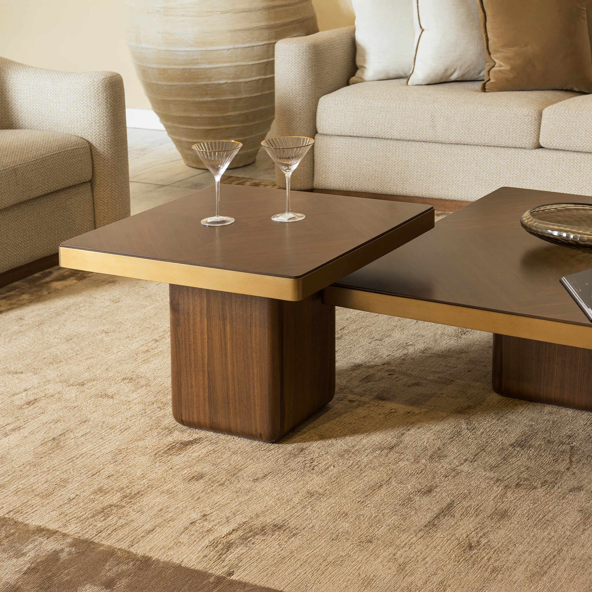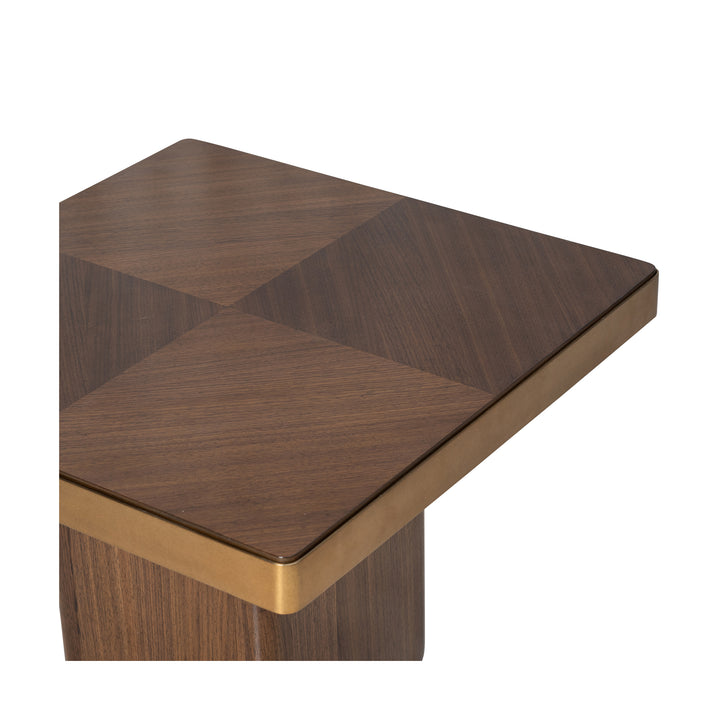 A bold square silhouette showcases warp marquetry on top in midtone walnut, highlighting the natural beauty of the veneer. A brushed antique brass band frames the top, adding depth and contrast to the design.