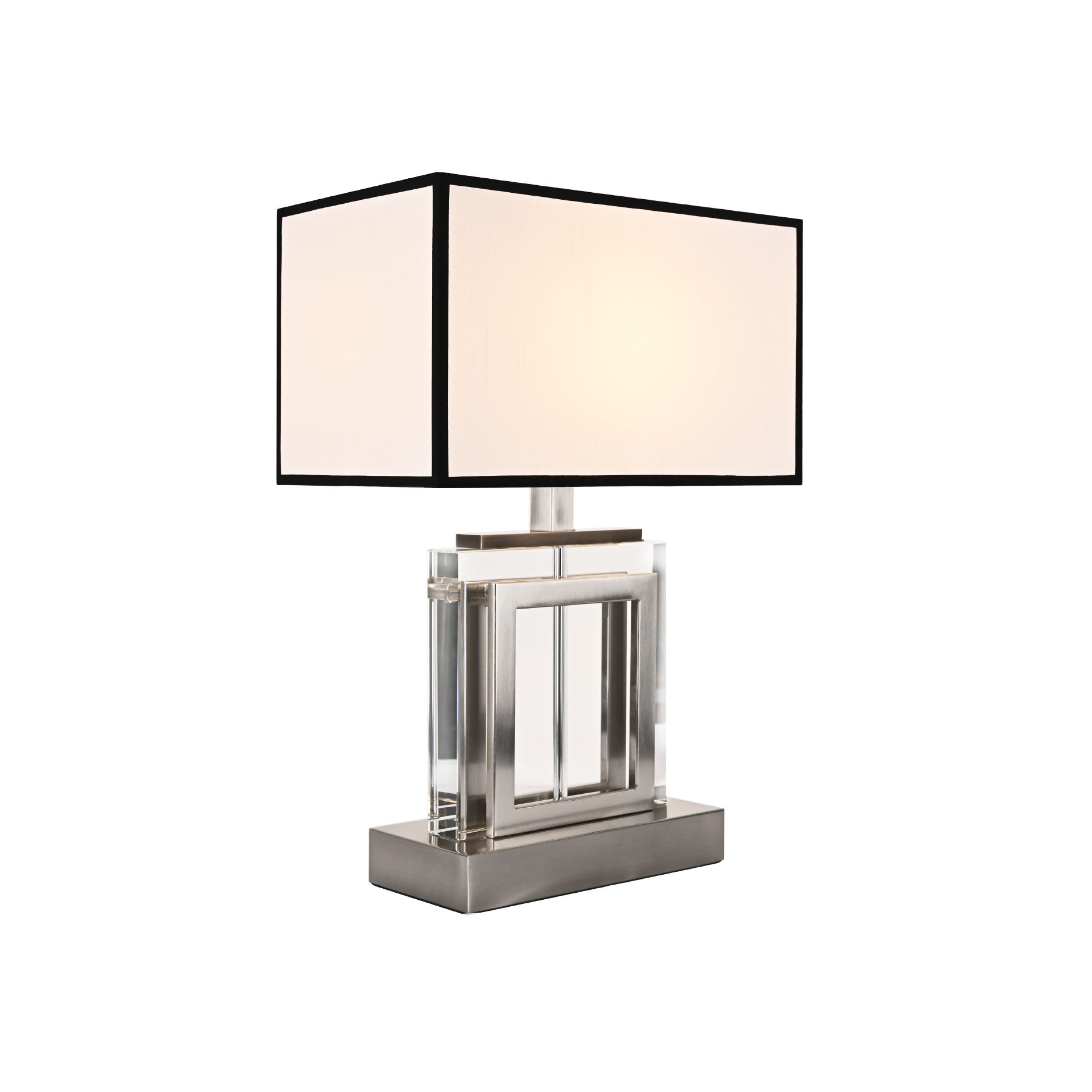 Inspired by iconic art deco architecture, this table lamp showcases a geometric crystal and steel base in a sleek nickel finish. A timeless piece that adds glamour and sophistication to any space.
