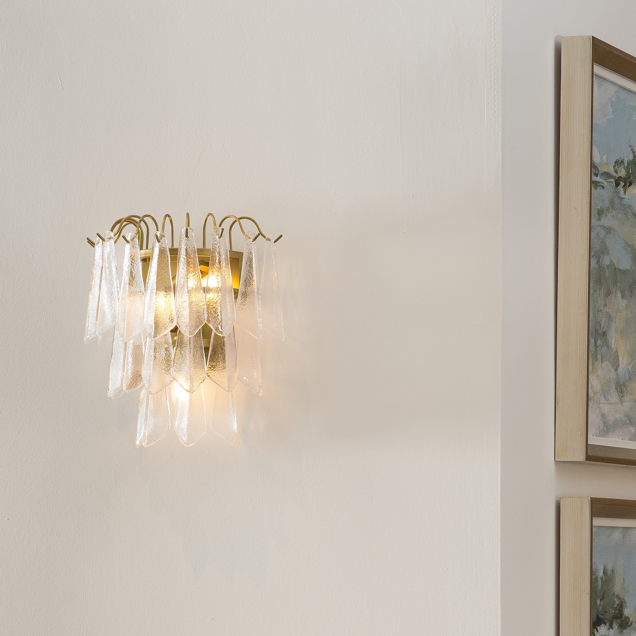 This wall lamp takes inspiration from art deco design, with cascading tiers of textured glass that add depth and dimension. Pair it with the easton collection to complete the collection.