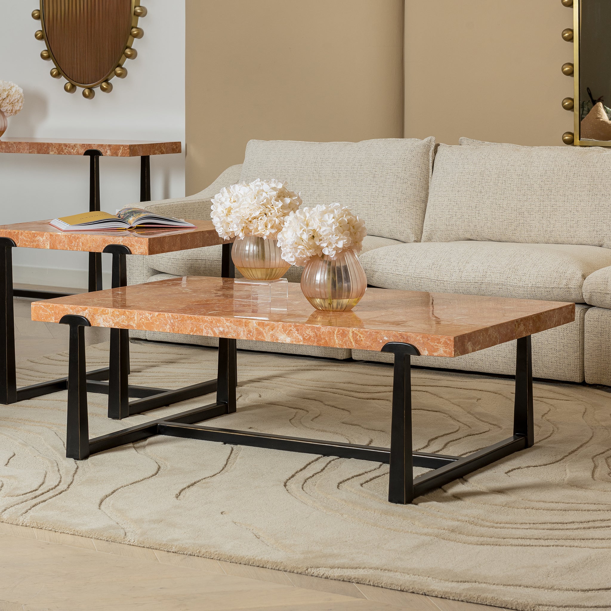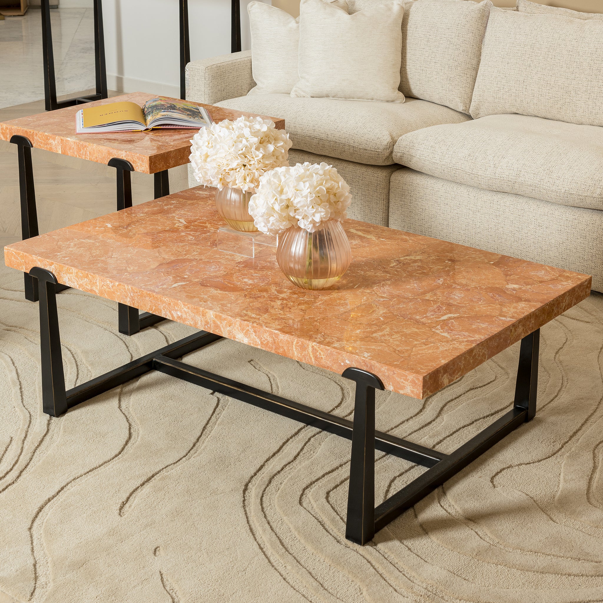 A polished salmon marble top with distinctive veining, sourced from the Philippines, brings natural richness to the design. The broad steel base in oil-rubbed bronze offers both contrast and stability. Generous in scale, it anchors the living space with a sense of enduring luxury.