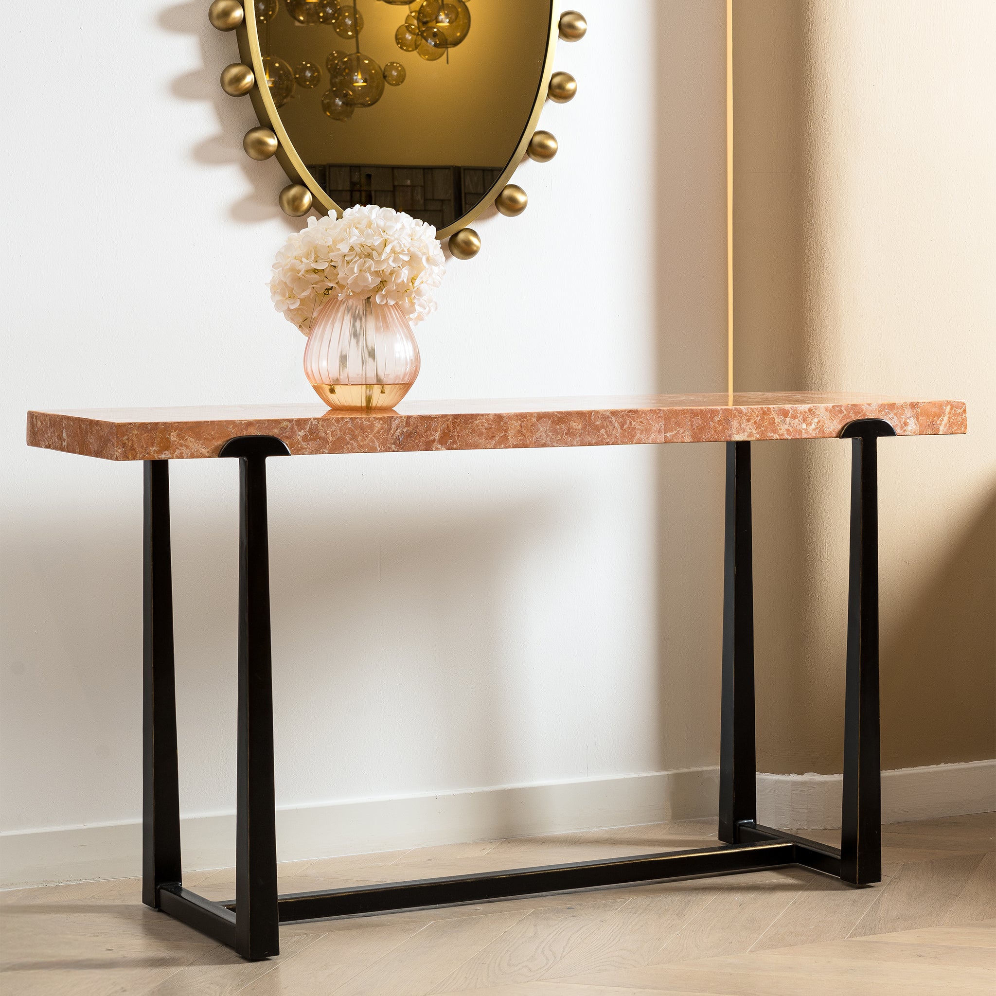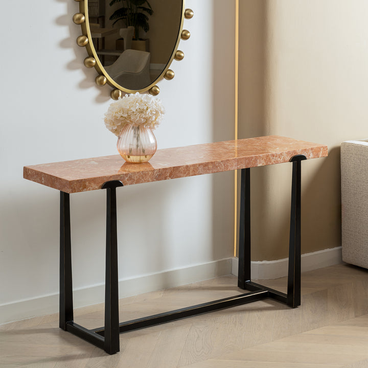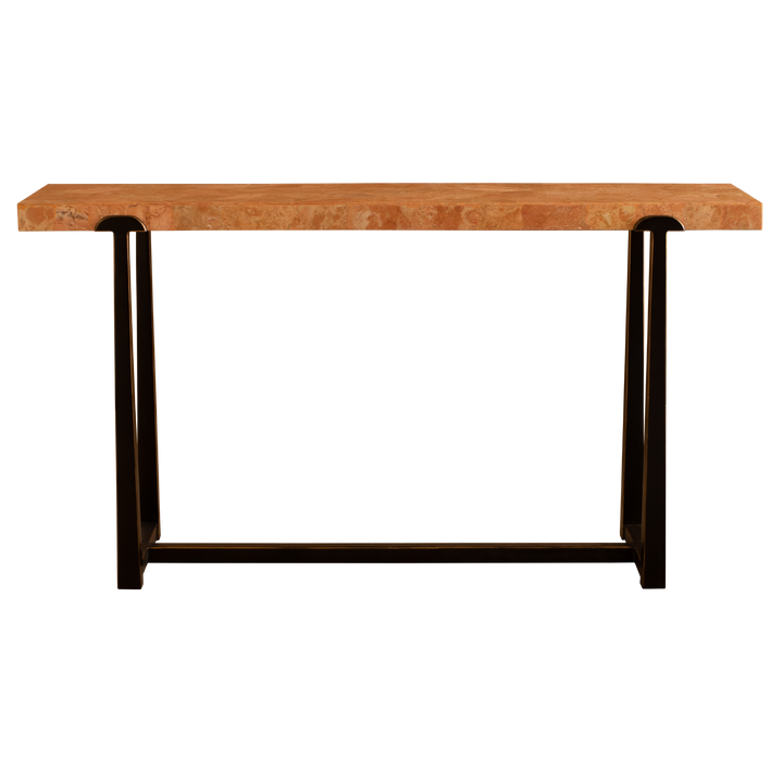 The piece features a polished salmon marble top with distinctive natural veins, sourced from the Philippines. A slender steel base in oil-rubbed bronze provides a strong yet graceful foundation. The design offers understated luxury with timeless appeal.