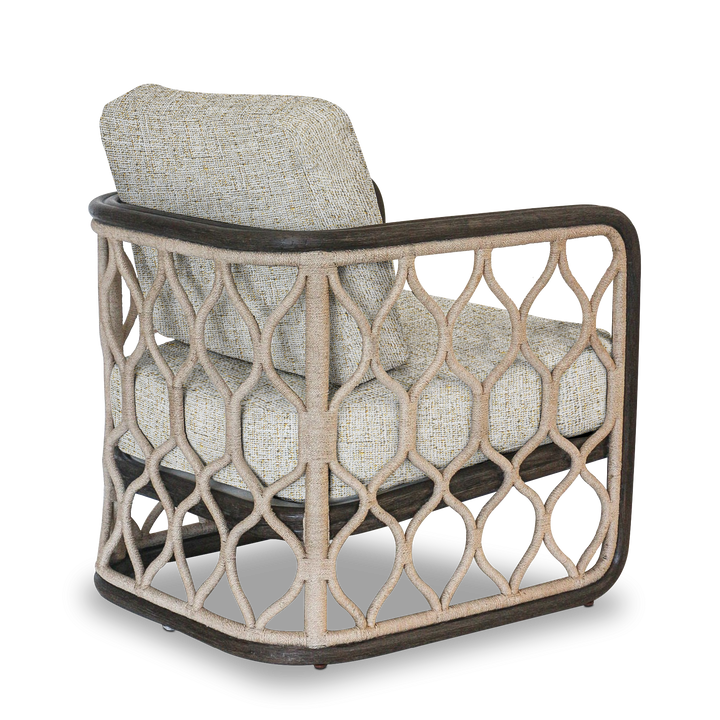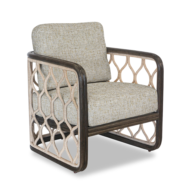 Upholstered in a chic white gold fabric. The rattan base in a matte espresso finish brings a natural charm, while the patterned frame wrapped in abaca fiber rope adds a touch of artisanal detail.