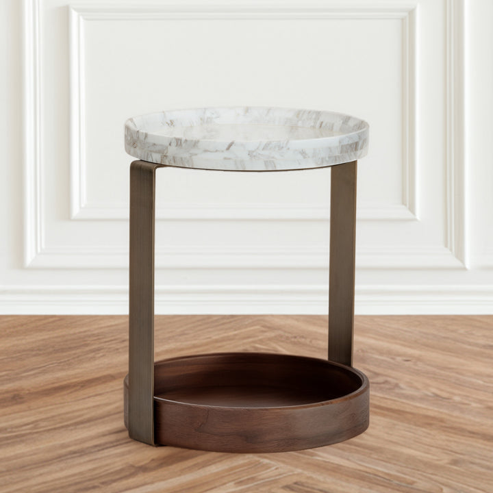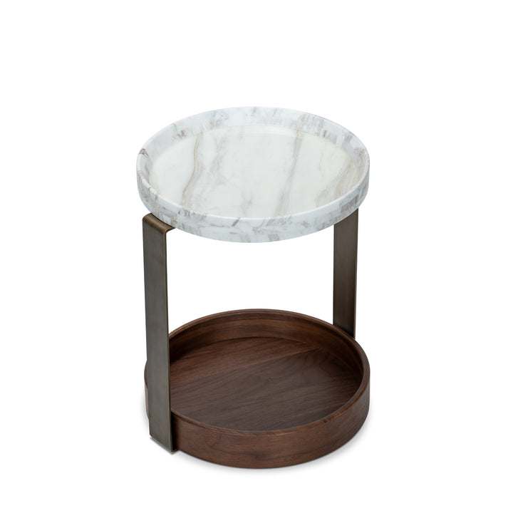 Defined by material harmony and sculptural balance, this end table pairs a white marble top with a richly grained walnut veneer base. Brushed brass accents connect its silhouette with subtle elegance.