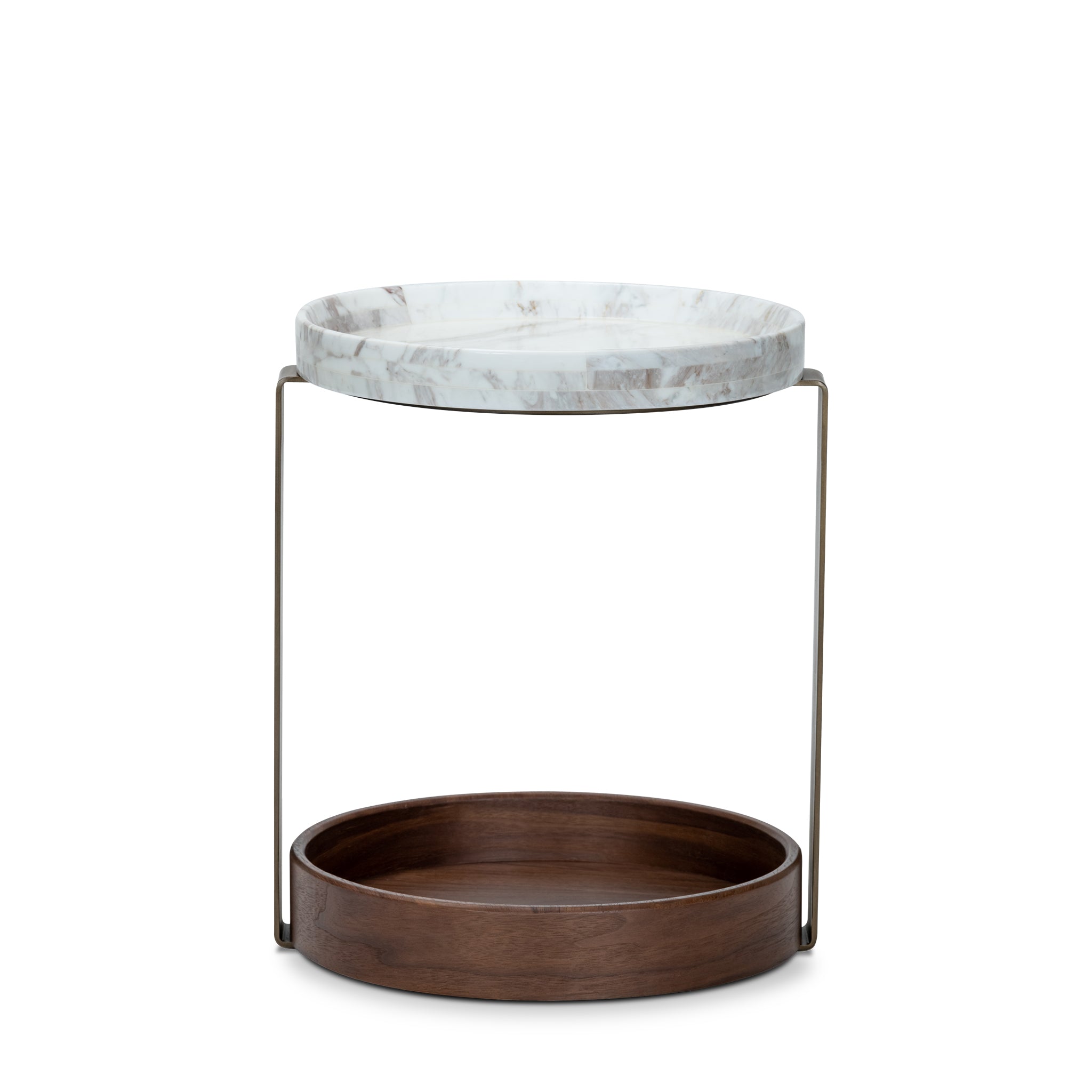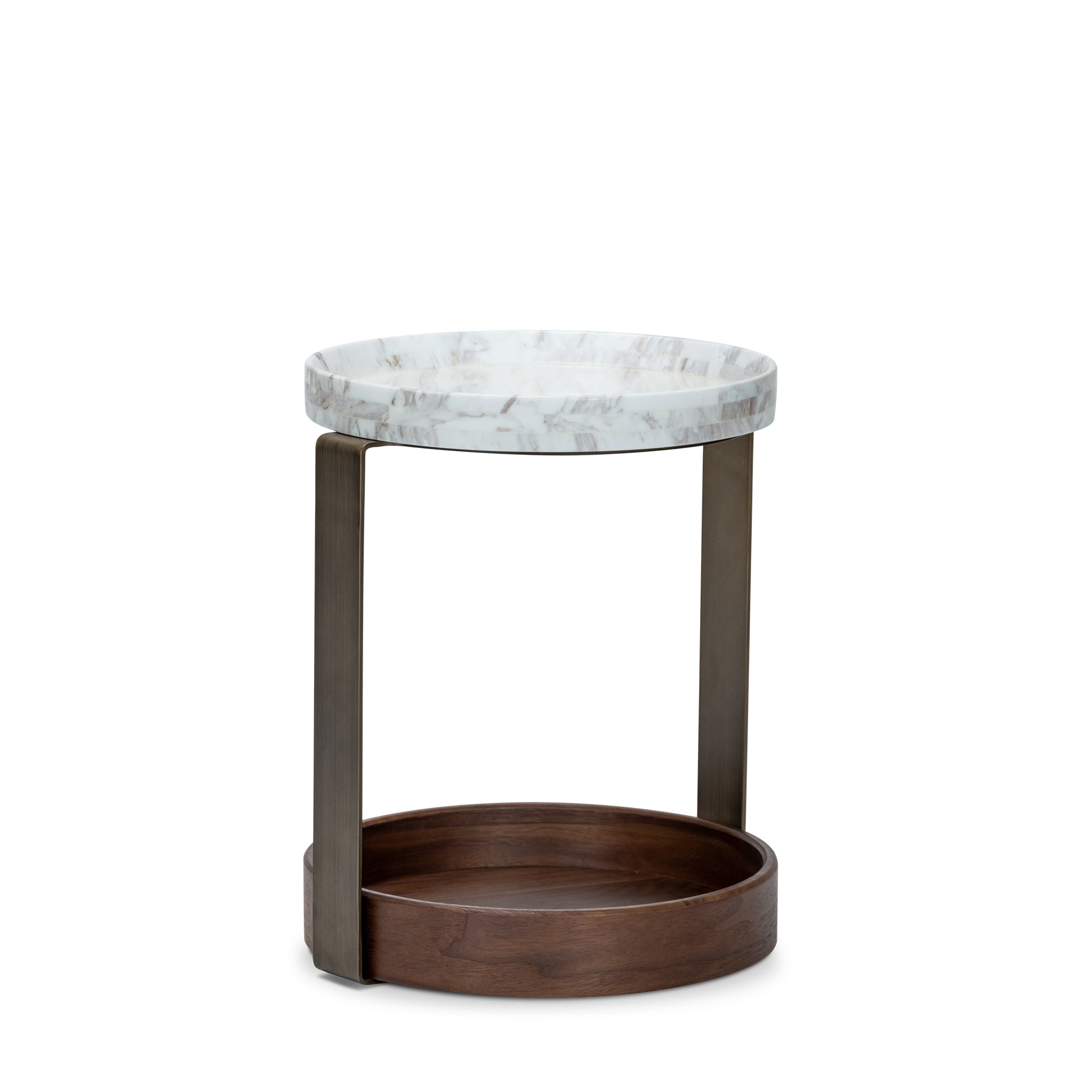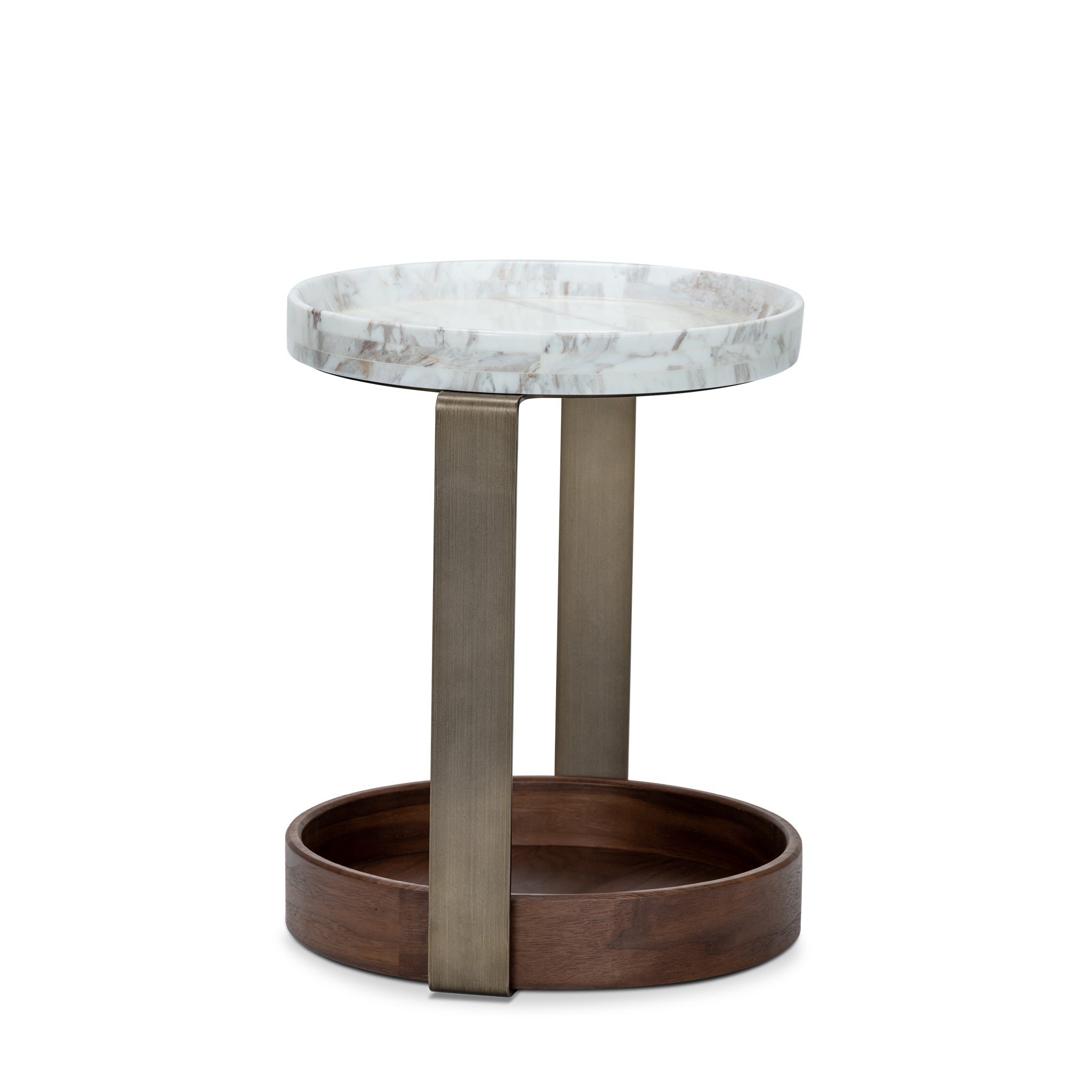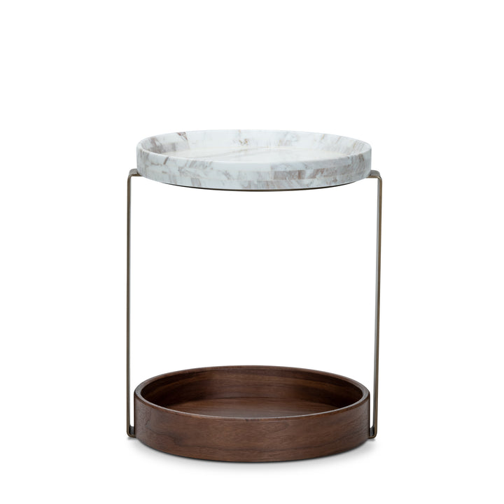 Balancing natural elegance with modern structure, this end table showcases a round white marble top, where natural veining makes each piece entirely unique. Sleek brushed brass supports seamlessly connect the marble surface to the walnut veneer base, creating a harmonious interplay of materials that elevates the design.