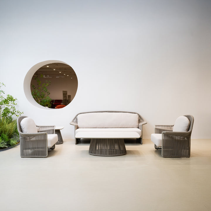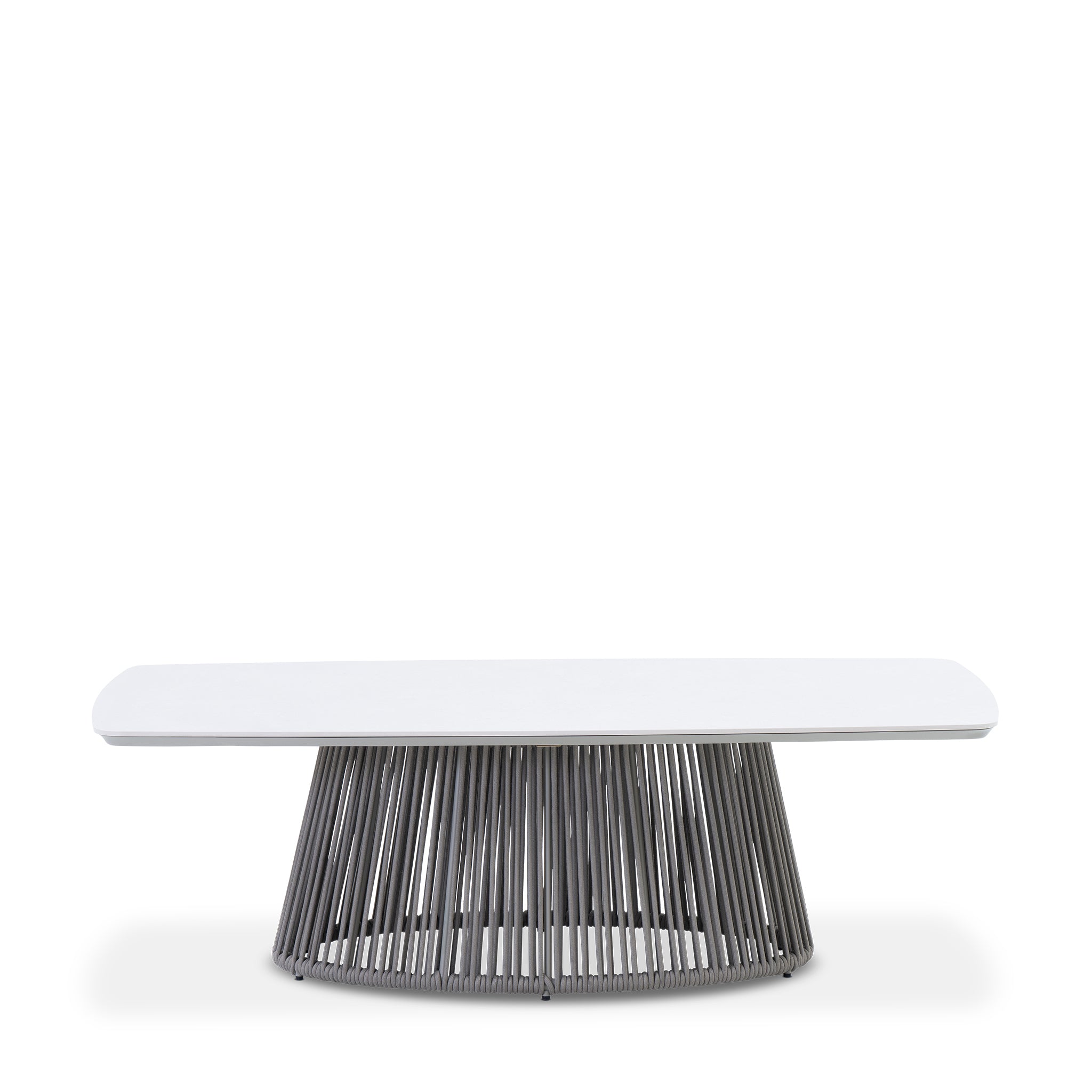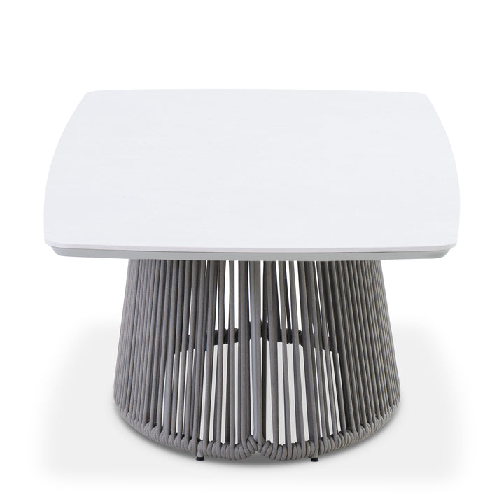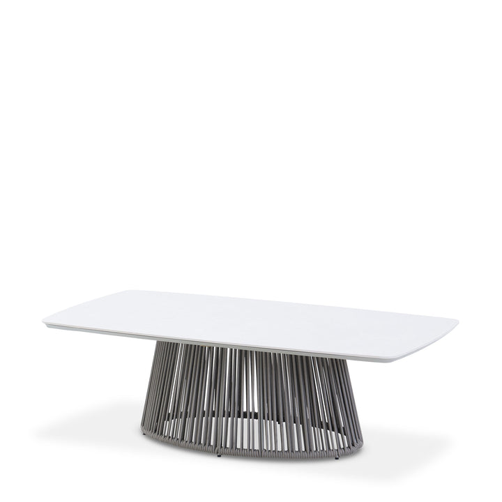 This outdoor coffee table pairs a ceramic top with a sculptural base defined by a vertical rope detailing radial rope wrap that adds structure and visual rhythm. Set on a powder-coated aluminum frame, it offers a striking contrast of material and tone that echoes the architectural presence of the embrace collection.